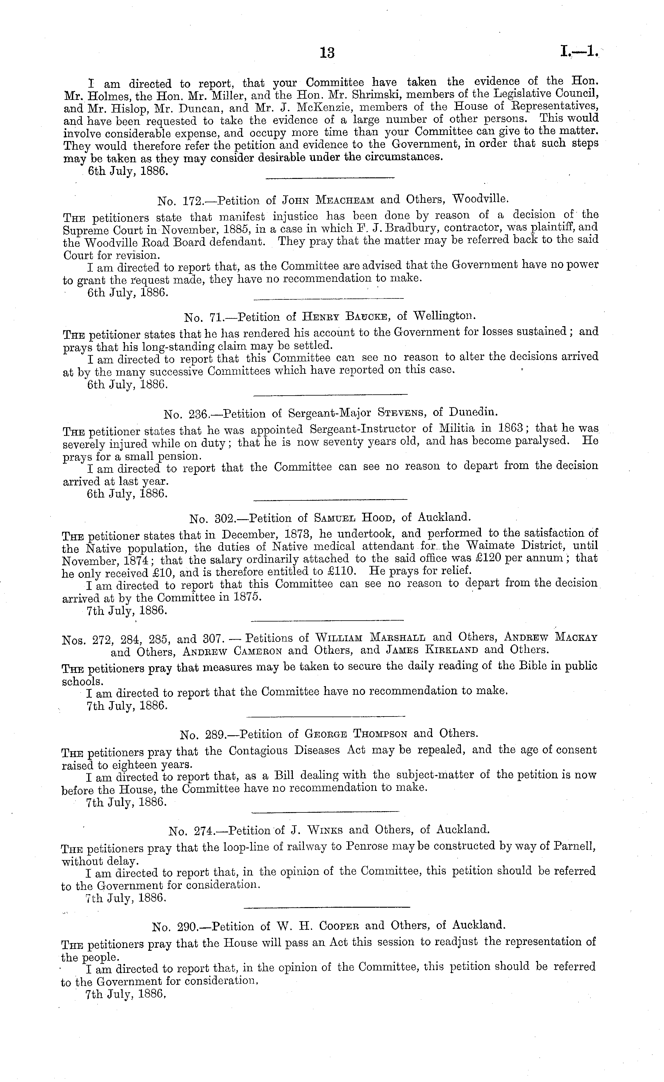 No. 290.—Petition of W. H. Cooper and Others, of Auckland. The petitioners pray that the House will pass an Act this session to readjust the representation of the people. I am directed to report that, in the opinion of the Committee, this petition should be referred to the Government for consideration, 7th July, 1886,