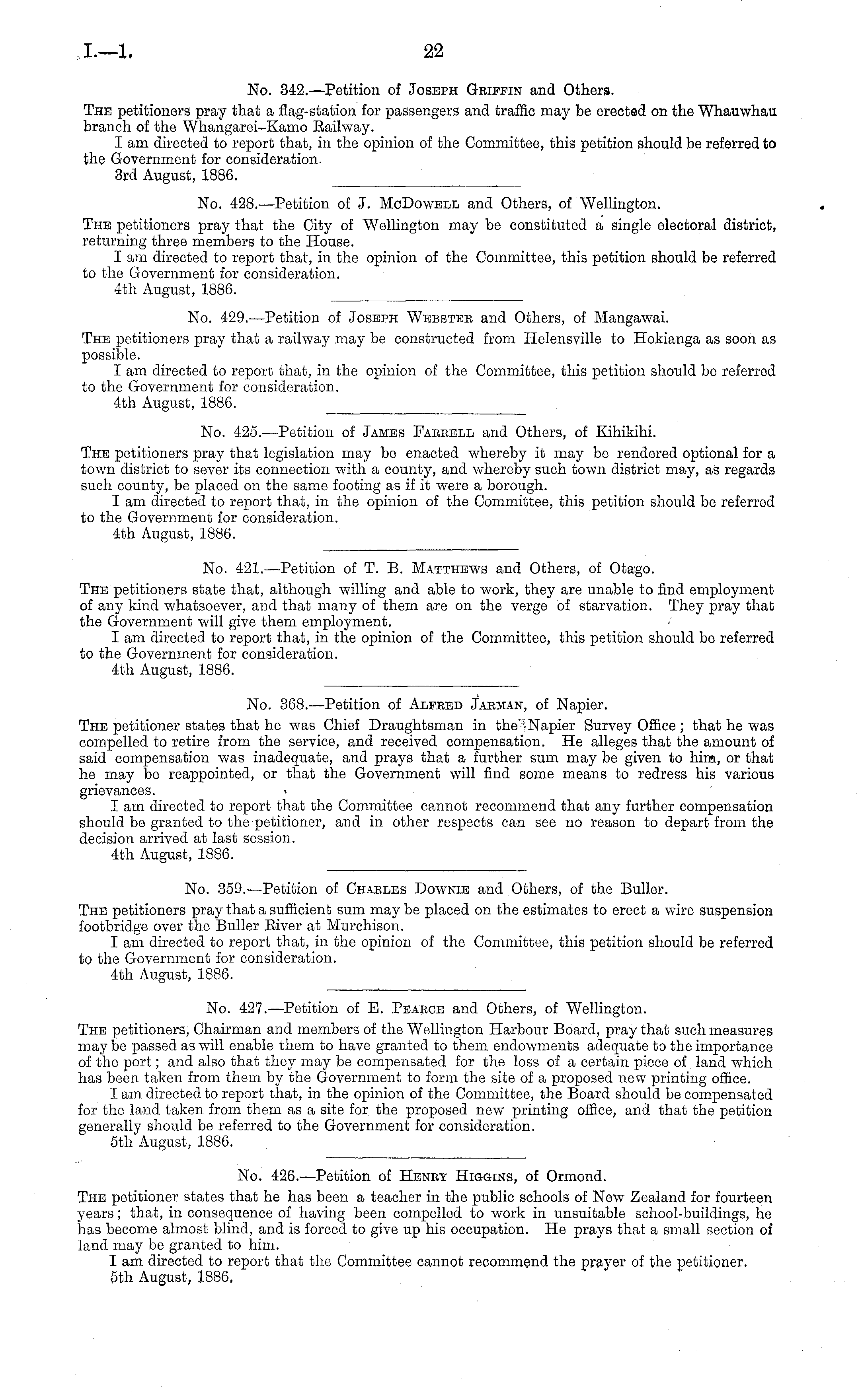 No. 428. —Petition of J. McDowell and Others, of Wellington. The petitioners pray that the City of Wellington may be constituted a single electoral district, returning three members to the House. I am directed to report that, in the opinion of the Committee, this petition should be referred to the Government for consideration. 4th August, 1886.