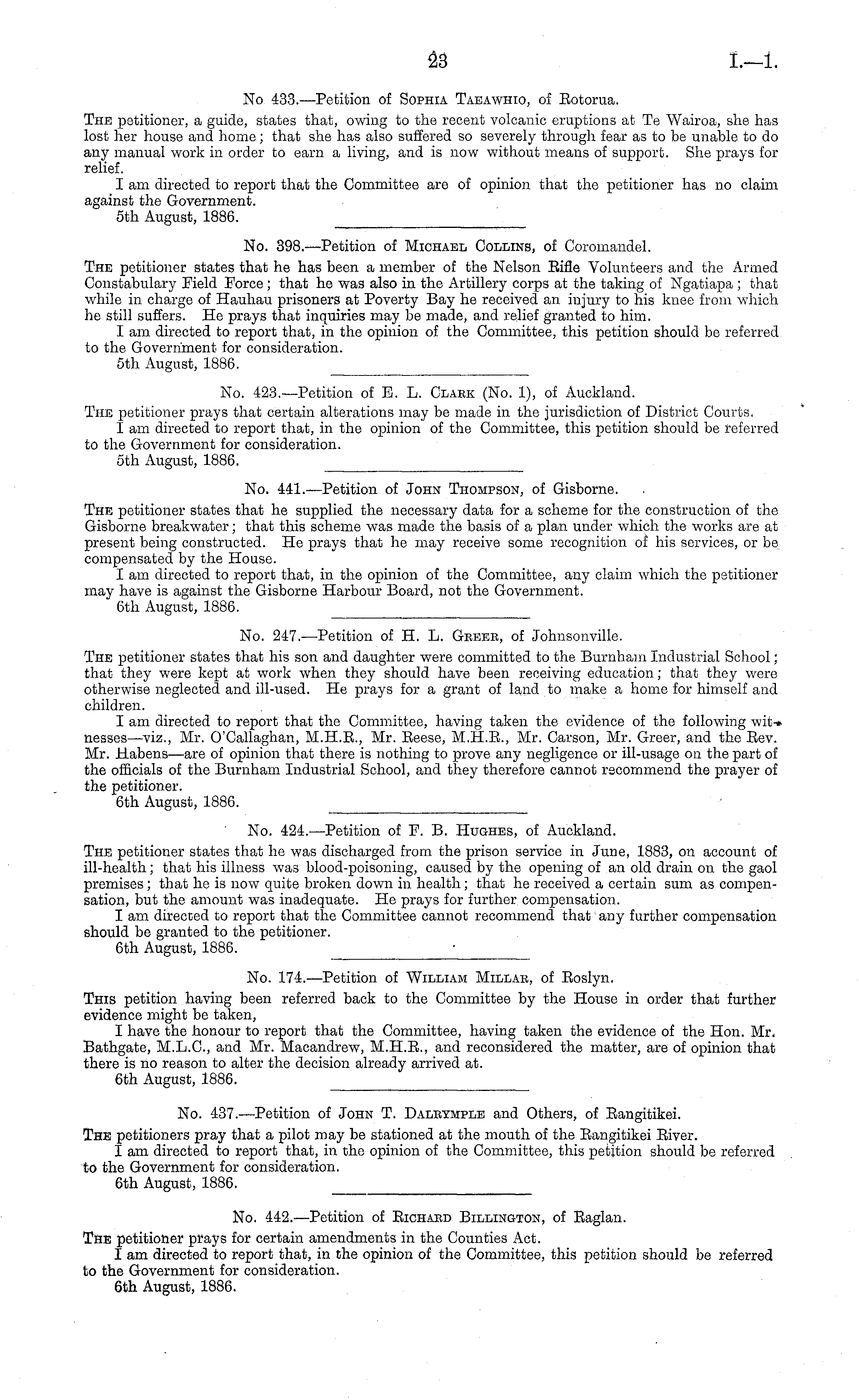 No 433. —Petition of Sophia Taeawhio, of Eotorua. The petitioner, a guide, states that, owing to the recent volcanic eruptions at Te Wairoa, she has lost her house and home; that she has also suffered so severely through fear as to be unable to do any manual work in order to earn a living, and is now without means of support. She prays for relief. I am directed to report that the Committee are of opinion that the petitioner has no claim against the Government. sth August, 1886.