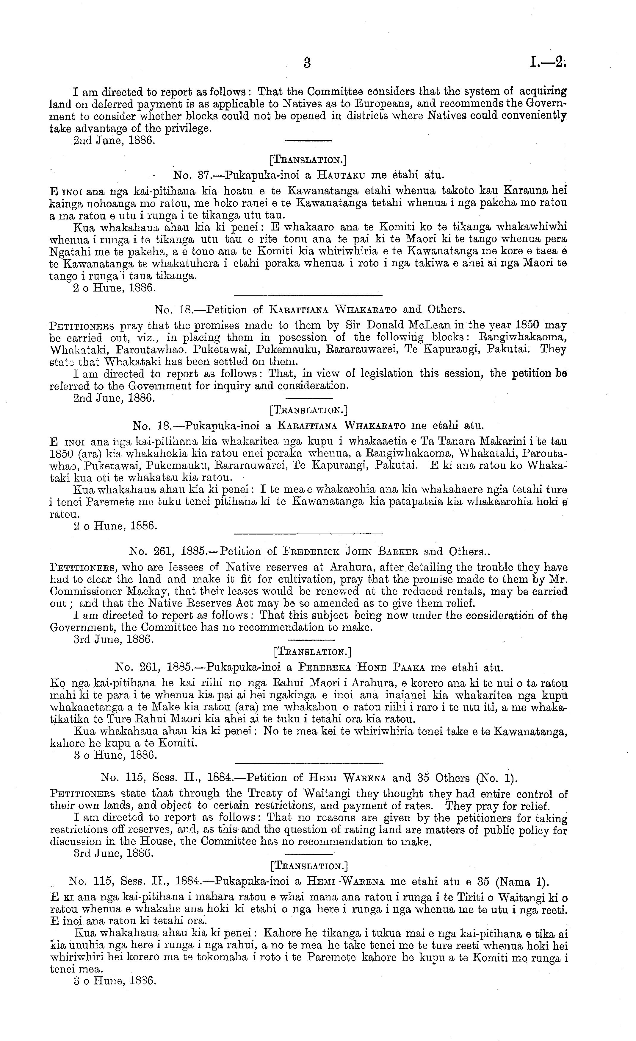 2nd June, 1886. [Translation.] No. 37.—Pukapuka-inoi a Hautaku me etahi atu. E inoi ana nga kai-pitihana kia hoatu c te Kawanatanga etahi whenua takoto kau Karauna hei kainga nohoanga mo ratou, me hoko ranei c te Kawanatanga tetahi whenua i nga pakeha mo ratou a ma ratou c utu i runga i te tikanga utu tau. Kua whakahaua ahau kia ki penei: E whakaaro ana te Komiti ko te tikanga whakawhiwhi whenua i runga i te tikanga utu tau c rite tonu ana te pai kite Maori kite tango whenua pera Ngatahi me te pakeha, a c tono ana te Komiti kia whiriwhiria c te Kawanatanga me kore c taea c te Kawanatanga te whakatuhera i etahi poraka whenua i roto i nga takiwa c ahei ai nga Maori te tango i runga i taua tikanga. 2 o Hune, 1886.