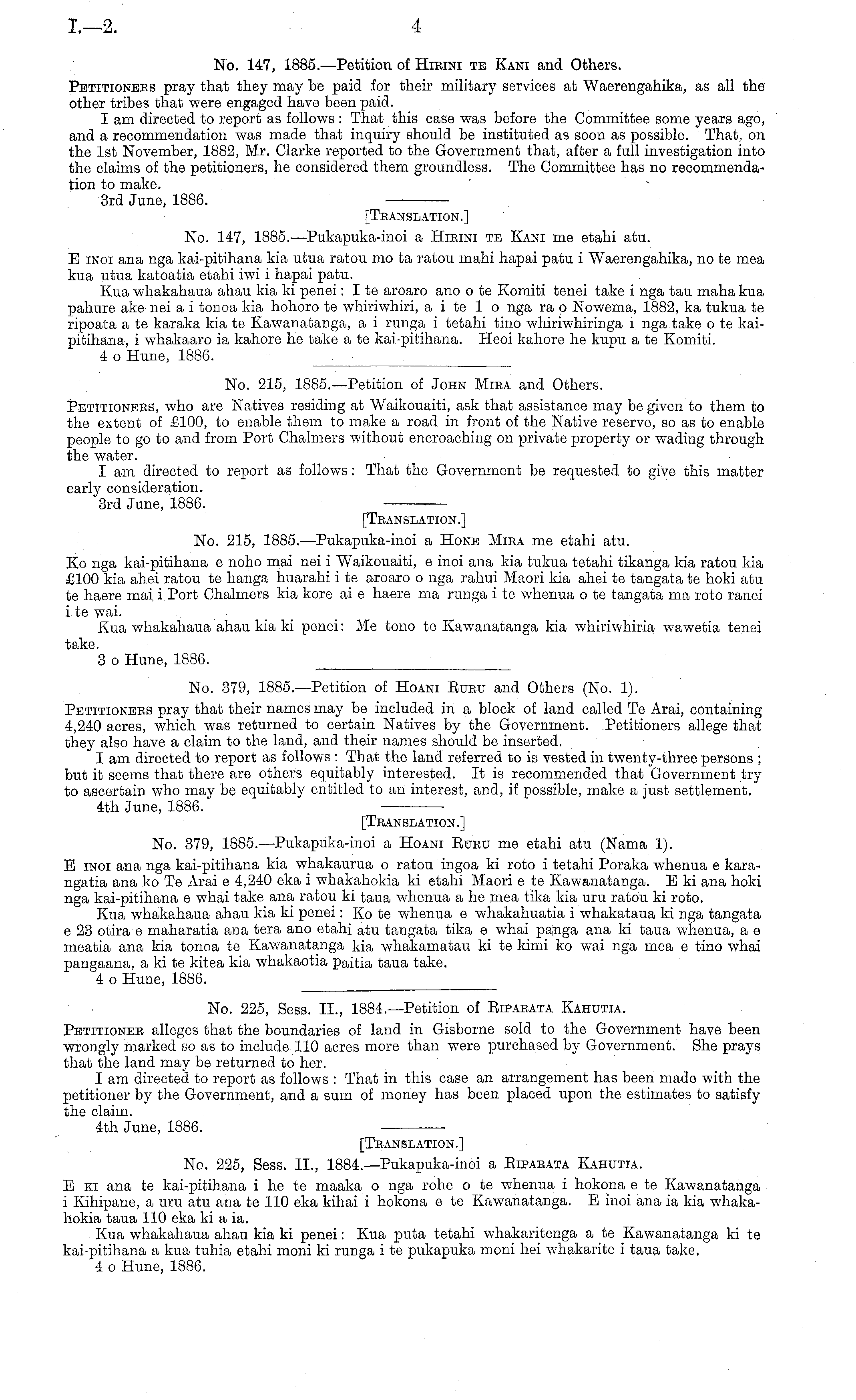 [Translation.] No. 147, 1885. —Pukapuka-inoi a Hieini te Kani me etahi atu. E inoi ana nga kai-pitihana kia utua ratou mo ta ratou mahi hapai patu i Waerengahika, no te mea kua utua katoatia etahi iwi i hapai patu. Kua whakahaua ahau kia ki penei: Ite aroaro ano ote Komiti tenei take i nga tau maha kua pahure ake nei a i tonoa kia hohoro te whiriwhiri, a i te 1 o nga ra o Nowema, 1882, ka tukua te ripoata a te karaka kia te Kawanatanga, a i runga i tetahi tino whiriwhiringa l nga take o te kaipitihana, i whakaaro ia kahore he take ate kai-pitihana. Heoi kahore he kupu ate Komiti. 4 o Hune, 1886.
