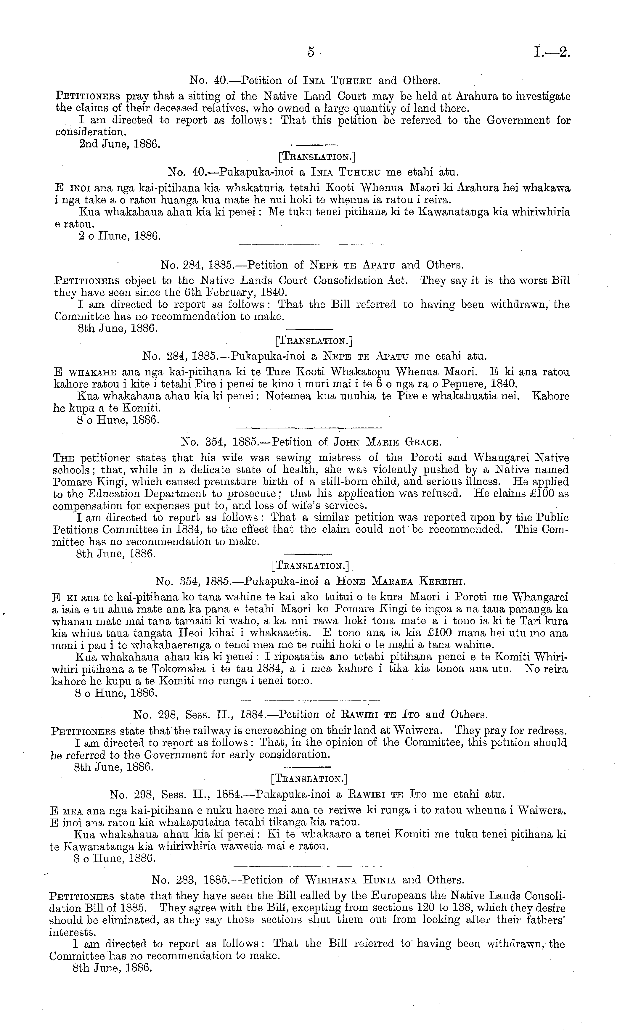 Bth June, 1886. [Translation.] No. 354, 1885. —Pukapuka-inoi a Hone Maraea Kereihi. E ki ana te kai-pitihana ko tana wahine te kai ako tuitui o te kura Maori i Poroti me Whangarei a iaia c tv ahua mate ana ka pana c tetahi Maori ko Pomare Kingi te ingoa a na taua pananga ka whanau mate mai tana tamaiti ki waho, a ka nui rawa hoki tona mate a i tono ia kite Tari kura kia whiua taua tangata Heoi kihai i whakaaetia. E tono ana ia kia £100 mana hoi utu mo ana moni i pau i te whakahaerenga o tenei mea me te ruihi hoki o te mahi a tana wahine. Kua whakahaua ahau kia ki penei: I ripoatatia ano tetahi pitihana penei etc Komiti Whiriwhiri pitihana ate Tokomaha ite tau 1884, a i mea kahore i tika kia tonoa aua utu. No reira kahore he kupu a te Komiti mo runga i tenei tono. 8 o Hune, 1886.