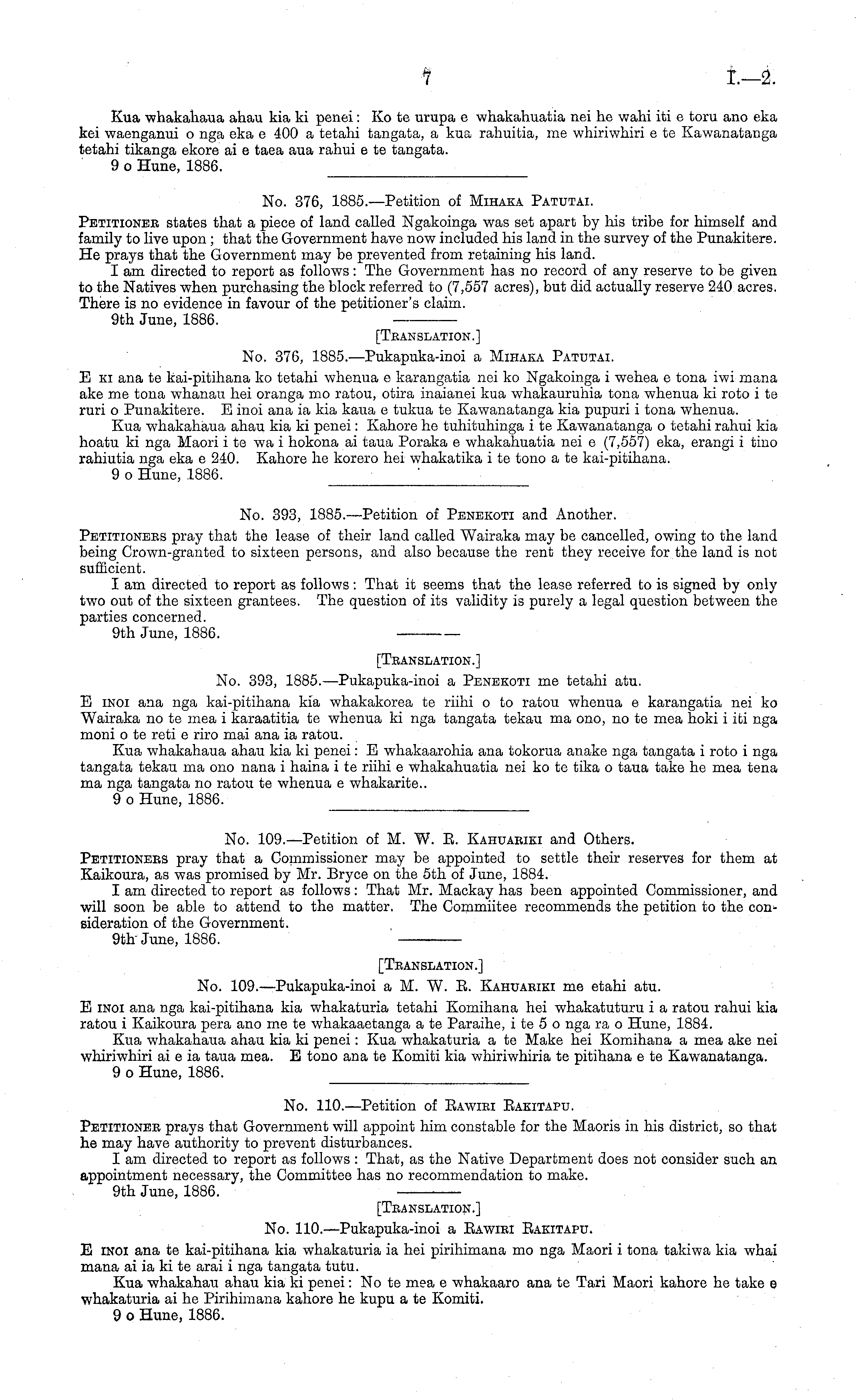 [Translation.] No. 109.—Pukapuka-inoi a M. W. E. Kahuariki me etahi atu. E inoi ana nga kai-pitihana kia whakaturia tetahi Komihana hei whakatuturu i a ratou rahui kia ratou i Kaikoura pera ano me te whakaaetanga a te Paraihe, i te 5 o nga ra o Hune, 1884. Kua whakahaua ahau kia ki penei: Kua whakaturia a te Make hei Komihana a mea ake nei whiriwhiri ai eia taua mea. E tono ana te Komiti kia whiriwhiria te pitihana etc Kawanatanga. 9 o Hune, 1886.