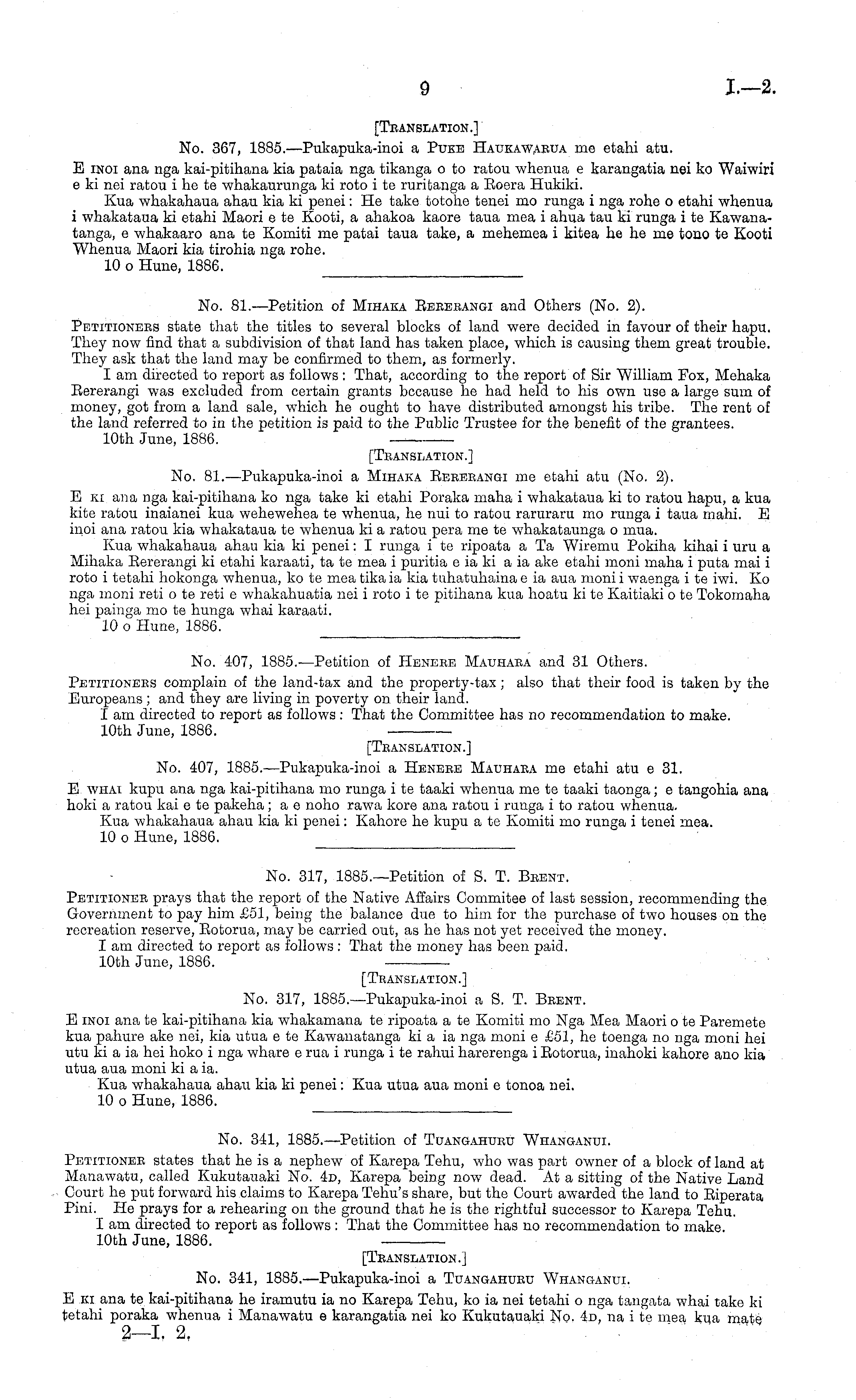 [Translation.] No. 367, 1885.—Pukapuka-inoi a Puke Haukawaeua me etahi atu. E inoi ana nga kai-pitihana kia pataia nga tikanga o to ratou whenua c karangatia nei ko Waiwiri c ki nei ratou i he te whakaurunga ki roto i te ruritanga a Eoera Hukiki. Kua whakahaua ahau kia ki penei: He take totohe tenei mo runga i nga rohe o etahi whenua i whakataua ki etahi Maori c te Kooti, a ahakoa kaore taua mea i ahua tau ki runga i te Kawanatanga, c whakaaro ana te Komiti me patai taua take, a mehemea i kitea he he me tono te Kooti Whenua Maori kia tirohia nga rohe. 10 o Hune, 1886.