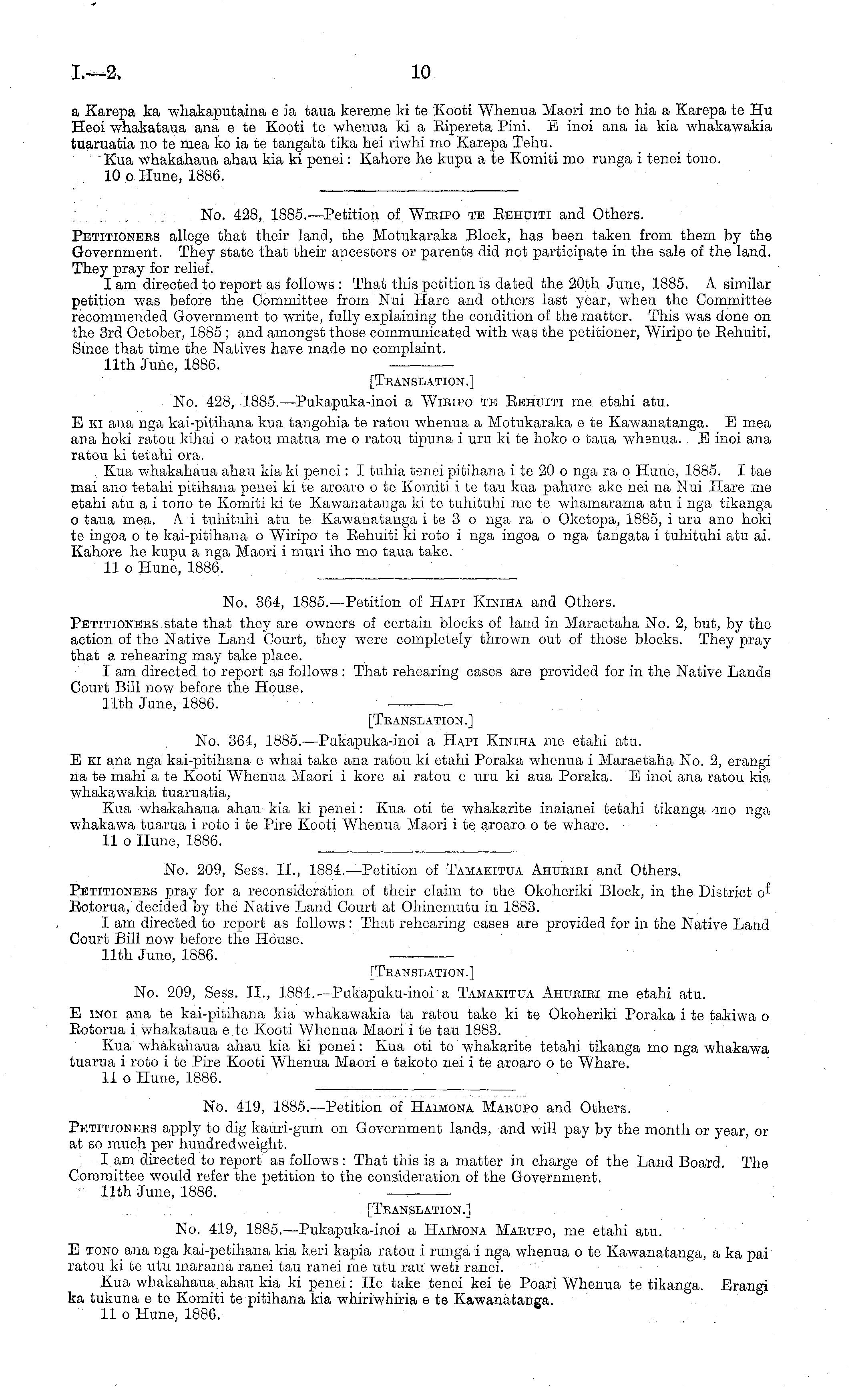 11th June, 1886. [Translation.] No. 428, 1885.—Pukapuka-inoi a Wieipo te Eehuiti me etahi atu. Eki ana nga kai-pitihana kua tangohia te ratou whenua a Motukaraka etc Kawanatanga. E mea ana hoki ratou kihai o ratou matua me o ratou tipuna i uru kite hoko o taua whsnua. E inoi ana ratou ki tetahi ora. Kua whakahaua ahau kia ki penei: I tuhia tenei pitihana ite2o o nga ra o Hune, 1885. I tae mai ano tetahi pitihana penei kite aroaro o te Komiti i te tau kua pahure ake nei na Nui Hare me etahi atu a i tono te Komiti kite Kawanatanga kite tuhituhi me te whamarama atu i nga tikanga o taua mea. A i tuhituhi atu te Kawanatanga ite 3 o nga ra o Oketopa, 1885, i uru ano hoki te ingoa o to kai-pitihana o Wiripo te Eehuiti ki roto i nga ingoa o nga tangata i tuhituhi atu ai. Kahore he kupu a nga Maori i muri iho mo taua take. 11 o Hune, 1886.