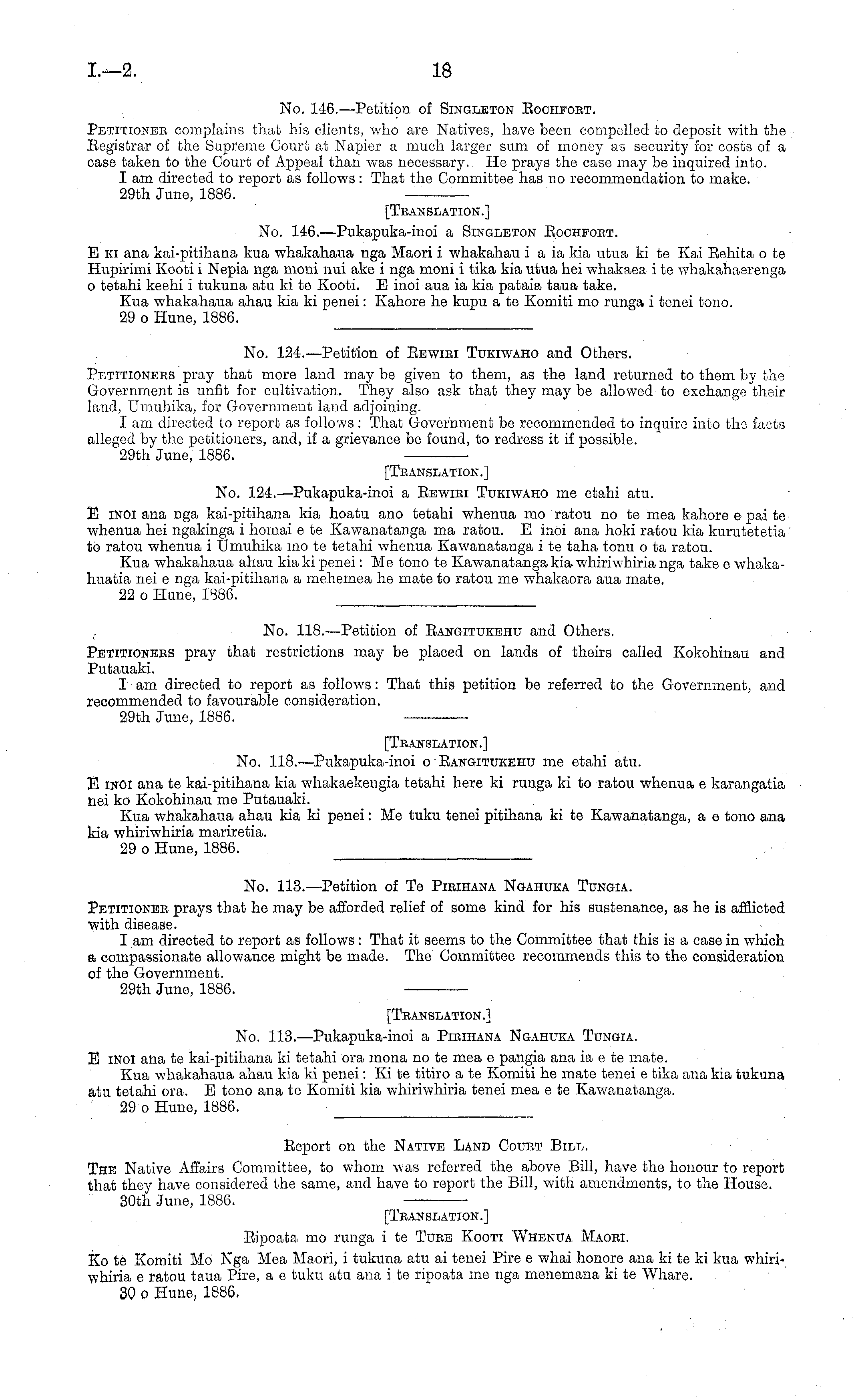 29th June, 1886. ■ [Translation.] No. 146.—Pukapuka-inoi a Singleton Eochfoet. E ki ana kai-pitihana kua whakahaua nga Maori i whakahau i a ia kia utua kite Kai Behita o te Hupirimi Kooti i Nepia nga moni nui ake i nga moni i tika kia utua hei whakaea i te whakahaerenga o tetahi keehi i tukuna atu kite Kooti. E inoi aua ia kia pataia taua take. Kua whakahaua ahau kia ki penei: Kahore he kupu ate Komiti mo runga i tenei tono. 29 o Hune, 1886.