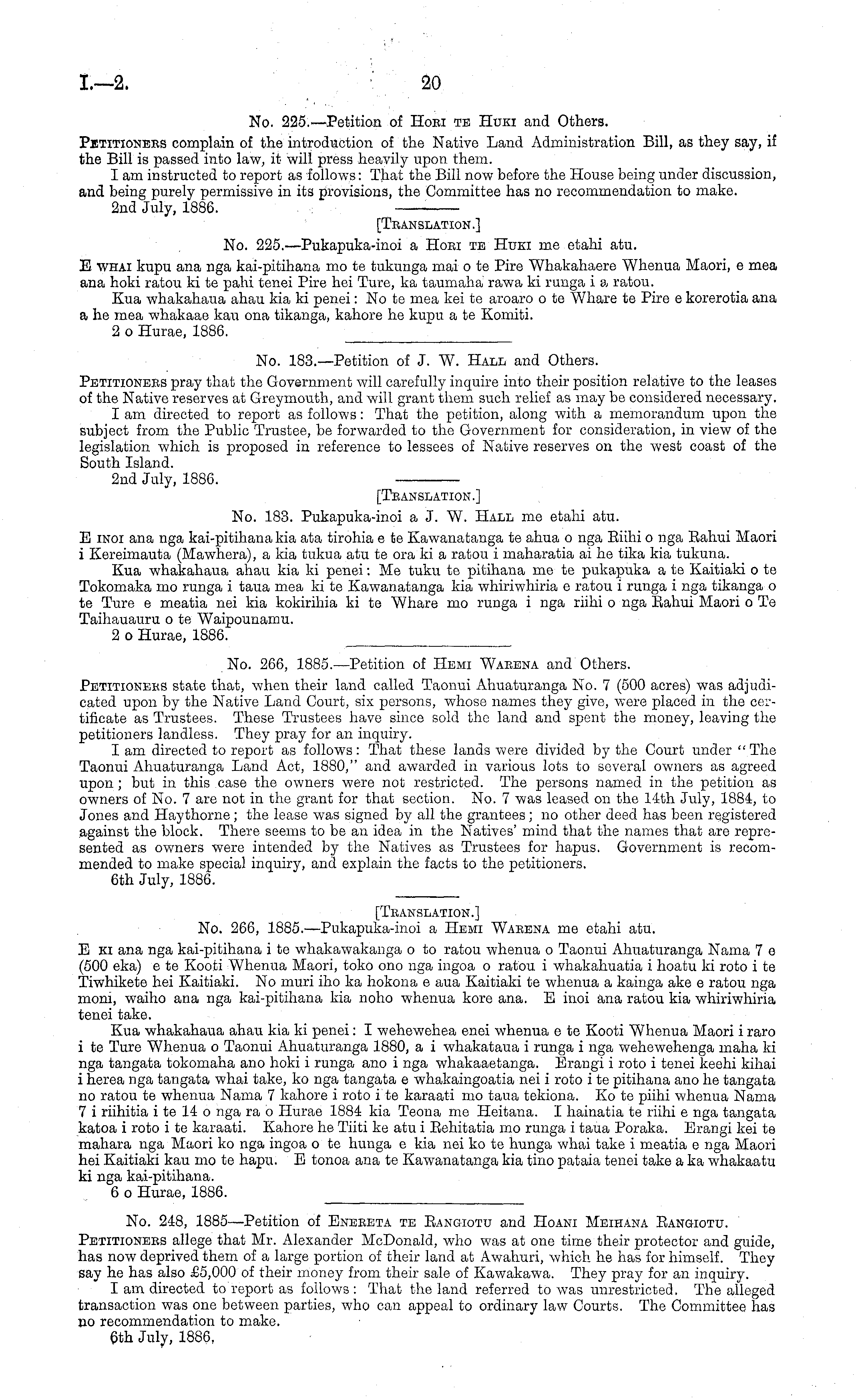 2nd July, 1886. [Translation.] No. 183. Pukapuka-inoi a J. W. Hale me etahi atu. E inoi ana nga kai-pitihana kia ata tirohia c te Kawanatanga te ahua o nga Eiihi o nga Eahui Maori i Kereimauta (Mawhera), a kia tukua atu te ora ki a ratou i maharatia ai he tika kia tukuna. Kua whakahaua ahau kia ki penei: Me tuku te pitihana me te pukapuka ate Kaitiaki ote Tokomaka mo runga i taua mea kite Kawanatanga kia whiriwhiria c ratou i runga i nga tikanga o te Ture c meatia nei kia kokirihia kite Whare mo runga i nga riihi o nga Eahui Maori o Te Taihauauru o te Waipounamu. 2 o Hurae, 1886.