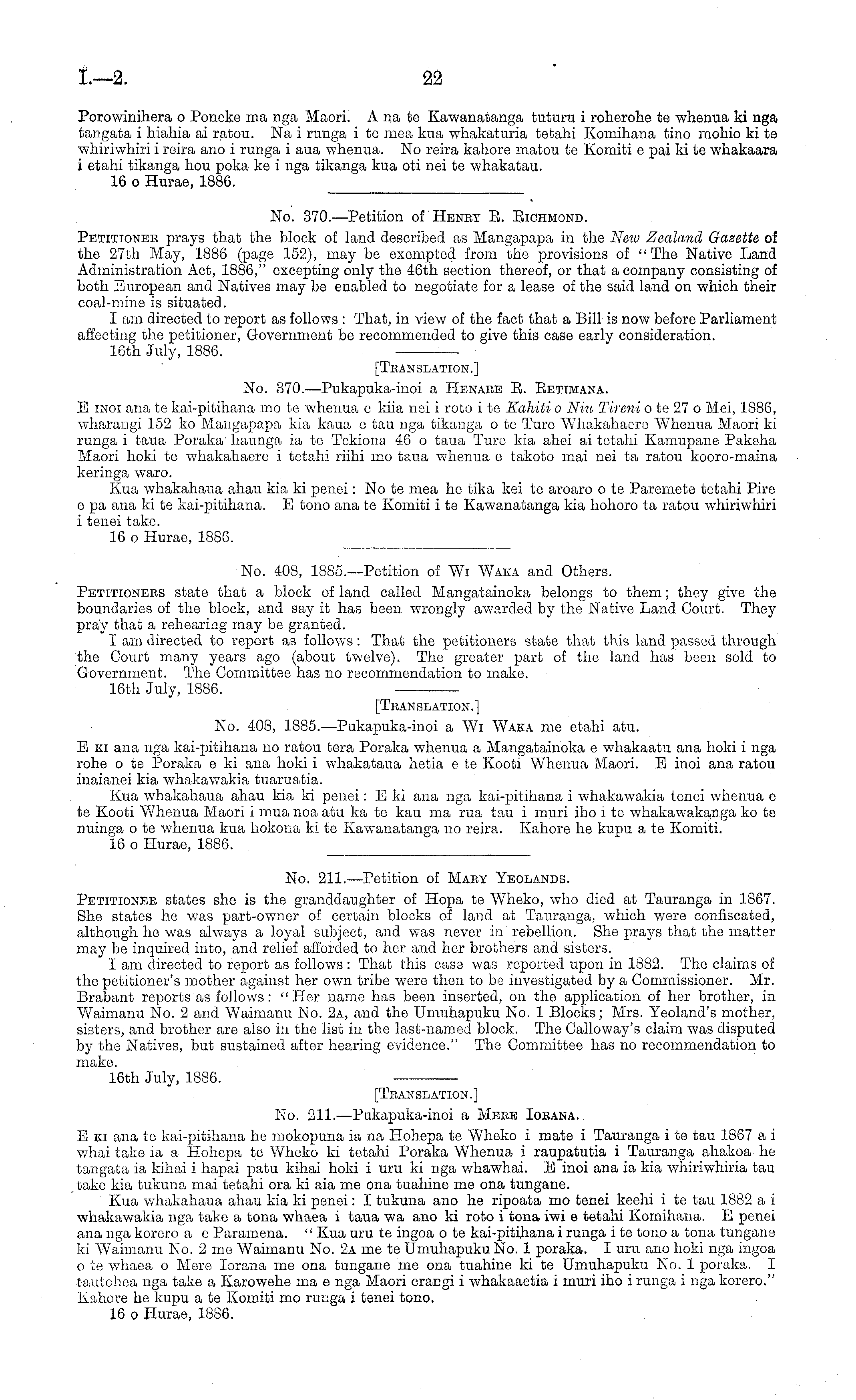 16th July, 1886. [Translation.] No. 408, 1885.—Pukapuka-inoi a Wi Waka me etahi atu. E ki ana nga kai-pitihana no ratou tera Poraka whenua a Mangatainoka c whakaatu ana hoki i nga rohe o te Poraka c ki ana hoki i whakataua hetia etc Kooti Whenua Maori. E inoi ana ratou inaianei kia whakawakia tuaruatia. Kua whakahaua ahau kia ki penei: Eki ana nga kai-pitihana i whakawakia tenei whenua c te Kooti Whenua Maori i mua noa atu kate kau ma rua tau i muri iho i te whakawakanga ko te nuinga ote whenua kua hokona kite Kawanatanga no reira. Kahore he kupu ate Komiti. 16 o Hurae, 1886.