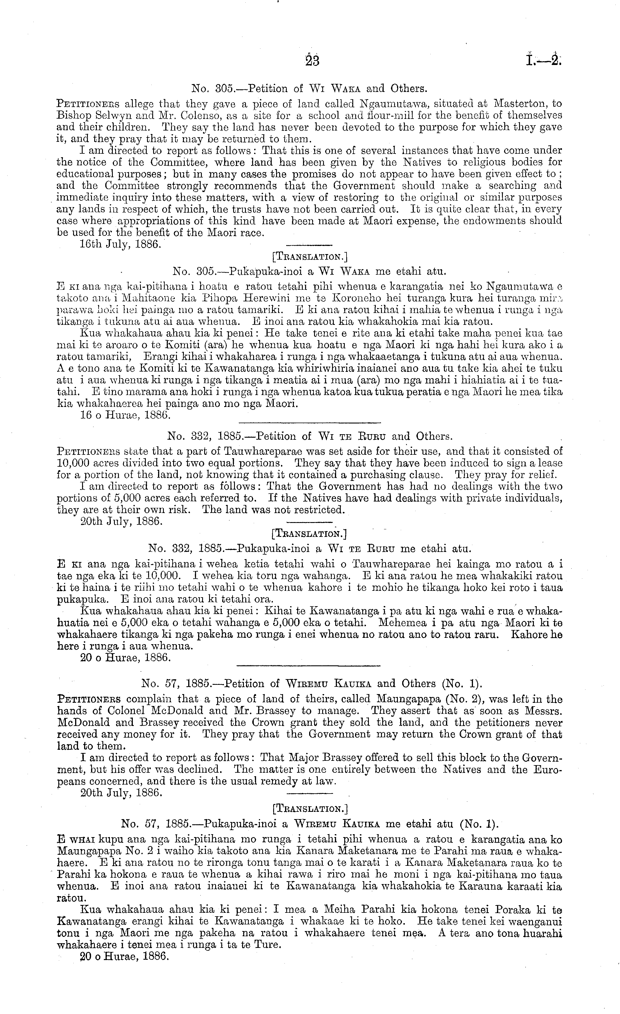 20th July, 1886. — — [Translation.] No. 57, 1885.—Pukapuka-inoi a Wiremu Kauika me etahi atu (No. 1). E whai kupu ana nga kai-pitihana mo runga i tetahi pihi whenua a ratou c karangatia ana ko Maungapapa No. 2 i waiho kia takoto ana kia Kanara Maketanara me te Parahi ma raua c whakahaere. Eki ana ratou no te rironga tonu tanga mai ote karati i a Kanara Maketanara raua ko te Parahi ka hokona c raua te whenua a kihai rawa i riro mai he moni i nga kai-pitihana mo taua whenua. E inoi ana ratou inaianei kite Kawanatanga kia whakahokia te Karauna karaati kia ratou. Kua whakahaua ahau kia ki penei: I mea a Meiha Parahi kia hokona tenei Poraka kite Kawanatanga erangi kihai te Kawanatanga i whakaae kite hoko. He take tenei kei waenganui tonu i nga Maori me nga pakeha na ratou i whakahaere tenei mea. A tera ano tona huarahi whakahaere i tenei mea i runga i ta te Ture. 20 o Hurae, 1886.
