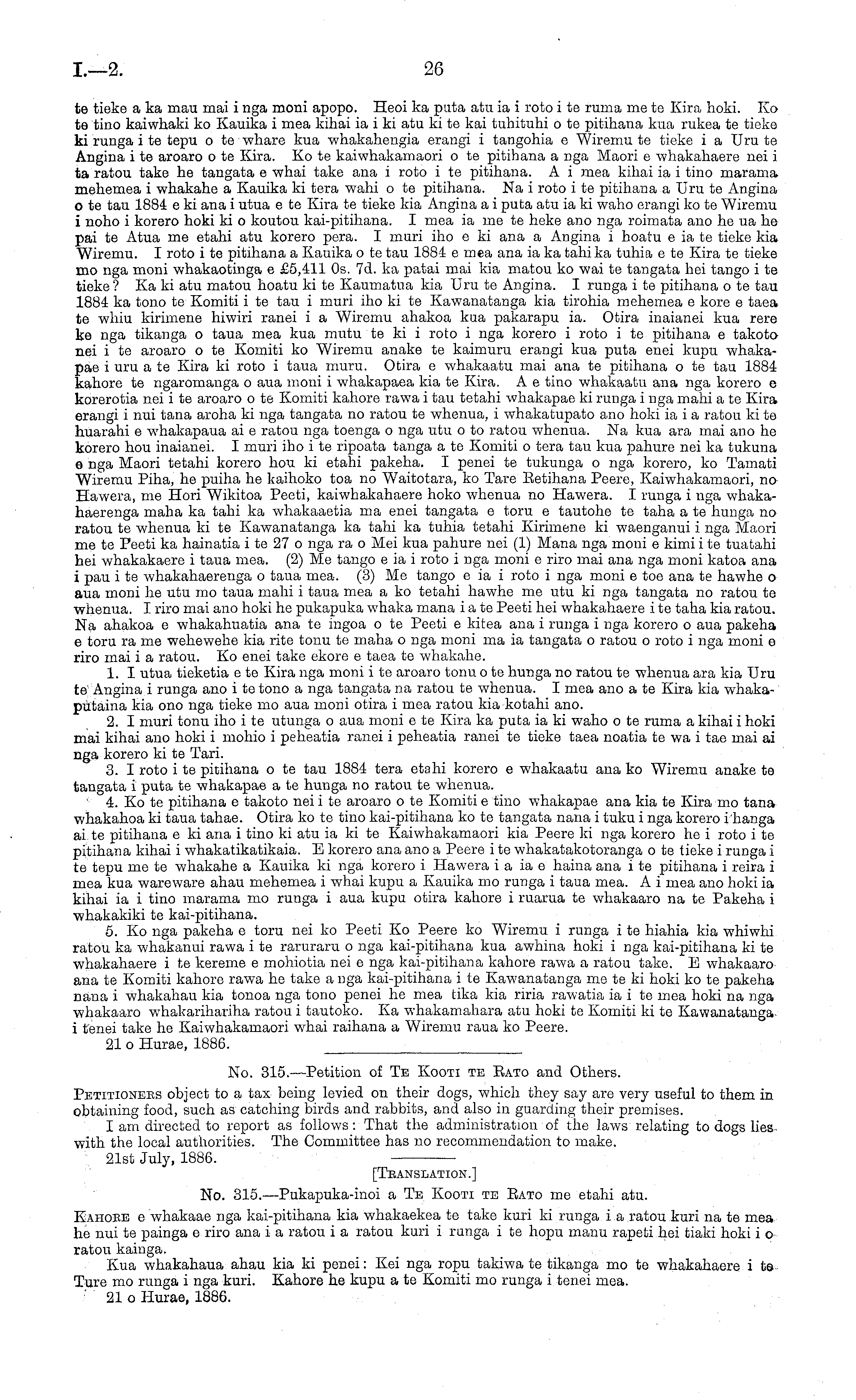 21st July, 1886. [Translation.] No. 315. —Pukapuka-inoi a Te Kooti te Eato me etahi atu. Kahore c whakaae nga kai-pitihana kia whakaekea te take kuri ki runga ia ratou kuri na te mea he nui te painga c riro ana i a ratou i a ratou kuri i runga i te hopu maim rapeti hei tiaki hoki i o ratou kainga. Kua whakahaua ahau kia ki penei: Kei nga ropu takiwa te tikanga mo te whakahaere i te. Ture mo runga i nga kuri. Kahore he kupu ate Komiti mo runga i tenei mea. 21 o Hurae, 1886.