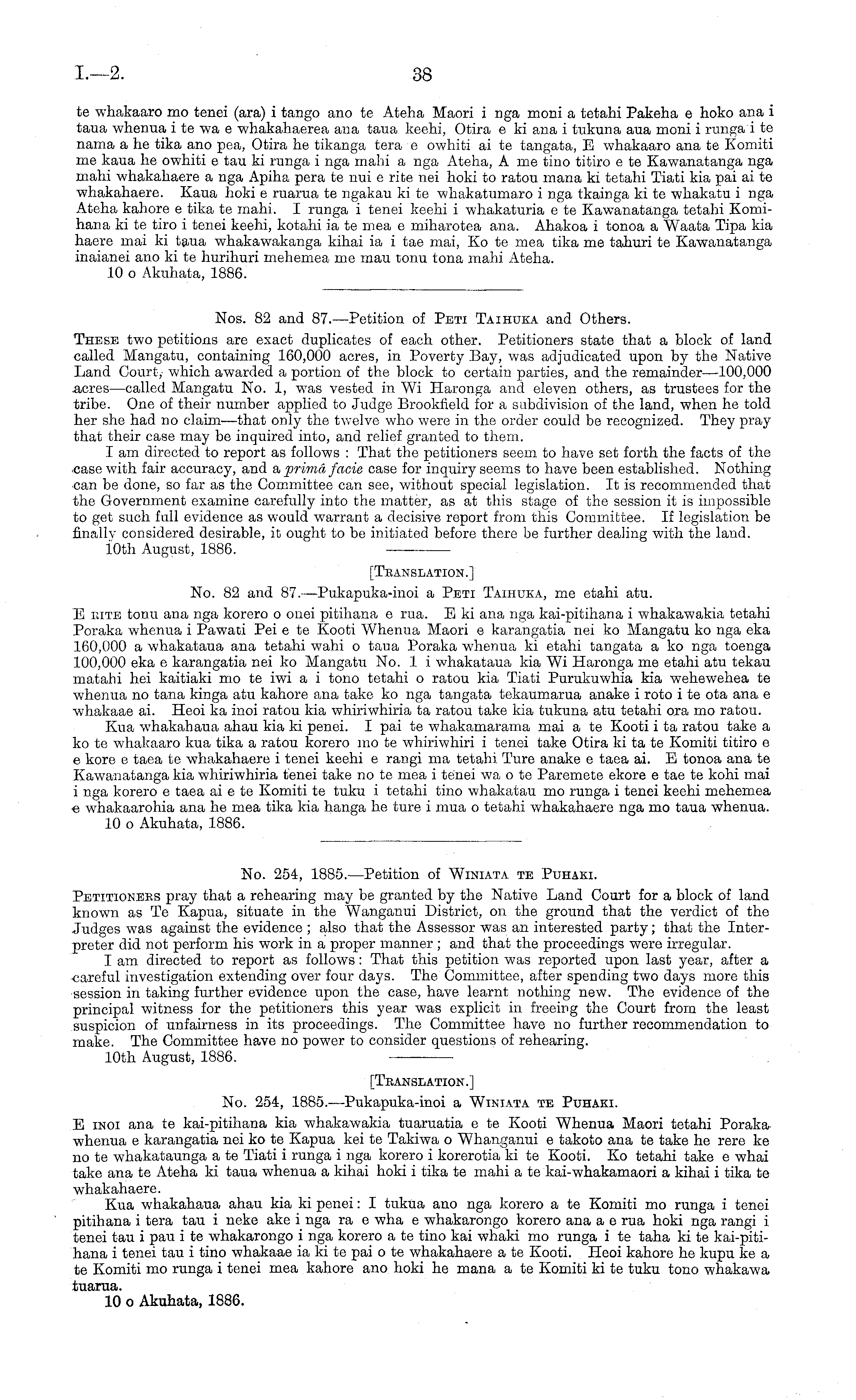 10th August, 1886. [Translation.] No. 254, 1885.—Pukapuka-inoi a Winiata te Puhaki. E inoi ana te kai-pitihana kia whakawakia tuaruatia c te Kooti Whenua Maori tetahi Poraka whenua c karangatia nei ko te Kapua kei te Takiwa o Whanganui c takoto ana te take he rere ke no te whakataunga ate Tiati i runga i nga korero i korerotia kite Kooti. Ko tetahi take c whai take ana te Ateha ki taua whenua a kihai hoki i tika te mahi a te kai-whakamaori a kihai i tika te whakahaere. Kua whakahaua ahau kia ki penei: I tukua ano nga korero a te Komiti mo runga i tenei pitihana i tera tau i neke ake i nga ra c wha c whakarongo korero ana a c rua hoki nga rangi i tenei tau i pau i te whakarongo i nga korero a te tino kai wbaki mo runga i te taha kite kai-piti-hana i tenei tau i tino whakaae ia kite pai ote whakahaere ate Kooti. Heoi kahore he kupu ke a te Komiti mo runga i tenei mea kahore ano hoki he mana a te Komiti kite tuku tono whakawa tuarua. 10 o Akuhata, 1886.