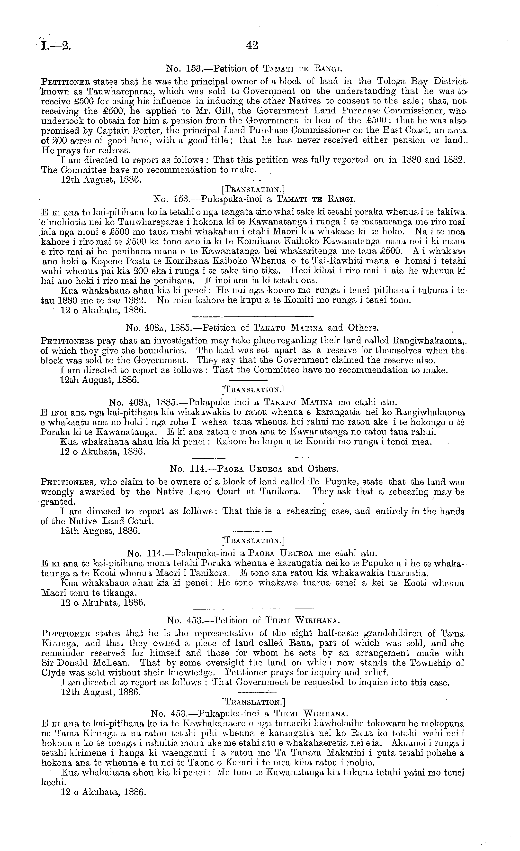 [Translation.] No. 153.—Pukapuka-inoi a Tamati te Bangi. E ki ana te kai-pitihana ko ia tetahi o nga tangata tino whai take ki tetahi poraka whenua i te takiwa c mohiotia nei ko Tauwhareparae i hokona kite Kawanatanga i runga i te matauranga me riro mai iaia nga moni c £500 mo tana mahi whakahau i etahi Maori kia whakaae kite hoko. Na ite mea kahore i riro mai te £500 ka tono ano ia kite Komihana Kaihoko Kawanatanga nana nei i ki mana c riro mai ai he penihana mana c te Kawanatanga hei whakaritenga mo taua £500. A i whakaae ano hoki a Kapene Poata te Komihana Kaihoko Whenua o te Tai-Bawhiti mana c homai i tetahi wahi whenua pai kia 200 eka i runga ite take tino tika. Heoi kihai i riro mai i aia he whenua ki hai ano hoki i riro mai he penihana. E inoi ana ia ki tetahi ora. Kua whakahaua ahau kia ki penei: He nui nga korero mo runga i tenei pitihana i tukuna ite tau 1880 me te tsu 1882. No reira kahore he kupu ate Komiti mo runga i tenei tono. 12 o Akuhata, 1886.