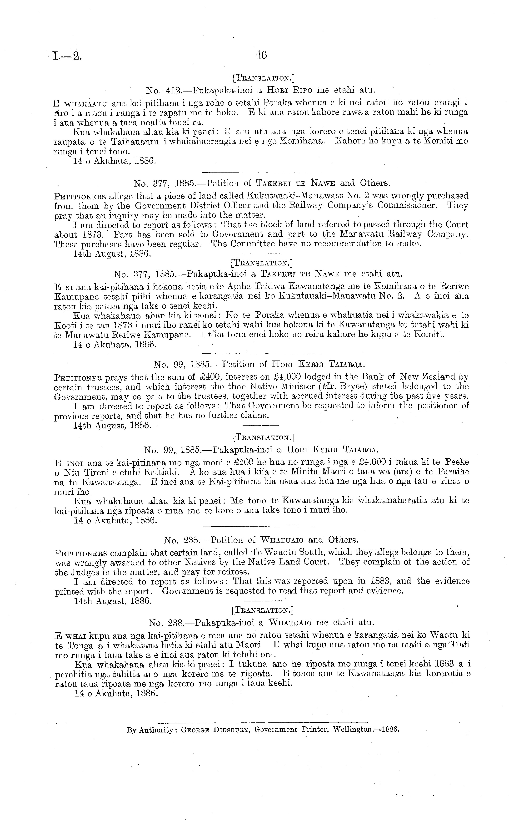 [Translation.] No. 238. —Pukapuka-inoi a Whatuaio me etahi atu. E whai kupu ana nga kai-pitihana c mea ana no ratou tetahi whenua c karangatia nei ko W T aotu ki te Tonga a i whakataua hetia ki etahi atu Maori. E whai kupu ana ratou mo na mahi a nga Tiati mo runga i taua take a c inoi aua ratou ki tetahi ora. Kua whakahaua ahau kia ki penei: I tukuna ano he ripoata mo runga i tenei keehi 1883 a i perehitia nga tahitia ano nga korero me te ripoata. E tonoa ana te Kawanatanga kia korerotia c ratou taua ripoata me nga korero mo runga i taua keehi. 14 o Akuhata, 1886.