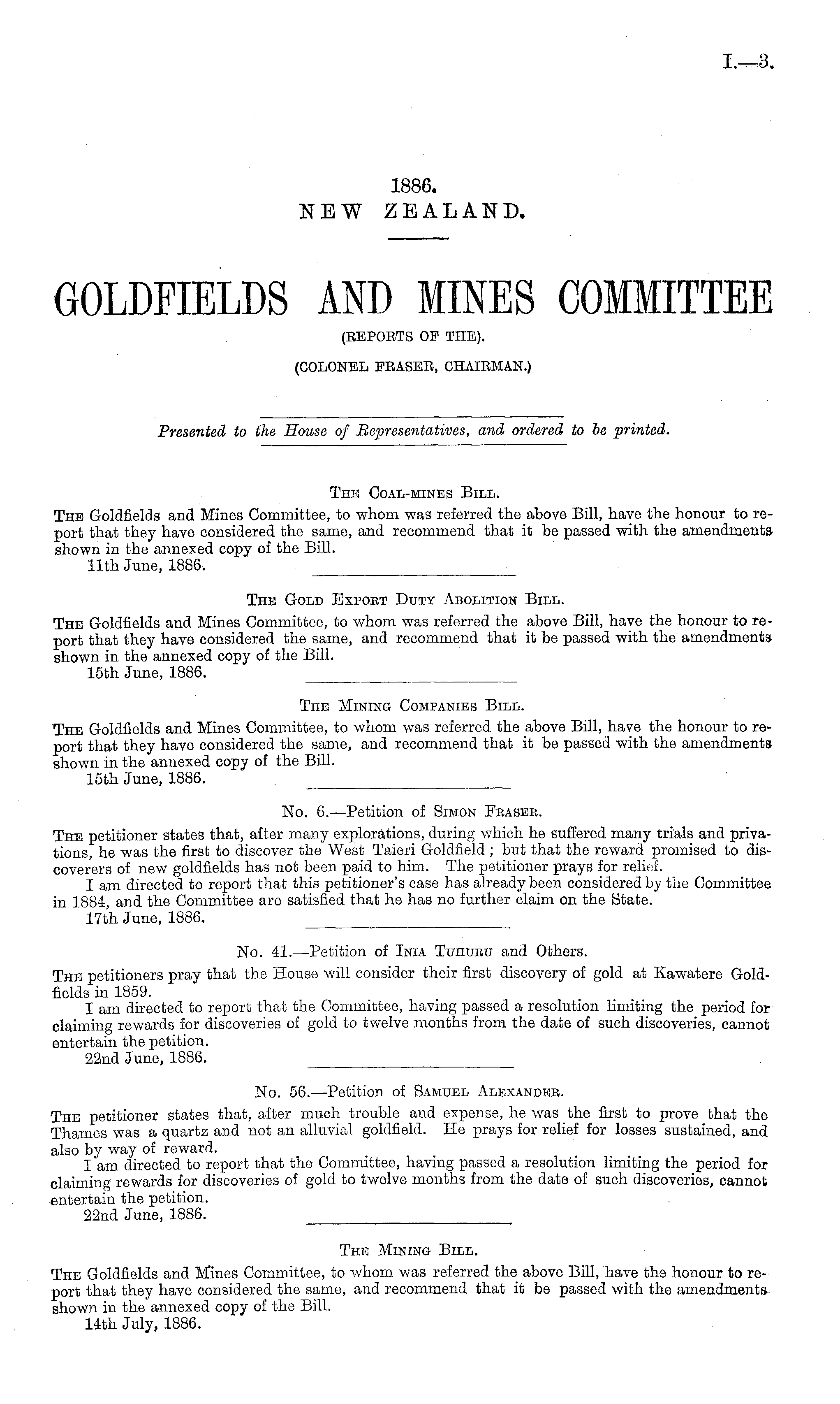The Coal-mines Bill. The Goldfields and Mines Committee, to whom was referred the above Bill, have the honour to report that they have considered the same, and recommend that it be passed with the amendments shown in the annexed copy of the Bill. 11th June, 1886. '