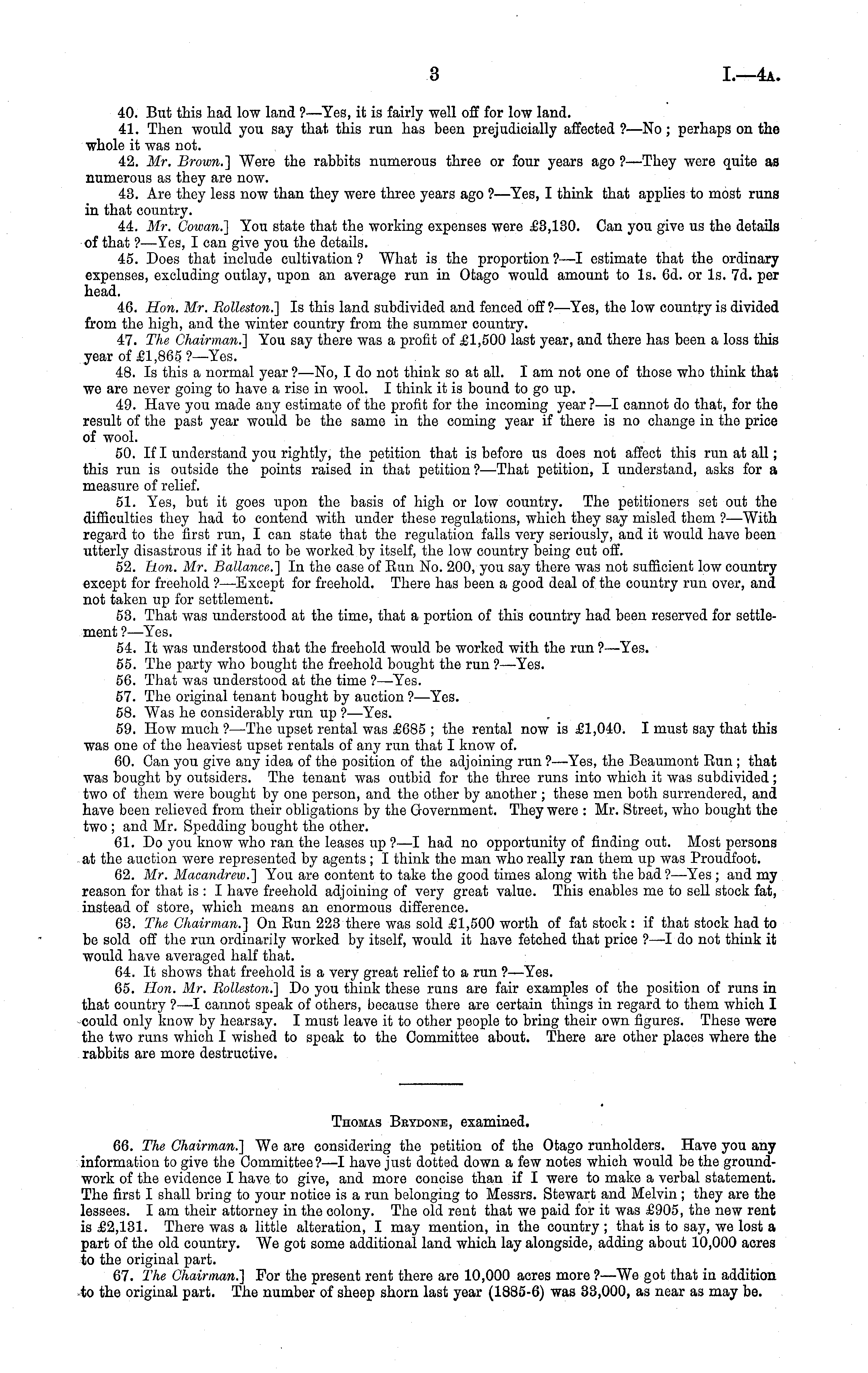 40. But this had low land ? —Yes, it is fairly well off for low land. 41. Then would you say that this run has been prejudicially affected ?—No; perhaps on the whole it was not. 42. Mr. Brown.] Were the rabbits numerous three or four years ago ?—They were quite as numerous as they are now. 43. Are they less now than they were three years ago ? —Yes, I think that applies to most runs in that country. 44. Mr. Cowan.] You state that the working expenses were £3,130. Can you give us the details of that ?—Yes, I can give you the details. 45. Does that include cultivation ? What is the proportion ? —I estimate that the ordinary expenses, excluding outlay, upon an average run in Otago would amount to Is. 6d. or Is. 7d. per head. 46. Hon. Mr. Rolleston.] Is this land subdivided and fenced off ?—Yes, the low country is divided from the high, and the winter country from the summer country. 47. The Chairman.] You say there was a profit of £1,500 last year, and there has been a loss this year of £I,B6s?—Yes. 48. Is this a normal year ?—No, Ido not think so at all. lam not one of those who think that we are never going to have a rise in wool. I think it is bound to go up. 49. Have you made any estimate of the profit for the incoming year?—l cannot do that, for the result of the past year would be the same in the coming year if there is no change in the price of wool. 50. If I understand you rightly, the petition that is before us does not affect this run at all; this run is outside the points raised in that petition ? —That petition, I understand, asks for a measure of relief. 51. Yes, but it goes upon the basis of high or low country. The petitioners set out the difficulties they had to contend with under these regulations, which they say misled them ?—With regard to the first run, I can state that the regulation falls very seriously, and it would have been utterly disastrous if it had to be worked by itself, the low country being cut off. 52. Ron. Mr. Ballance.] In the case of Eun No. 200, you say there was not sufficient low country except for freehold ?—Except for freehold. There has been a good deal of the country run over, and not taken up for settlement. 53. That was understood at the time, that a portion of this country had been reserved for settlement ?—Yes. 54. It was understood that the freehold would be worked with the run ?—-Yes. 55. The party who bought the freehold bought the run ? —Yes. 56. That was understood at the time ?—Yes. 57. The original tenant bought by auction ?—Yes. 58. Was he considerably run up ?—Yes. 59. How much ?—The upset rental was £685 ; the rental now is £1,040. I must say that this was one of the heaviest upset rentals of any run that I know of. 60. Can you give any idea of the position of the adjoining run ?—-Yes, the Beaumont Eun ; that was bought by outsiders. The tenant was outbid for the three runs into which it was subdivided; two of them were bought by one person, and the other by another ; these men both surrendered, and have been relieved from their obligations by the Government. They were : Mr. Street, who bought the two ; and Mr. Spedding bought the other. 61. Do you know who ran the leases up ?—I had no opportunity of finding out. Most persons at the auction were represented by agents; I think the man who really ran them up was Proudfoot. 62. Mr. Macandrew.] You are content to take the good times along with the bad? —Yes ; and my reason for that is : I have freehold adjoining of very great value. This enables me to sell stock fat, instead of store, which means an enormous difference. 63. The Chairman.] On Eun 223 there was sold £1,500 worth of fat stock : if that stock had to be sold off the run ordinarily worked by itself, would it have fetched that price ? —I do not think it would have averaged half that. 64. It shows that freehold is a very great relief to a run ?—Yes. 65. Hon. Mr. Rolleston.] Do you think these runs are fair examples of the position of runs in that country ? —I cannot speak of others, because there are certain things in regard to them which I could only know by hearsay. I must leave it to other people to bring their own figures. These were the two runs which I wished to speak to the Committee about. There are other places where the rabbits are more destructive.