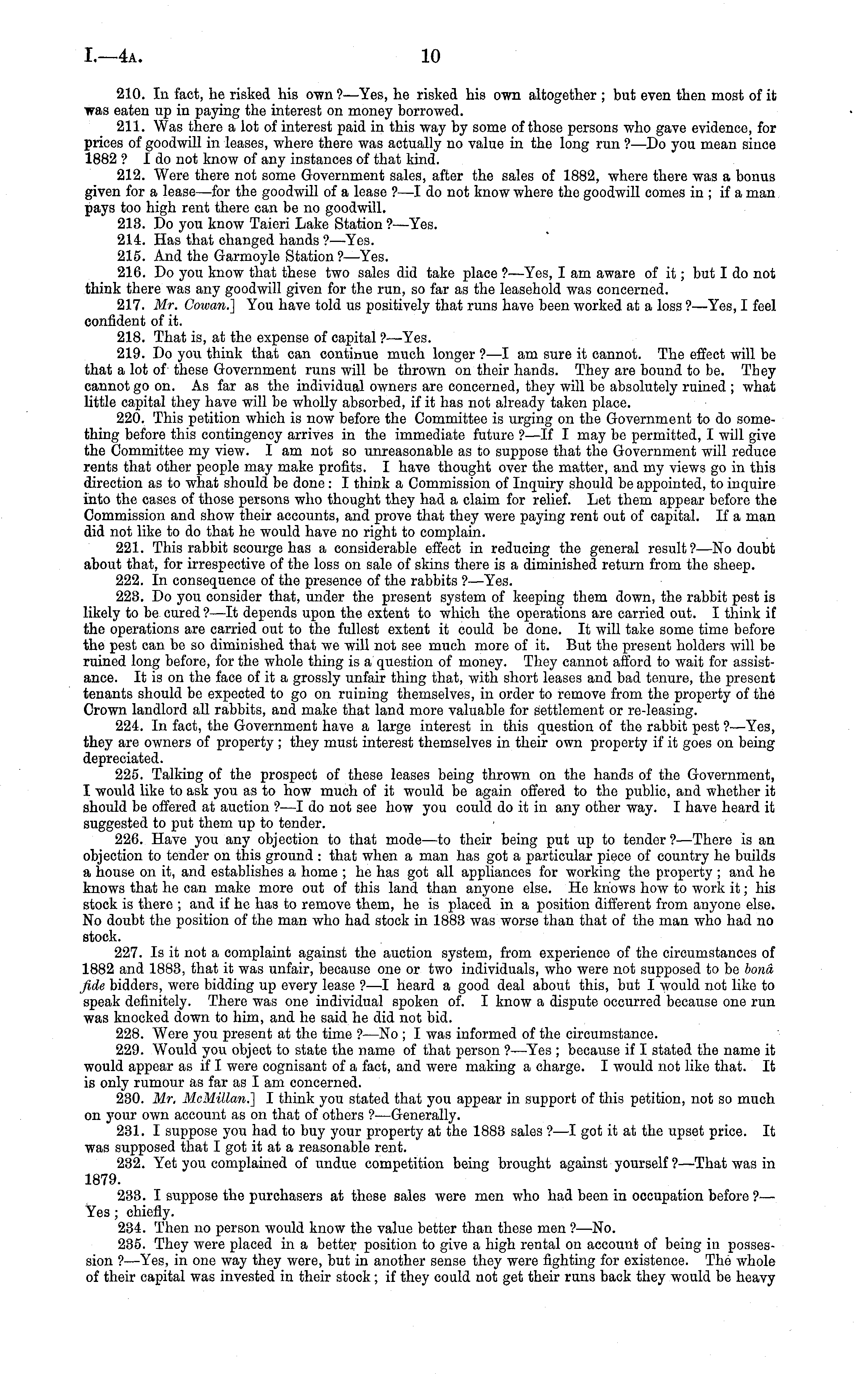 210. In fact, he risked his own ?—Yes, he risked his own altogether ; but even then most of it was eaten up in paying the interest on money borrowed. 211. Was there a lot of interest paid in this way by some of those persons who gave evidence, for prices of goodwill in leases, where there was actually no value in the long run ?—Do you mean since 1882 ? Ido not know of any instances of that kind. 212. Were there not some Government sales, after the sales of 1882, where there was a bonus given for a lease—for the goodwill of a lease ?—I do not know where the goodwill comes in ;if a man pays too high rent there can be no goodwill. 213. Do you know Taieri Lake Station ?—Yes. 214. Has that changed hands ?■ —Yes. 215. And the Garmoyle Station ?—Yes. 216. Do you know that these two sales did take place ?—Yes, lam aware of it; but Ido not think there was any goodwill given for the run, so far as the leasehold was concerned. 217. Mr. Cowan.] You have told us positively that runs have been worked at a loss ?—Yes, I feel confident of it. 218. That is, at the expense of capital ?—Yes. 219. Do you think that can continue much longer ?—I am sure it cannot. The effect will be that a lot of these Government runs will be thrown on their hands. They are bound to be. They cannot go on. As far as the individual owners are concerned, they will be absolutely ruined ; what little capital they have will be wholly absorbed, if it has not already taken place. 220. This petition which is now before the Committee is urging on the Government to do something before this contingency arrives in the immediate future ?—lf I may be permitted, I will give the Committee my view. I am not so unreasonable as to suppose that the Government will reduce rents that other people may make profits. I have thought over the matter, and my views go in this direction as to what should be done : I think a Commission of Inquiry should be appointed, to inquire into the cases of those persons who thought they had a claim for relief. Let them appear before the Commission and show their accounts, and prove that they were paying rent out of capital. If a man did not like to do that he would have no right to complain. 221. This rabbit scourge has a considerable effect in reducing the general result?—No doubt about that, for irrespective of the loss on sale of skins there is a diminished return from the sheep. 222. In consequence of the presence of the rabbits ?—Yes. 223. Do you consider that, under the present system of keeping them down, the rabbit pest is likely to be cured ?—lt depends upon the extent to which the operations are carried out. I think if the operations are carried out to the fullest extent it could be done. It will take some time before the pest can be so diminished that we will not see much more of it. But the present holders will be ruined long before, for the whole thing is a question of money. They cannot afford to wait for assistance. It is on the face of it a grossly unfair thing that, with short leases and bad tenure, the present tenants should be expected to go on ruining themselves, in order to remove from the property of the Crown landlord all rabbits, and make that land more valuable for settlement or re-leasing. 224. In fact, the Government have a large interest in this question of the rabbit pest ?—Yes, they are owners of property ; they must interest themselves in their own property if it goes on being depreciated. 225. Talking of the prospect of these leases being thrown on the hands of the Government, I would like to ask you as to how much of it would be again offered to the public, and whether it should be offered at auction ?—I do not see how you could do it in any other way. I have heard it suggested to put them up to tender. 226. Have you any objection to that mode —to their being put up to tender ?—There is an objection to tender on this ground : that when a man has got a particular piece of country he builds a house on it, and establishes a home ; he has got all appliances for working the property ; and he knows that he can make more out of this land than anyone else. He knows how to work it; his stock is there ; and if he has to remove them, he is placed in a position different from anyone else. No doubt the position of the man who had stock in 1883 was worse than that of the man who had no stock. 227. Is it not a complaint against the auction system, from experience of the circumstances of 1882 and 1883, that it was unfair, because one or two individuals, who were not supposed to be bond fide bidders, were bidding up every lease ?—I heard a good deal about this, but I would not like to speak definitely. There was one individual spoken of. I know a dispute occurred because one run was knocked down to him, and he said he did not bid. 228. Were you present at the time ?—No ; I was informed of the circumstance. 229. Would you object to state the name of that person ?—Yes ; because if I stated the name it would appear as if I were cognisant of a fact, and were making a charge. I would not like that. It is only rumour as far as I am concerned. 230. Mr. McMillan.] I think you stated that you appear in support of this petition, not so much on your own account as on that of others ?—Generally. 231. I suppose you had to buy your property at the 1883 sales ?—I got it at the upset price. It was supposed that I got it at a reasonable rent. 232. Yet you complained of undue competition being brought against yourself ?—That was in 1879. 233. I suppose the purchasers at these sales were men who had been in occupation before ?— Yes ; chiefly. 234. Then no person would know the value better than these men ?—No. 235. They were placed in a better position to give a high rental on account of being in possession ? —Yes, in one way they were, but in another sense they were fighting for existence. The whole of their capital was invested in their stock ; if they could not