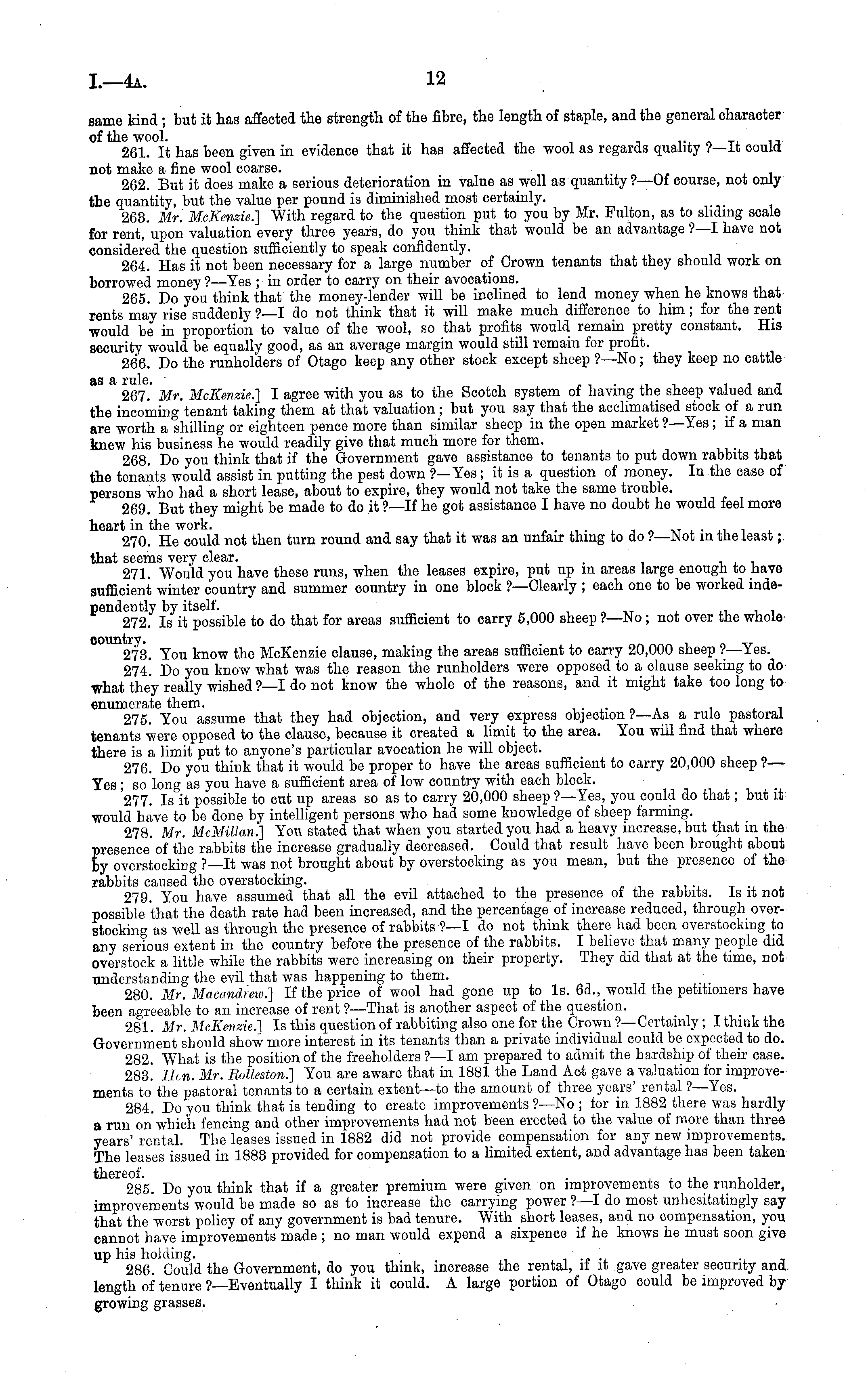 same kind ; but it has affected the strength of the fibre, the length of staple, and the general character of the wool. ,•, „ Ti. i_ 261. It has been given in evidence that it has affected the wool as regards quality ?—lt could not make a fine wool coarse. 262. But it does make a serious deterioration in value as well as quantity ?—Of course, not only the quantity, but the value per pound is diminished most certainly. 263. Mr. McKenzie.] With regard to the question put to you by Mr. Fulton, as to sliding scale for rent, upon valuation every three years, do you think that would be an advantage ?—I have not considered the question sufficiently to speak confidently. 264. Has it not been necessary for a large number of Crown tenants that they should work on borrowed money ?—Yes ; in order to carry on their avocations. 265. Do you think that the money-lender will be inclined to lend money when he knows that rents may rise suddenly ?—I do not think that it will make much difference to him; for the rent would be in proportion to value of the wool, so that profits would remain pretty constant. His security would be equally good, as an average margin would still remain for profit. 266. Do the runholders of Otago keep any other stock except sheep ?—No; they keep no cattle 267.' Mr. McKenzie.] I agree with you as to the Scotch system of having the sheep valued and the incoming tenant taking them at that valuation; but you say that the acclimatised stock of a run are worth a shilling or eighteen pence more than similar sheep in the open market ?—Yes ;if a man knew his business he would readily give that much more for them. 268. Do you think that if the Government gave assistance to tenants to put down rabbits that the tenants would assist in putting the pest down ?—Yes; it is a question of money. In the case of persons who had a short lease, about to expire, they would not take the same trouble. 269. But they might be made to do it ?—lf he got assistance I have no doubt he would feel more heart in the work. . , .. , 270. He could not then turn round and say that it was an unfair thing to do ?—Not in the least; that seems very clear. . . 271. Would you have these runs, when the leases expire, put up m areas large enough to have sufficient winter country and summer country in one block ?—Clearly ; each one to be worked independently by itself. 272. Is it possible to do that for areas sufficient to carry 5,000 sheep ?—No ; not over the whole country. 273. You know the McKenzie clause, making the areas sufficient to carry 20,000 sheep ?—Yes. 274! Do you know what was the reason the runholders were opposed to a clause seeking to do what they really wished ?—I do not know the whole of the reasons, and it might take too long to enumerate them. , . 275. You assume that they had objection, and very express objection ?—As a rule pastoral tenants were opposed to the clause, because it created a limit to the area. You will find that where there is a limit put to anyone's particular avocation he will object. 276. Do you think that it would be proper to have the areas sufficient to carry 20,000 sheep ?— Yes ; so long as you have a sufficient area of low country with each block. 277. Is it possible to cut up areas so as to carry 20,000 sheep ?—Yes, you could do that; but it would have to be done by intelligent persons who had some knowledge of sheep farming. 278. Mr. McMillan.] You stated that when you started you had a heavy increase, but that in the presence'of the rabbits the increase gradually decreased. Could that result have been brought about by overstocking ?—lt was not brought about by overstocking as you mean, but the presence of the rabbits caused the overstocking. 279. You have assumed that all the evil attached to the presence of the rabbits. Is it not possible that the death rate had been increased, and the percentage of increase reduced, through overstocking as well as through the presence of rabbits ?—I do not think there had been overstocking to any serious extent in the country before the presence of the rabbits. I believe that many people did overstock a little while the rabbits were increasing on their property. They did that at the time, not understanding the evil that was happening to them. 280. Mr. Macandrew.] If the price of wool had gone up to Is. 6d., would the petitioners have been agreeable to an increase of rent ?—That is another aspect of the question. 281. Mr. McKenzie.] Is this question of rabbiting also one for the Crown ?—Certainly; I think the Government should show more interest in its tenants than a private individual could be expected to do. 282. What is the position of the freeholders ?—I am prepared to admit the hardship of their case. 283. Hen. Mr. Rolleston.] You are aware that in 1881 the Land Act gave a valuation for improvements to the pastoral tenants to a certain extent—to the amount of three years' rental ?—Yes. 284. Do you think that is tending to create improvements ?—No ; for in 1882 there was hardly a run on which fencing and other improvements had not been erected to the value of more than three years' rental. The leases issued in 1882 did not provide compensation for any new improvements. The leases issued in 1883 provided for compensation to a limited extent, and advantage has been taken 285. Do you think that if a greater premium were given on improvements to the runholder, improvements would be made so as to increase the carrying power ?—I do most unhesitatingly say that the worst policy of any government is bad tenure. With short leases, and no compensation, you cannot have improvements made ; no man would expend a sixpence if he knows he must soon give up his holding. ~.'.. , •, 286. Gould the Government, do you think, increase the rental, if it gave greater security and length of tenure ?—Eventually I think it could. A large portion of Otago could be improved by growing grasses.