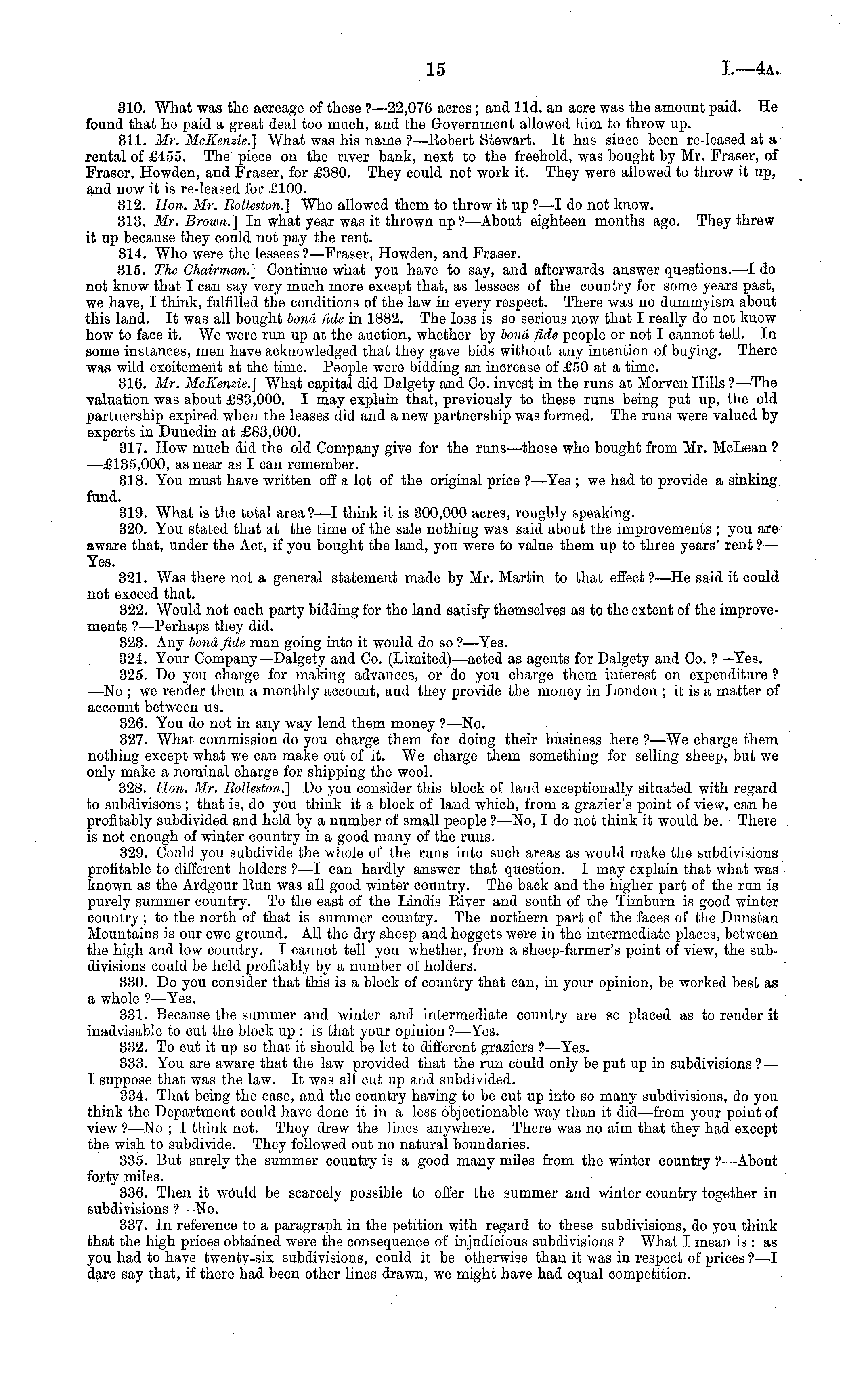 310. What was the acreage of these ? —22,076 acres ; and lid. an acre was the amount paid. He found that he paid a great deal too much, and the Government allowed him to throw up. 811. Mr. McKenzie.] What was his name ?—Eobert Stewart. It has since been re-leased at a rental of £455. The piece on the river bank, next to the freehold, was bought by Mr. Fraser, of Fraser, Howden, and Fraser, for £380. They could not work it. They were allowed to throw it up, and now it is re-leased for £100. 312. Hon. Mr. Rolleston.] Who allowed them to throw it up ?—I do not know. 313. Mr. Brown.] In what year was it thrown up ?—About eighteen months ago. They threw it up because they could not pay the rent. 314. Who were the lessees ?—Fraser, Howden, and Fraser. 315. The Chairman.] Continue what you have to say, and afterwards answer questions. —I do not know that I can say very much more except that, as lessees of the country for some years past, we have, I think, fulfilled the conditions of the law in every respect. There was no dummyism about this land. It was all bought bond tide in 1882. The loss is so serious now that I really do not know how to face it. We were run up at the auction, whether by bond fide people or not I cannot tell. In some instances, men have acknowledged that they gave bids without any intention of buying. There was wild excitement at the time. People were bidding an increase of £50 at a time. 316. Mr. McKenzie.] What capital did Dalgety and Co. invest in the runs at Morven Hills ?—The valuation was about £83,000. I may explain that, previously to these runs being put up, the old partnership expired when the leases did and a new partnership was formed. The runs were valued by experts in Dunedin at £83,000. 317. How much did the old Company give for the runs—those who bought from Mr. McLean ? —£135,000, as near as I can remember. 318. You must have written off a lot of the original price ? —Yes ; we had to provide a sinking fund. 319. What is the total area ?—I think it is 300,000 acres, roughly speaking. 820. You stated that at the time of the sale nothing was said about the improvements ; you are aware that, under the Act, if you bought the land, you were to value them up to three years' rent ? — Yes. 321. Was there not a general statement made by Mr. Martin to that effect?—He said it could not exceed that. 322. Would not each party bidding for the land satisfy themselves as to the extent of the improvements ?—Perhaps they did. 323. Any bona fide man going into it would do so ? —Yes. 324. Your Company—Dalgety and Co. (Limited) —acted as agents for Dalgety and Co. ?—Yes. 325. Do you charge for making advances, or do you charge them interest on expenditure ? —No ;we render them a monthly account, and they provide the money in London ;itis a matter of account between us. 326. You do not in any way lend them money ?—No. 327. What commission do you charge them for doing their business here ?—We charge them nothing except what we can make out of it. We charge them something for selling sheep, but we only make a nominal charge for shipping the wool. 328. Hon. Mr. Rolleston.] Do you consider this block of land exceptionally situated with regard to subdivisons ; that is, do you think it a block of land which, from a grazier's point of view, can be profitably subdivided and held by a number of small people ?—No, Ido not think it would be. There is not enough of winter country in a good many of the runs. 329. Could you subdivide the whole of the runs into such areas as would make the subdivisions profitable to different holders ? —I can hardly answer that question. I may explain that what was known as the Ardgour Eun was all good winter country. The back and the higher part of the run is purely summer country. To the east of the Lindis Eiver and south of the Timburn is good winter country; to the north of that is summer country. The northern part of the faces of the Dunstan Mountains is our ewe ground. All the dry sheep and hoggets were in the intermediate places, between the high and low country. I cannot tell you whether, from a sheep-farmer's point of view, the subdivisions could be held profitably by a number of holders. 330. Do you consider that this is a block of country that can, in your opinion, be worked best as a whole ?—Yes. 331. Because the summer and winter and intermediate country are sc placed as to render it inadvisable to cut the block up : is that your opinion ? —Yes. 332. To cut it up so that it should be let to different graziers ?—-Yes. 333. You are aware that the law provided that the run could only be put up in subdivisions ?— I suppose that was the law. It was all cut up and subdivided. 334. That being the case, and the country having to be cut up into so many subdivisions, do you think the Department could have done it in a less objectionable way than it did—from your point of view ?—No ; I think not. They drew the lines anywhere. There was no aim that they had except the wish to subdivide. They followed out no natural boundaries. 335. But surely the summer country is a good many miles from the winter country ? —About forty miles. 336. Then it would be scarcely possible to offer the summer and winter country together in subdivisions ? —No. 337. In reference to a paragraph in the petition with regard to these subdivisions, do you think that the high prices obtained were the consequence of injudicious subdivisions ? What I mean is : as you had to have twenty-six subdivisions, could it be otherwise than it was in respect of prices ?—I dare say that, if there had been other lines drawn, we might have had equal competition.