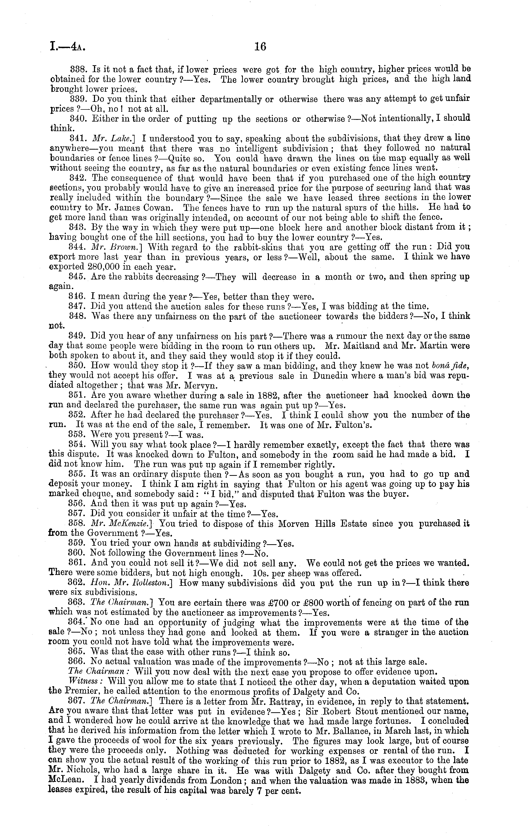 338. Is it not a fact that, if lower prices were got for the high country, higher prices would be obtained for the lower country ?—Yes. The lower country brought high prices, and the high land brought lower prices. 339. Do you think that either departmentally or otherwise there was any attempt to get unfair prices ?—Oh, no ! not at all. 340. Either in the order of putting up the sections or otherwise ?—Not intentionally, I should think. 341. Mr. Lake.] I understood you to say, speaking about the subdivisions, that they drew a line anywhere—you meant that there was no intelligent subdivision ; that they followed no natural boundaries or fence lines ? —Quite so. You could have drawn the lines on the map equally as well without seeing the country, as far as the natural boundaries or even existing fence lines went. 342. The consequence of that would have been that if you purchased one of the high country sections, you probably would have to give an increased price for the purpose of securing land that was really included within the boundary ?—Since the sale we have leased three sections in the lower country to Mr. James Cowan. The fences have to run up the natural spurs of the hills. He had to get more land than was originally intended, on account of our not being able to shift the fence. 343. By the way in which they were put vp —one block here and another block distant from it; having bought one of the hill sections, you had to buy the lower country ?—Yes. 344. Mr. Brown.] With regard to the rabbit-skins that you are getting off the run : Did you export more last year than in previous years, or less ?—Well, about the same. I think we have exported 280,000 in each year. 345. Are the rabbits decreasing ?—They will decrease in a month or two, and then spring up again. 346. I mean during the year ? —Yes, better than they were. 347. Did you attend the auction sales for these runs ?—Yes, I was bidding at the time. 348. Was there any unfairness on the part of the auctioneer towards the bidders ?—No, I think not. 349. Did you hear of any unfairness on his part ? —There was a rumour the next day or the same day that some people were bidding in the room to run others up. Mr. Maitland and Mr. Martin were both spoken to about it, and they said they would stop it if they could. 350. How would they stop it ?—lf they saw a man bidding, and they knew he was not bond fide, they would not accept his offer. I was at a previous sale in Dunedin where a man's bid was repudiated altogether ; that was Mr. Mervyn. 351. Are you aware whether during a sale in 1882, after the auctioneer had knocked down the run and declared the purchaser, the same run was again put up ? —Yes. 352. After he had declared the purchaser ?—Yes. I think I could show you the number of the run. It was at the end of the sale, I remember. It was one of Mr. Fulton's. 353. Were you present ?—I was. 354. Will you say what took place ?—I hardly remember exactly, except the fact that there was this dispute. It was knocked down to Fulton, and somebody in the room said he had made a bid. I did not know him. The run was put up again if I remember rightly. 355. It was an ordinary dispute then ?—As soon as you bought a run, you had to go up and deposit your money. I think lam right in saying that Fulton or his agent was going up to pay his marked cheque, and somebody said: " I bid," and disputed that Fulton was the buyer. 856. And then it was put up again ?—Yes. 357. Did you consider it unfair at the time ?—Yes. 358. Mr. McKenzie.] You tried to dispose of this Morven Hills Estate since you purchased it from the Government ?—Yes. 359. You tried your own hands at subdividing ?—Yes. 360. Not following the Government lines ? —No. 861. And you could not sell it?—We did not sell any. We could not get the prices we wanted. There were some bidders, but not high enough. 10s. per sheep was offered. 362. Hon. Mr. Rolleston.] How many subdivisions did you put the run up in ?—I think there were six subdivisions. 363. The Chairman.] You are certain there was £700 or £800 worth of fencing on part of the run which was not estimated by the auctioneer as improvements ?—Yes. 364. No one had an opportunity of judging what the improvements were at the time of the sale ?—No ; not unless they had gone and looked at them. If you were a stranger in the auction room you could not have told what the improvements were. 365. Was that the case with other runs ?—I think so. 366. No actual valuation was made of the improvements ?—No ; not at this large sale. The Chairman: Will you now deal with the next case you propose to offer evidence upon. Witness : Will you allow me to state that I noticed the other day, when a deputation waited upon the Premier, he called attention to the enormous profits of Dalgety and Co. 367. The Chairman.] There is a letter from Mr. Eattray, in evidence, in reply to that statement. Are you aware that that letter was put in evidence ?—Yes ; Sir Eobert Stout mentioned our name, and I wondered how he could arrive at the knowledge that we had made large fortunes. I concluded that he derived his information from the letter which I wrote to Mr. Ballance, in March last, in which I gave the proceeds of wool for the six years previously. The figures may look large, but of course they were the proceeds only. Nothing was deducted for working expenses or rental of the run. I can show you the actual result of the working of this run prior to 1882, as I was executor to the late Mr. Nichols, who had a large share in it. He was with Dalgety and Co. after they bought from McLean. _ I had yearly dividends from London; and when the valuation was made in 1883, when the leases expired, the result of his capital was barely 7 per cent.