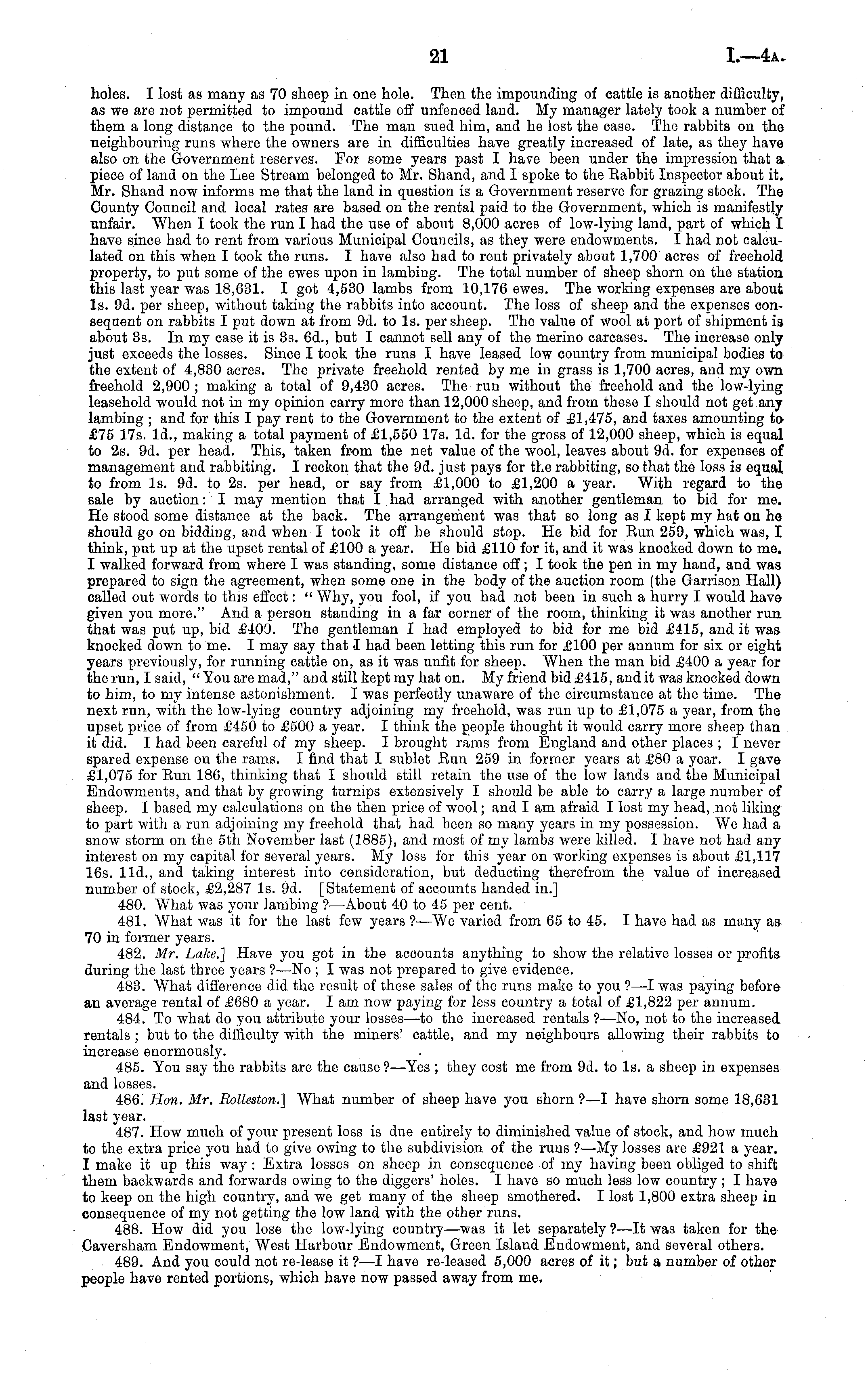 holes. I lost as many as 70 sheep in one hole. Then the impounding of cattle is another difficulty, as we are not permitted to impound cattle off unfenced land. My manager lately took a number of them a long distance to the pound. The man sued him, and he lost the case. The rabbits on the neighbouring runs where the owners are in difficulties have greatly increased of late, as they have also on the Government reserves. For some years past I have been under the impression that a piece of land on the Lee Stream belonged to Mr. Shand, and I spoke to the Babbit Inspector about it. Mr. Shand now informs me that the land in question is a Government reserve for grazing stock. The County Council and local rates are based on the rental paid to the Government, which is manifestly unfair. When I took the run I had the use of about 8,000 acres of low-lying land, part of which I have since had to rent from various Municipal Councils, as they were endowments. I had not calculated on this when I took the runs. I have also had to rent privately about 1,700 acres of freehold property, to put some of the ewes upon in lambing. The total number of sheep shorn on the station this last year was 18,631. I got 4,530 lambs from 10,176 ewes. The working expenses are about Is. 9d. per sheep, without taking the rabbits into account. The loss of sheep and the expenses consequent on rabbits I put down at from 9d. to Is. per sheep. The value of wool at port of shipment is about 3s. In my case it is 3s. 6d., but I cannot sell any of the merino carcases. The increase only just exceeds the losses. Since I took the runs I have leased low country from municipal bodies to the extent of 4,830 acres. The private freehold rented by me in grass is 1,700 acres, and my own freehold 2,900; making a total of 9,430 acres. The run without the freehold and the low-lying leasehold would not in my opinion carry more than 12,000 sheep, and from these I should not get any lambing ; and for this I pay rent to the Government to the extent of £1,475, and taxes amounting to £75 17s. Id., making a total payment of £1,550 17s. Id. for the gross of 12,000 sheep, which is equal to 2s. 9d. per head. This, taken from the net value of the wool, leaves about 9d. for expenses of management and rabbiting. I reckon that the 9d. just pays for the rabbiting, so that the loss is equal to from Is. 9d. to 2s. per head, or say from £1,000 to £1,200 a year. With regard to the sale by auction: I may mention that I had arranged with another gentleman to bid for me. He stood some distance at the back. The arrangement was that so long as I kept my hat on he should go on bidding, and when I took it off he should stop. He bid for Eun 259, which was, I think, put up at the upset rental of £100 a year. He bid £110 for it, and it was knocked down to me. I walked forward from where I was standing, some distance off; I took the pen in my hand, and was prepared to sign the agreement, when some one in the body of the auction room (the Garrison Hall) called out words to this effect: " Why, you fool, if you had. not been in such a hurry I would have given you more." And a person standing in a far corner of the room, thinking it was another run that was put up, bid £400. The gentleman I had employed to bid for me bid £415, and it was knocked down to me. I may say that I had been letting this run for £100 per annum for six or eight years previously, for running cattle on, as it was unfit for sheep. When the man bid £400 a year for the run, I said, " You are mad," and still kept my hat on. My friend bid £415, and it was knocked down to him, to my intense astonishment. I was perfectly unaware of the circumstance at the time. The next run, with the low-lying country adjoining my freehold, was run up to £1,075 a year, from the upset price of from £450 to £500 a year. I think the people thought it would carry more sheep than it did. I had been careful of my sheep. I brought rams from England and other places ; I never spared expense on the rams. I find that I sublet Eun 259 in former years at £80 a year. I gave £1,075 for Eun 186, thinking that I should still retain the use of the low lands and the Municipal Endowments, and that by growing turnips extensively I should be able to carry a large number of sheep. I based my calculations on the then price of wool; and lam afraid I lost my head, not liking to part with a run adjoining my freehold that had been so many years in my possession. We had a snow storm on the sth November last (1885), and most of my lambs were killed. I have not had any interest on my capital for several years. My loss for this year on working expenses is about £1,117 16s. lid., and taking interest into consideration, but deducting therefrom the value of increased number of stock, £2,287 Is. 9d. [Statement of accounts handed in.] 480. What was your lambing ?—About 40 to 45 per cent. 481. What was it for the last few years ?—We varied from 65 to 45. I have had as many as 70 in former years. 482. Mr. Lake.] Have you got in the accounts anything to show the relative losses or profits during the last three years ?—No ; I was not prepared to give evidence. 483. What difference did the result of these sales of the runs make to you ?—I was paying before an average rental of £680 a year. lam now paying for less country a total of £1,822 per annum. 484. To what do you attribute your losses —to the increased rentals ?—No, not to the increased rentals ; but to the difficulty with the miners' cattle, and my neighbours allowing their rabbits to increase enormously. 485. You say the rabbits are the cause ? —Yes ; they cost me from 9d. to Is. a sheep in expenses and losses. 486 i Hon. Mr. Rolleston.] What number of sheep have you shorn ?—I have shorn some 18,631 last year. 487. How much of your present loss is due entirely to diminished value of stock, and how much to the extra price you had to give owing to the subdivision of the runs ?—