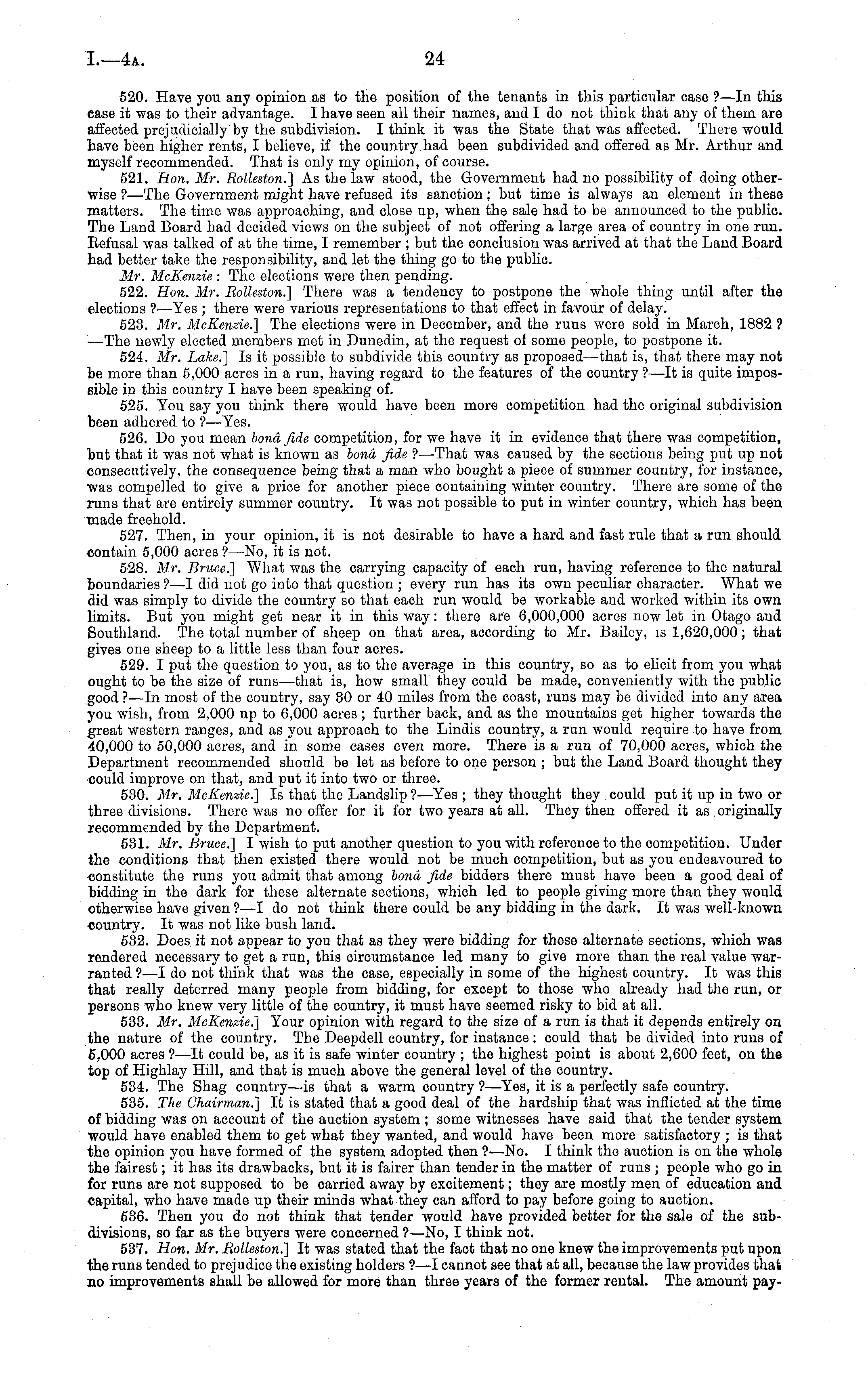 520. Have you any opinion as to the position of the tenants in this particular case ?—ln this case it was to their advantage. I have seen all their names, and Ido not think that any of them are affected prejudicially by the subdivision. I think it was the State that was affected. There would have been higher rents, I believe, if the country had been subdivided and offered as Mr. Arthur and myself recommended. That is only my opinion, of course. 521. Hon. Mr. Rolleston.] As the law stood, the Government had no possibility of doing otherwise ?—The Government might have refused its sanction; but time is always an element in these matters. The time was approaching, and close up, when the sale had to be announced to the public. The Land Board had decided views on the subject of not offering a large area of country in one run. Eefusal was talked of at the time, I remember ; but the conclusion was arrived at that the Land Board had better take the responsibility, and let the thing go to the public. Mr. McKenzie : The elections were then pending. 522. Hon. Mr. Rolleston.] There was a tendency to postpone the whole thing until after the elections ?—Yes ; there were various representations to that effect in favour of delay. 523. Mr. McKenzie.] The elections were in December, and the runs were sold in March, 1882 ? —The newly elected members met in Dunedin, at the request of some people, to postpone it. 524. Mr. Lake.] Is it possible to subdivide this country as proposed—that is, that there may not be more than 5,000 acres in a run, having regard to the features of the country ?—lt is quite impossible in this country I have been speaking of. 525. You say you think there would have been more competition had the original subdivision been adhered to ?—Yes. 526. Do you mean bond fide competition, for we have it in evidence that there was competition, but that it was not what is known as bond fide ? —That was caused by the sections being put up not consecutively, the consequence being that a man who bought a piece of summer country, for instance, was compelled to give a price for another piece containing winter country. There are some of the runs that are entirely summer country. It was not possible to put in winter country, which has been made freehold. 527. Then, in your opinion, it is not desirable to have a hard and fast rule that a run should contain 5,000 acres ? —No, it is not. 528. Mr. Bruce.] What was the carrying capacity of each run, having reference to the natural boundaries ?—I did not go into that question ; every run has its own peculiar character. What we did was simply to divide the country so that each run would be workable and worked within its own limits. But you might get near it in this way: there are 6,000,000 acres now let in Otago and Southland. The total number of sheep on that area, according to Mr. Bailey, is 1,620,000; that gives one sheep to a little less than four acres. 529. I put the question to you, as to the average in this country, so as to elicit from you what ought to be the size of runs—that is, how small they could be made, conveniently with the public good ?—ln most of the country, say 30 or 40 miles from the coast, runs may be divided into any area you wish, from 2,000 up to 6,000 acres ; further back, and as the mountains get higher towards the great western ranges, and as you approach to the Lindis country, a run would require to have from 40,000 to 50,000 acres, and in some cases even more. There is a run of 70,000 acres, which the Department recommended should be let as before to one person ; but the Land Board thought they could improve on that, and put it into two or three. 530. Mr. McKenzie.] Is that the Landslip ?—Yes ; they thought they could put it up in two or three divisions. There was no offer for it for two years at all. They then offered it as originally recommended by the Department. 531. Mr. Bruce.] I wish to put another question to you with reference to the competition. Under the conditions that then existed there would not be much competition, but as you endeavoured to constitute the runs you admit that among bond fide bidders there must have been a good deal of bidding in the dark for these alternate sections, which led to people giving more than they would otherwise have given ?—I do not think there could be any bidding in the dark. It was well-known country. It was not like bush land. 532. Does it not appear to you that as they were bidding for these alternate sections, which was rendered necessary to get a run, this circumstance led many to give more than the real value warranted ?—I do not think that was the case, especially in some of the highest country. It was this that really deterred many people from bidding, for except to those who already had the run, or persons who knew very little of the country, it must have seemed risky to bid at all. 533. Mr. McKenzie.] Your opinion with regard to the size of a run is that it depends entirely on the nature of the country. The Deepdell country, for instance : could that be divided into runs of 5,000 acres ?—lt could be, as it is safe winter country ; the highest point is about 2,600 feet, on the top of Highlay Hill, and that is much above the general level of the country. 534. The Shag country—is that a warm country ?—Yes, it is a perfectly safe country. 535. The Chairman.] It is stated that a good deal of the hardship that was inflicted at the time of bidding was on account of the auction system ; some witnesses have said that the tender system would have enabled them to get what they wanted, and would have been more satisfactory ; is that the opinion you have formed of the system adopted then ?—No. I think the auction is on the whole the fairest; it has its drawbacks, but it is fairer than tender in the matter of runs ; people who go in for runs are not supposed to be carried away by excitement; they are mostly men of education and capital, who have made 