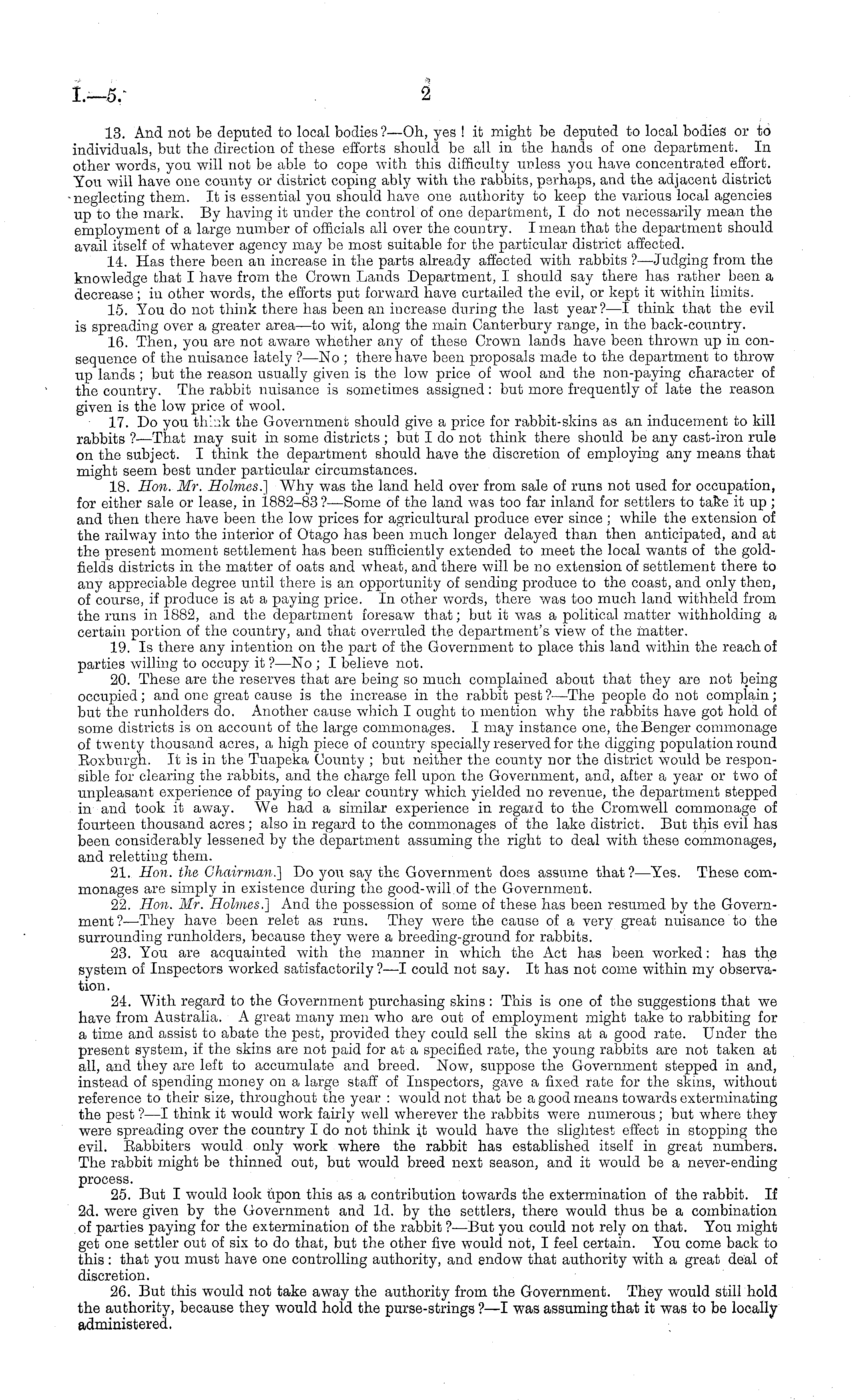 13. And not be deputed to local bodies?—Oh, yes ! it might be deputed to local bodies or to individuals, but the direction of these efforts should be all in the hands of one department. In other words, you will not be able to cope with this difficulty unless you have concentrated effort. You will have one county or district coping ably with the rabbits, perhaps, and the adjacent district neglecting them. It is essential you should have one authority to keep the various local agencies up to the mark. By having it under the control of one department, I do not necessarily mean the employment of a large number of officials all over the country. I mean that the department should avail itself of whatever agency may be most suitable for the particular district affected. 14. Has there been an increase in the parts already affected with rabbits ?—Judging from the knowledge that I have from the Crown Lands Department, I should say there has rather been a decrease ; in other words, the efforts put forward have curtailed the evil, or kept it within limits. 15. You do not think there has been an increase during the last year? —I think that the evil is spreading over a greater area —to wit, along the main Canterbury range, in the back-country. 16. Then, you are not aware whether any of these Crown lands have been thrown up in consequence of the nuisance lately ?—No ; there have been proposals made to the department to throw up lands ; but the reason usually given is the low price of wool and the non-paying character of the country. The rabbit nuisance is sometimes assigned : but more frequently of late the reason given is the low price of wool. 17. Do you think the Government should give a price for rabbit-skins as an inducement to kill rabbits ?—That may suit in some districts ; but I do not think there should be any cast-iron rule on the subject. I think the department should have the discretion of employing any means that might seem best under particular circumstances. 18. Hon. Mr. Holmes.'] Why was the land held over from sale of runs not used for occupation, for either sale or lease, in 1882-83 ?—Some of the land was too far inland for settlers to take it up ; and then there have been the low prices for agricultural produce ever since ; while the extension of the railway into the interior of Otago has been much longer delayed than then anticipated, and at the present moment settlement has been sufficiently extended to meet the local wants of the goldfields districts in the matter of oats and wheat, and there will be no extension of settlement there to any appreciable degree until there is an opportunity of sending produce to the coast, and only then, of course, if produce is at a paying price. In other words, there was too much land withheld from the runs in 1882, and the department foresaw that; but it was a political matter withholding a certain portion of the country, and that overruled the department's view of the matter. 19. Is there any intention on the part of the Government to place this land within the reach of parties willing to occupy it ?—No ; I believe not. 20. These are the reserves that are being so much complained about that they are not being occupied; and one great cause is the increase in the rabbit pest ?—The people do not complain; but the runholders do. Another cause which I ought to mention why the rabbits have got hold of some districts is on account of the large commonages. I may instance one, theßenger commonage of twenty thousand acres, a high piece of country specially reserved for the digging population round Eoxburgh. It is in the Tuapeka County ; but neither the county nor the district would be responsible for clearing the rabbits, and the charge fell upon the Government, and, after a year or two of unpleasant experience of paying to clear country which yielded no revenue, the department stepped in and took it away. We had a similar experience in regard to the Cromwell commonage of fourteen thousand acres; also in regard to the commonages of the lake district. But this evil has been considerably lessened by the department assuming the right to deal with these commonages, and reletting them. 21. Hon. the Chairman.] Do you say the Government does assume that? —Yes. These commonages are simply in existence during the good-will.of the Government. 22. Hon. Mr. Holmes.] And the possession of some of these has been resumed by the Government? —They have been relet as runs. They were the cause of a very great nuisance to the surrounding runholders, because they were a breeding-ground for rabbits. 23. You are acquainted with the manner in which the Act has been worked: has the system of Inspectors worked satisfactorily ?—I could not say. It has not come within my observation. 24. With regard to the Government purchasing skins ; This is one of the suggestions that we have from Australia. A great many men who are out of employment might take to rabbiting for a time and assist to abate the pest, provided they could sell the skins at a good rate. Under the present system, if the skins are not paid for at a specified rate, the young rabbits are not taken at all, and they are left to accumulate and breed. Now, suppose the Government stepped in and, instead of spending money on a large staff of Inspectors, gave a fixed rate for the skins, without reference to their size, throughout the year : would not that be a good means towards exterminating the pest ? —I think it would work fairly well wherever the rabbits were numerous; but where they were spreading over the country I do not think it would have the slightest effect in stopping the evil. Eabbiters would only work where the rabbit has established itself in great numbers. The rabbit might be thinned out, but would breed next season, and it would be a never-ending process. 25. But I would look upon this as a contribution towards the extermination of the rabbit. If 2d. were given by the Government and Id. 
