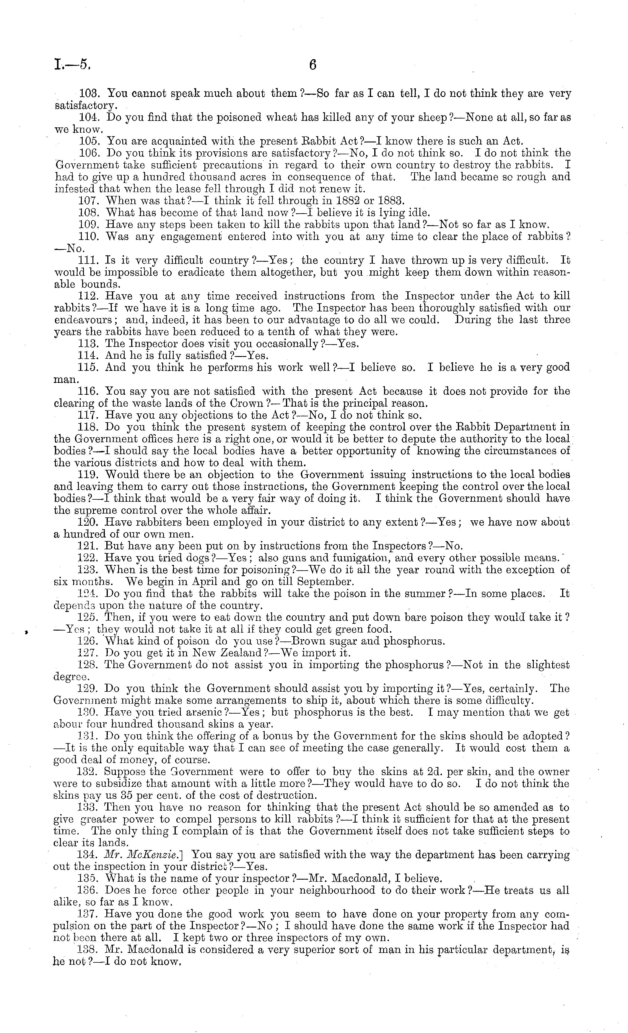 103. You cannot speak much about them ?—So far as I can tell, I do not think they are very satisfactory. 104. Do you find that the poisoned wheat has killed any of your sheep ?■—None at all, so far as we know. 105. You are acquainted with the present Babbit Act?'—l know there is such an Act. 106. Do you think its provisions are satisfactory?—No, Ido not think so. Ido not think the Government take sufficient precautions in regard to their own country to destroy the rabbits. I had to give up a hundred thousand acres in consequence of that. The land became so rough and infested that when the lease fell through I did not renew it. 107. When was that?—l think it fell through in 1882 or 1883. 108. What has become of that land now ?—I believe it is lying idle. 109. Have any steps been taken to kill the rabbits upon that land?— Not so far as I know. 110. Was any engagement entered into with you at any time to clear the place of rabbits ? —No. 111. Is it very difficult country ?—Yes; the country I have thrown up is very difficult. It would be impossible to eradicate them altogether, but you might keep them down within reasonable bounds. 112. Have you at any time received instructions from the Inspector under the Act to kill rabbits?—lf we have it is a long time ago. The Inspector has been thoroughly satisfied with our endeavours; and, indeed, it has been to our advantage to do all we could. During the last three years the rabbits have been reduced to a tenth of what they were. 113. The Inspector does visit you occasionally? —Yes. 114. And he is fully satisfied ? —Yes. 115. And you think he performs his work well ? —I believe so. I believe he is a very good man. 116. You say you are not satisfied with the present Act because it does not provide for the clearing of the waste lands of the Crown ? —That is the principal reason. 117. Have you any objections to the Act ? —No, I do not think so. 118. Do you think the present system of keeping the control over the Rabbit Department in the Government offices here is a right one, or would it be better to depute the authority to the local bodies ? —I should say the local bodies have a better opportunity of knowing the circumstances of the various districts and how to deal with them. 119. Would there be an objection to the Government issuing instructions to the local bodies and leaving them to carry out those instructions, the Government keeping the control over the local bodies?—l think that would be a very fair way of doing it. I think the Government should have the supreme control over the whole affair. 120. Have rabbiters been employed in your district to any extent ?—Yes ; we have now about a hundred of our own men. 121. But have any been put on by instructions from the Inspectors? —No. 122. Have you tried dogs? —Yes; also guns and fumigation, and every other possible means. 123. When is the best time for poisoning?—We do it all the year round with the exception of six months. We begin in April and go on till September. 124. Do you find that the rabbits will take the poison in the summer ? —ln some places. It depends upon the nature of the country. 125. Then, if you were to eat down the country and put down bare poison they would take it ? —Yes ; they would not take it at all if they could get green food. 126. What kind of poison do you use? —Brown sugar and phosphorus. 127. Do you get it in New Zealand ? —W'e import it. 128. The Government do not assist you in importing the phosphorus ?—Not in the slightest degree. 129. Do you think the Government should assist you by importing it ?—Yes, certainly. The Government might make some arrangements to ship it, about which there is some difficulty. 130. Have you tried arsenic ?—Yes; but phosphorus is the best. I may mention that we get abour four hundred thousand skins a year. 131. Do you think the offering of a bonus by the Government for the skins should be adopted? —It is the only equitable way that I can see of meeting the case generally. It would cost them a good deal of money, of course. 132. Suppose the Government were to offer to buy the skins at 2d. per skin, and the owner were to subsidize that amount with a little more ?—They would have to do so. Ido not think the skins pay us 35 per cent, of the cost of destruction. 133. Then you have no reason for thinking that the present Act should be so amended as to give greater power to compel persons to kill rabbits ?—I think it sufficient for that at the present time. The only thing I complain of is that the Government itself does not take sufficient steps to clear its lands. 134. Mr. McEenzie.] You say yon are satisfied with the way the department has been carrying out the inspection in your districi?—Yes. 135. What is the name of your inspector?— Mr. Macdonald, I believe. 136. Does he force other people in your neighbourhood to do their work ?—He treats us all alike, so far as I know. 137. Have you done the good work you seem to have done on your property from any compulsion on the part of the Inspector?—No ; I should have done the same work if the Inspector had not been there at all. I kept two or three inspectors of my own. 138. Mr. Macdonald is considered a very superior sort of man in his particular department, is he not ? —I do not know,