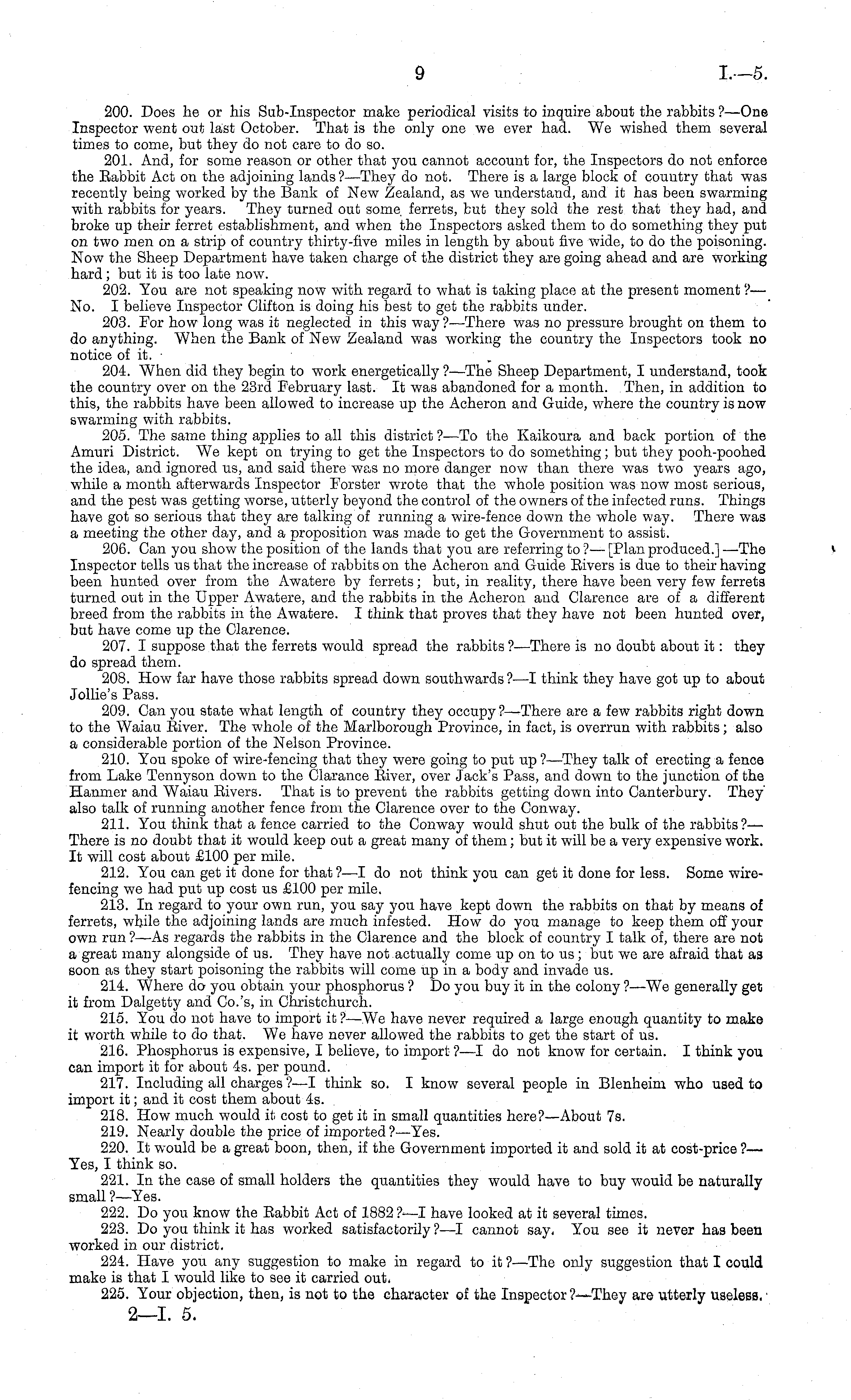 200. Does he or his Sub-Inspector make periodical visits to inquire about the rabbits ?—One Inspector went out last October. That is the only one we ever had.. We wished them several times to come, but they do not care to do so. 201. And, for some reason or other that you cannot account for, the Inspectors do not enforce the Eabbit Act on the adjoining lands? —They do not. There is a large block of country that was recently being worked by the Bank of New Zealand, as we understand, and it has been swarming with rabbits for years. They turned out some ferrets, but they sold the rest that they had, and broke up their ferret establishment, and when the Inspectors asked them to do something they put on two men on a strip of country thirty-five miles in length by about five wide, to do the poisoning. Now the Sheep Department have taken charge of the district they are going ahead and are working hard; but it is too late now. 202. You are not speaking now with regard to what is taking place at the present moment?— No. I believe Inspector Clifton is doing his best to get the rabbits under. 203. For how long was it neglected in this way?— There was no pressure brought on them to do anything. When the Bank of New Zealand was working the country the Inspectors took no notice of it. 204. When did they begin to work energetically ?—The Sheep Department, I understand, took the country over on the 23rd February last. It was abandoned for a month. Then, in addition to this, the rabbits have been allowed to increase up the Acheron and Guide, where the country is now swarming with rabbits. 205. The same thing applies to all this district ?—To the Kaikoura and back portion of the Amuri District. We kept on trying to get the Inspectors to do something; but they pooh-poohed the idea, and ignored us, and said there was no more danger now than there was two years ago, while a month afterwards Inspector Forster wrote that the whole position was now most serious, and the pest was getting worse, utterly beyond the control of the owners of the infected runs. Things have got so serious that they are talking of running a wire-fence down the whole way. There was a meeting the other day, and a proposition was made to get the Government to assist. 206. Can you show the position of the lands that you are referring to ? — [Plan produced.] —The Inspector tells us that the increase of rabbits on the Acheron and Guide Eivers is due to their having been hunted over from the Awatere by ferrets; but, in reality, there have been very few ferrets turned out in the Upper Awatere, and the rabbits in the Acheron and Clarence are of a different breed from the rabbits in the Awatere. I think that proves that they have not been hunted over, but have come up the Clarence. 207. I suppose that the ferrets would spread the rabbits ?- —There is no doubt about it: they do spread them. 208. How far have those rabbits spread down southwards? —I think they have got up to about Jollies Pass. 209. Can you state what length of country they occupy?— There are a few rabbits right down to the Waiau Biver. The whole of the Marlborough Province, in fact, is overrun with rabbits; also a considerable portion of the Nelson Province. 210. You spoke of wire-fencing that they were going to put up ?—They talk of erecting a fence from Lake Tennyson down to the Clarance Eiver, over Jack's Pass, and down to the junction of the Hanmer and Waiau Eivers. That is to prevent the rabbits getting down into Canterbury. They also talk of running another fence from the Clarence over to the Conway. 211. You think that a fence carried to the Conway would shut out the bulk of the rabbits?— There is no doubt that it would keep out a great many of them; but it will be a very expensive work. It will cost about £100 per mile. 212. You can get it done for that ?—I do not think you can get it done for less. Some wirefencing we had put up cost us £100 per mile. 213. In regard to your own run, you say you have kept down the rabbits on that by means of ferrets, while the adjoining lands are much infested. How do you manage to keep them off your own run ? —As regards the rabbits in the Clarence and the block of country I talk of, there are not a great many alongside of us. They have not actually come up on to us ; but we are afraid that as soon as they start poisoning the rabbits will come up in a body and invade us. 214. Where do you obtain your phosphorus ? Do you buy it in the colony ? —We generally get it from Dalgetty and Co.'s, in Christchurch. 215. You do not have to import it ?—We have never required a large enough quantity to make it worth while to do that. We have never allowed the rabbits to get the start of us. 216. Phosphorus is expensive, I believe, to import ?—I do not know for certain. I think you can import it for about 4s. per pound. 217. Including all charges ?—I think so. I know several people in Blenheim who used to import it; and it cost them about 4s. 218. How much would it cost to get it in small quantities here?— About 7s. 219. Nearly double the price of imported ?—Yes. 220. It would be a great boon, then, if the Government imported it and sold it at cost-price ?— Yes, I think so. 221. In the case of small holders the quantities they would have to buy would be naturally small ? —Yes. 222. Do you know the Eabbit Act of 1882 ?- —I have looked at it several times. 223. Do you think it has worked satisfactorily ?—I cannot say. You see it never has been worked in our district. 224. Have you any suggestion to make in regard to it ?—The only suggestion that I could make is that I would like to see it carried out. 225. Your objection, then, is not to the character of the Inspector ?—They are utterly useless.