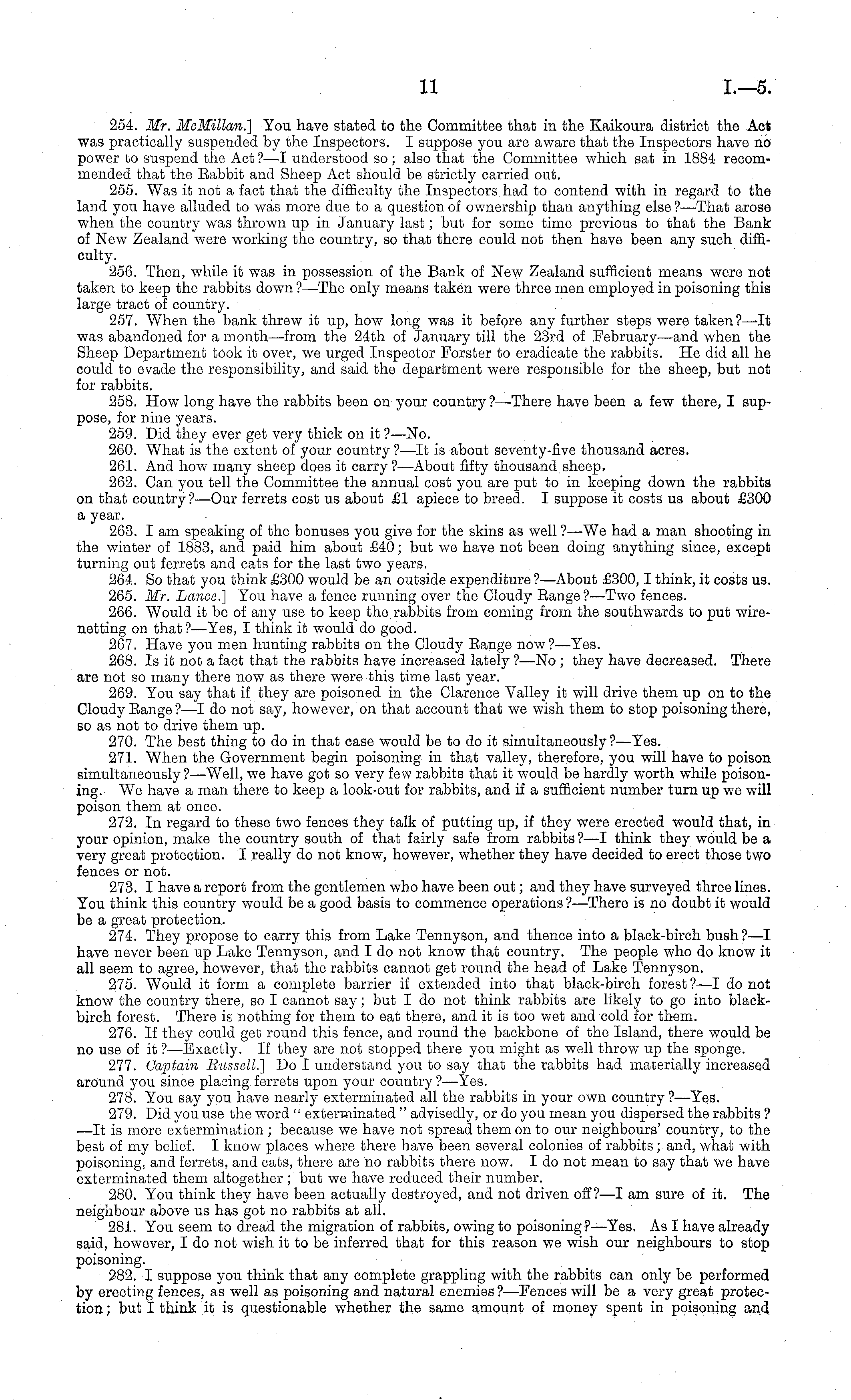 254. Mr. McMillan.] You have stated to the Committee that in the Kaikoura district the Act was practically suspended by the Inspectors. I suppose you are aware that the Inspectors have no power to suspend the Act ?—I understood so ; also that the Committee which sat in 1884 recommended that the Rabbit and Sheep Act should be strictly carried out. 255. Was it not a fact that the difficulty the Inspectors had to contend with in regard to the land you have alluded to was more due to a question of ownership than anything else ?—That arose when the country was thrown up in January last; but for some time previous to that the Bank of New Zealand were working the country, so that there could not then have been any such difficulty. 256. Then, while it was in possession of the Bank of New Zealand sufficient means were not taken to keep the rabbits down ?—-The only means taken were three men employed in poisoning this large tract of country. 257. When the bank threw it up, how long was it before any further steps were taken?—lt was abandoned for a month—from the 24th of January till the 23rd of February—and when the Sheep Department took it over, we urged Inspector Forster to eradicate the rabbits. He did all he could to evade the responsibility, and said the department were responsible for the sheep, but not for rabbits. 258. How long have the rabbits been on your country ?—There have been a few there, I suppose, for nine years. 259. Did they ever get very thick on it ? —No. 260. What is the extent of your country ?—lt is about seventy-five thousand acres. 261. And how many sheep does it carry?— About fifty thousand sheep, 262. Can you tell the Committee the annual cost you are put to in keeping down the rabbits on that country? —Our ferrets cost us about £1 apiece to breed. I suppose it costs us about £300 a year. 263. lam speaking of the bonuses you give for the skins as well ?—We had a man shooting in the winter of 1883, and paid him about £40; but we have not been doing anything since, except turning out ferrets and cats for the last two years. 264. So that you think £300 would be an outside expenditure ? —About £300,1 think, it costs us. 265. Mr. Lance.] You have a fence running over the Cloudy Range ? —Two fences. 266. Would it be of any use to keep the rabbits from coming from the southwards to put wirenetting on that ?—Yes, I think it would do good. 267. Have you men hunting rabbits on the Cloudy Range now?— Yes. 268. Is it not a fact that the rabbits have increased lately ?—No ; they have decreased. There are not so many there now as there were this time last year. 269. You say that if they are poisoned in the Clarence Valley it will drive them up on to the Cloudy Range ?—I do not say, however, on that account that we wish them to stop poisoning there, so as not to drive them up. 270. The best thing to do in that case would be to do it simultaneously?— Yes. 271. When the Government begin poisoning in that valley, therefore, you will have to poison simultaneously?— Well, we have got so very few rabbits that it would be hardly worth while poisoning. We have a man there to keep a look-out for rabbits, and if a sufficient number turn up we will poison them at once. 272. In regard to these two fences they talk of putting up, if they were erected would that, in your opinion, make the country south of that fairly safe from rabbits? —I think they would be a very great protection. I really do not know, however, whether they have decided to erect those two fences or not. 273. I have a report from the gentlemen who have been out; and they have surveyed three lines. You think this country would be a good basis to commence operations ?—There is no doubt it would be a great protection. 274. They propose to carry this from Lake Tennyson, and thence into a black-birch bush?—l have never been up Lake Tennyson, and Ido not know that country. The people who do know it all seem to agree, however, that the rabbits cannot get round the head of Lake Tennyson. 275. Would it form a complete barrier if extended into that black-birch forest?—l do not know the country there, so I cannot say; but I do not think rabbits are likely to go into blackbirch forest. There is nothing for them to eat there, and it is too wet and cold for them. 276. If they could get round this fence, and round the backbone of the Island, there would be no use of it ? —Exactly. If they are not stopped there you might as well throw up the sponge. 277. Captain Russell.] Do I understand you to say that the rabbits had materially increased around you since placing ferrets upon your country ?—Yes. 278. You say you have nearly exterminated all the rabbits in your own country ?—Yes. 279. Did you use the word " exterminated " advisedly, or do you mean you dispersed the rabbits ? —It is more extermination ; because we have not spread them on to our neighbours' country, to the best of my belief. I know places where there have been several colonies of rabbits; and, what with poisoning, and ferrets, and cats, there are no rabbits there now. Ido not mean to say that we have exterminated them altogether ; but we have reduced their number. 280. You think they have been actually destroyed, and not driven off?—l am sure of it. The neighbour above us has got no rabbits at all. 281. You seem to dread the migration of rabbits, owing to poisoning?— Yes. As I have already said, however, I do not wish it to be inferred that for this reason we wish our neighbours to stop poisoning. 282. I suppose you think that any complete grappling with the rabbits can only be performed by erecting fences, as well as poisoning and natural enemies ? —Fences will be a very great protection ; but I think it is questionable whether the same amount of money spent in poisoning and