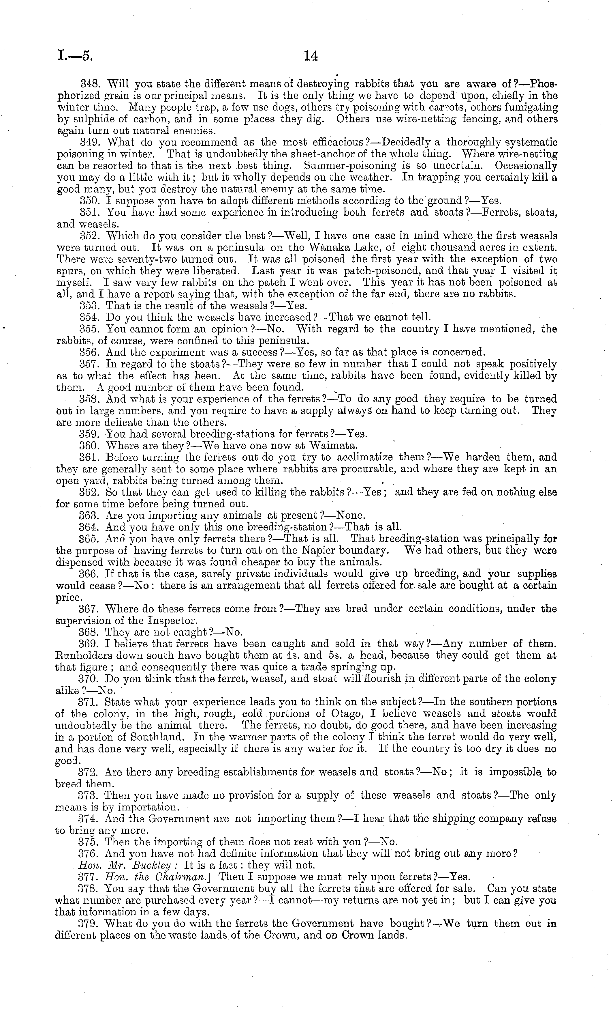 348. Will you state the different means of destroying rabbits that you are aware of?—Phosphorized grain is our principal means. It is the only thing we have to depend upon, chiefly in the winter time. Many people trap, a few use dogs, others try poisoning with carrots, others fumigating by sulphide of carbon, and in some places they dig. Others use wire-netting fencing, and others again turn out natural enemies. 349. What do you recommend as the most efficacious ?—Decidedly a thoroughly systematic poisoning in winter. That is undoubtedly the sheet-anchor of the whole thing. Where wire-netting can be resorted to that is the next best thing. Summer-poisoning is so uncertain. Occasionally you may do a little with it; but it wholly depends on the weather. In trapping you certainly kill a good many, but you destroy the natural enemy at the same time. 350. I suppose you have to adopt different methods according to the ground ? —Yes. 351. You have had some experience in introducing both ferrets and stoats?— Ferrets, stoats, and weasels. 352. Which do you consider the best ?—Well, I have one case in mind where the first weasels were turned out. It was on a peninsula on the Wanaka Lake, of eight thousand acres in extent. There were seventy-two turned out. It was all poisoned the first year with the exception of two spurs, on which they were liberated. Last year it was patch-poisoned, and that year I visited it myself. I saw very few rabbits on the patch I went over. This year it has not been poisoned at all, and I have a report saying that, with the exception of the far end, there are no rabbits. 353. That is the result of the weasels ? —Yes. 354. Do you think the weasels have increased ?—That we cannot tell. 355. You cannot form an opinion ? —No. With regard to the country I have mentioned, the rabbits, of course, were confined to this peninsula. 356. And the experiment was a success ?—Yes, so far as that place is concerned. 357. In regard to the stoats ?--They were so few in number that I could not speak positively as to what the effect has been. At the same time, rabbits have been found, evidently killed by them. A good number of them have been found. • 358. And what is your experience of the ferrets? —To do any good they require to be turned out in large numbers, and you require to have a supply always on hand to keep turning out. They are more delicate than the others. 359. You had several breeding-stations for ferrets ? —Yes. 360. Where are they ? —We have one now at Waimata. 361. Before turning the ferrets out do you try to acclimatize them?—We harden them, and they are generally sent to some place where rabbits are procurable, and where they are kept in an open yard, rabbits being turned among them. 362. So that they can get used to killing the rabbits ?—Yes; and they are fed on nothing else for some time before being turned out. 363. Are you importing any animals at present ?—None. 364. And you have only this one breeding-station ?—That is all. 365. And you have only ferrets there ?—That is all. That breeding-station was principally for the purpose of having ferrets to turn out on the Napier boundary. We had others, but they were dispensed with because it was found cheaper to buy the animals. 366. If that is the case, surely private individuals would give up breeding, and your supplies would cease ?—No : there is an arrangement that all ferrets offered for. sale are bought at a certain price. 367. Where do these ferrets come from?— They are bred under certain conditions, under the supervision of the Inspector. 368. They are not caught ?—No. 369. I believe that ferrets have been caught and sold in that way?— Any number of them. Eunholders down south have bought them at 4s. and ss. a head, because they could get them at that figure ; and consequently there was quite a trade springing up. 370. Do you think that the ferret, weasel, and stoat will nourish in different parts of the colony alike ?—No. 371. State what your experience leads you to think on the subject?—ln the southern portions of the colony, in the high, rough, cold portions of Otago, I believe weasels and stoats would undoubtedly be the animal there. The ferrets, no doubt, do good there, and have been increasing in a portion of Southland. In the warmer parts of the colony I think the ferret would do very well, and has done very well, especially if there is any water for it. If the country is too dry it does no good. 372. Are there any breeding establishments for weasels and stoats ?—No; it is impossible to breed them. 373. Then you have made no provision for a supply of these weasels and stoats?— The only means is by importation. 374. And the Government are not importing them ?—I hear that the shipping company refuse to bring any more. 375. Then the importing of them does not rest with you ?—No. 376. And you have not had definite information that they will not bring out any more? Hon. Mr. Buckley : It is a fact : they will not. 377. Hon. the Chairman.] Then I suppose we must rely upon ferrets ? —Yes. 378. You say that the Government buy all the ferrets that are offered for sale. Can you state what number are purchased every year ?—I cannot—my returns are not yet in; but I can give you that information in a few days. 379. What do you do with the ferrets the Government have bought?—We turn them out in different places on the waste lands, of the Crown, and on Crown lands.