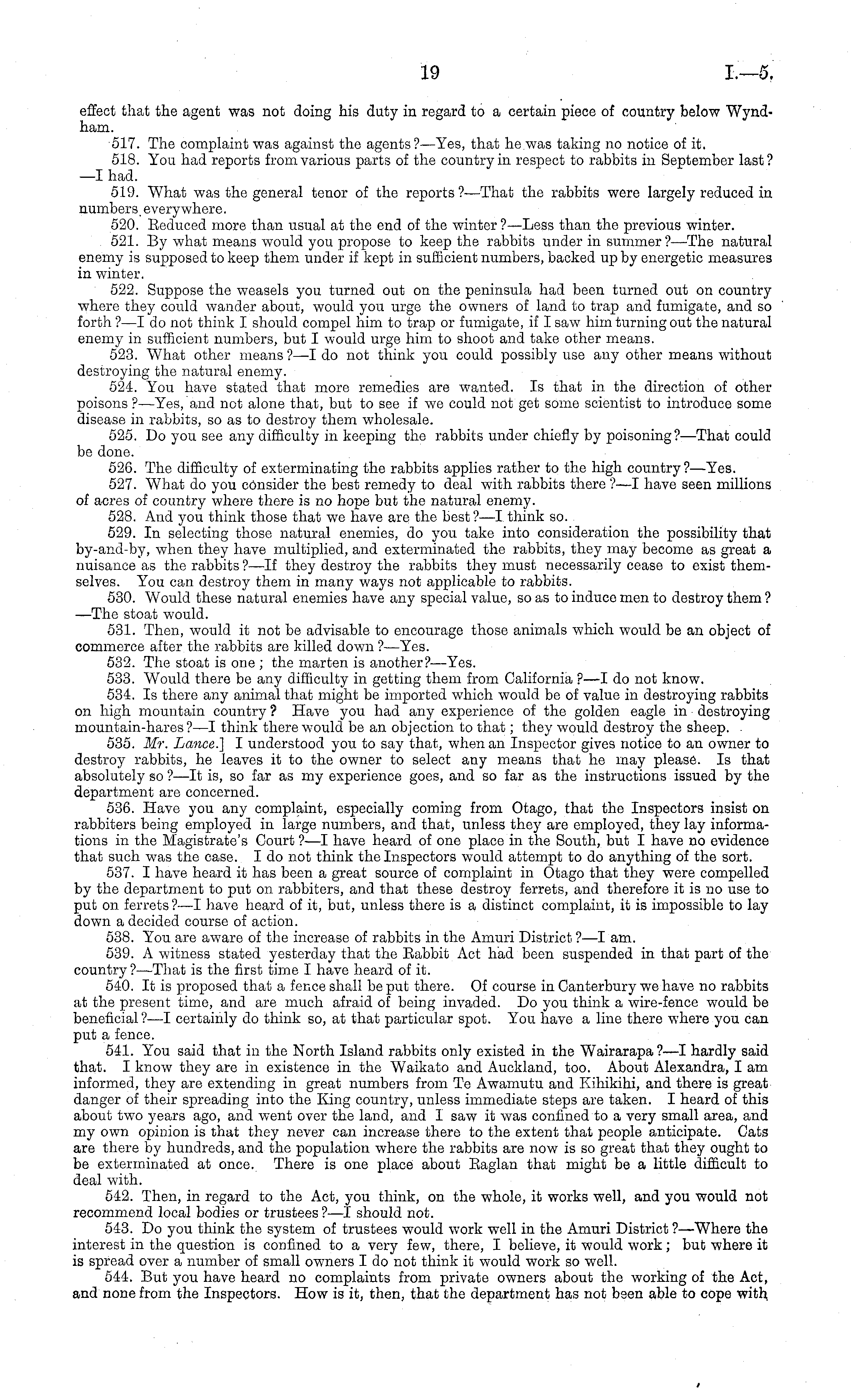 effect that the agent was not doing his duty in regard to a certain piece of country below Wyndham. 517. The complaint was against the agents?— Yes, that he .was taking no notice of it. 518. You had reports from various parts of the country in respect to rabbits in September last? —I had. 519. What was the general tenor of the reports?— That the rabbits were largely reduced in numbers everywhere. 520. Reduced more than usual at the end of the winter ?—Less than the previous winter. 521. By what means would you propose to keep the rabbits under in summer?— The natural enemy is supposed to keep them under if kept in sufficient numbers, backed up by energetic measures in winter. 522. Suppose the weasels you turned out on the peninsula had been turned out on country where they could wander about, would you urge the owners of land to trap and fumigate, and so forth ?—I do not think I should compel him to trap or fumigate, if I saw him turning out the natural enemy in sufficient numbers, but I would urge him to shoot and take other means. 523. What other means ?—I do not think you could possibly use any other means without destroying the natural enemy. 524. You have stated that more remedies are wanted. Is that in the direction of other poisons ? —Yes, and not alone that, but to see if we could not get some scientist to introduce some disease in rabbits, so as to destroy them wholesale. 525. Do you see any difficulty in keeping the rabbits under chiefly by poisoning?— That could be done. 526. The difficulty of exterminating the rabbits applies rather to the high country?— Yes. 527. What do you consider the best remedy to deal with rabbits there ?—I have seen millions of acres of country where there is no hope but the natural enemy. 528. And you think those that we have are the best?—l think so. 529. In selecting those natural enemies, do you take into consideration the possibility that by-and-by, when they have multiplied, and exterminated the rabbits, they may become as great a nuisance as the rabbits ? —lf they destroy the rabbits they must necessarily cease to exist themselves. You can destroy them in many ways not applicable to rabbits. 530. Would these natural enemies have any special value, so as to induce men to destroy them ? —The stoat would. 531. Then, would it not be advisable to encourage those animals which would be an object of commerce after the rabbits are killed down ?—Yes. 532. The stoat is one ; the marten is another?— Yes. 533. Would there be any difficulty in getting them from California ? —I do not know. 534. Is there any animal that might be imported which would be of value in destroying rabbits on high mountain country ? Have you had any experience of the golden eagle in destroying mountain-hares ? —I think there would be an objection to that; they would destroy the sheep. 535. Mr. Lance.] I understood you to say that, when an Inspector gives notice to an owner to destroy rabbits, he leaves it to the owner to select any means that he may please. Is that absolutely so ?—lt is, so far as my experience goes, and so far as the instructions issued by the department are concerned. 536. Have you any complaint, especially coming from Otago, that the Inspectors insist on rabbiters being employed in large numbers, and that, unless they are employed, they lay informations in the Magistrate's Court ? —I have heard of one place in the South, but I have no evidence that such was the case. Ido not think the Inspectors would attempt to do anything of the sort. 537. I have heard it has been a great source of complaint in Otago that they were compelled by the department to put on rabbiters, and that these destroy ferrets, and therefore it is no use to put on ferrets ?—I have heard of it, but, unless there is a distinct complaint, it is impossible to lay down a decided course of action. 538. You are aware of the increase of rabbits in the Amuri District ?—I am. 539. A witness stated yesterday that the Rabbit Act had been suspended in that part of the country?— That is the first time I have heard of it. 540. It is proposed that a fence shall be put there. Of course in Canterbury we have no rabbits at the present time, and are much afraid of being invaded. Do you think a wire-fence would be beneficial ?—I certainly do think so, at that particular spot. You have a line there where you can put a fence. 541. You said that in the North Island rabbits only existed in the Wairarapa ?—I hardly said that. I know they are in existence in the Waikato and Auckland, too. About Alexandra, lam informed, they are extending in great numbers from Tβ Awamutu and Kihikihi, and there is great danger of their spreading into the King country, unless immediate steps are taken. I heard of this about two years ago, and went over the land, and I saw it was confined to a very small area, and my own opinion is that they never can increase there to the extent that people anticipate. Cats are there by hundreds, and the population where the rabbits are now is so great that they ought to be exterminated at once. There is one place about Raglan that might be a little difficult to deal with. 542. Then, in regard to the Act, you think, on the whole, it works well, and you would not recommend local bodies or trustees? —I should not. 543. Do you think the system of trustees would work well in the Amuri District ?—Where the interest in the question is confined to a very few, there, I believe, it would work; but where it is spread over a number of small owners I do not think it would work so well. 544. But you have heard no complaints from private owners about the working of the Act, and none from the Inspectors. How is it, then, that the department has not bsen able to cope with