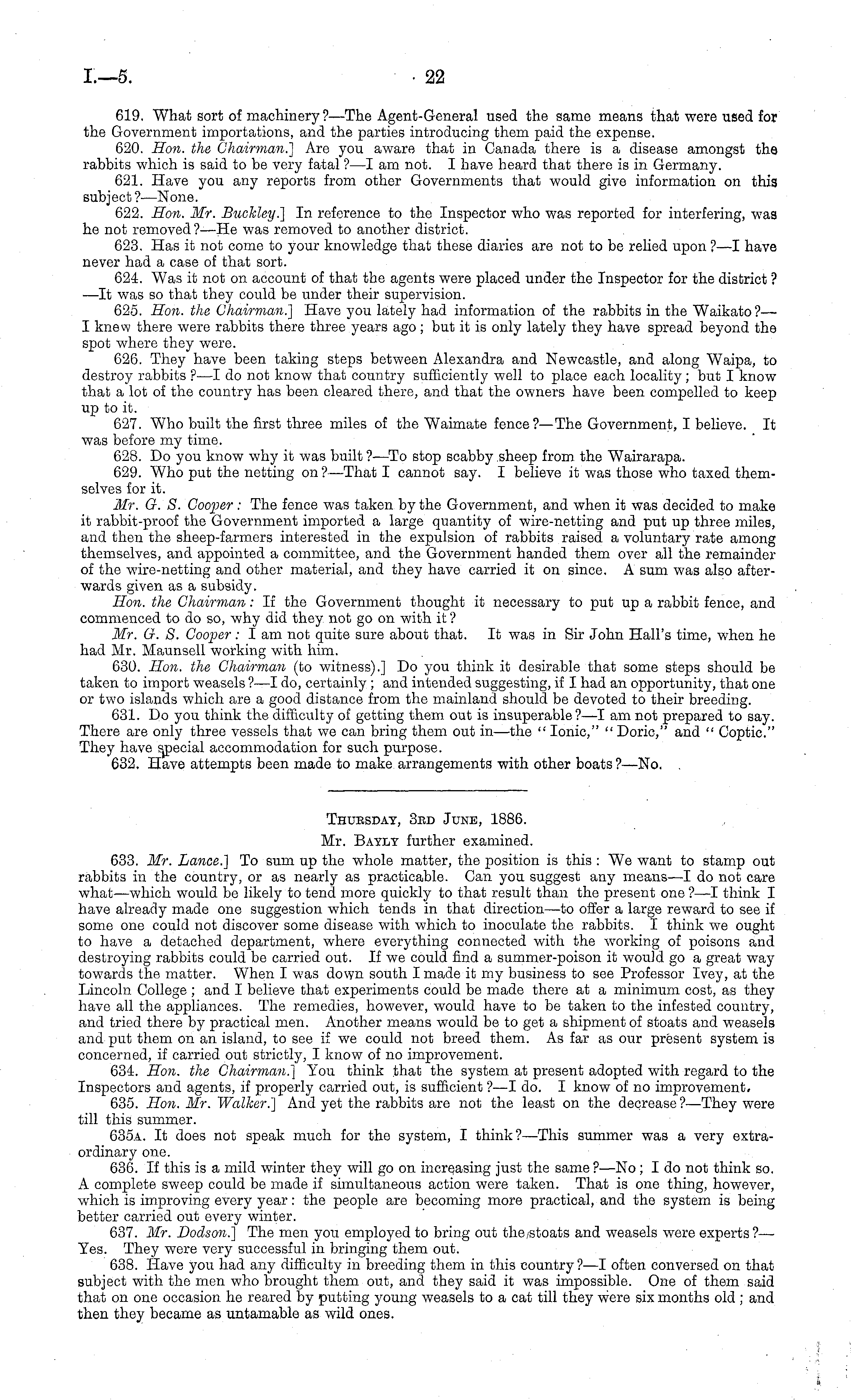619. What sort of machinery?— The Agent-General used the same means that were used for the Government importations, and the parties introducing them paid the expense. 620. Hon. the Chairman.] Are you aware that in Canada there is a disease amongst the rabbits which is said to be very fatal ?—I am not. I have heard that there is in Germany. 621. Have you any reports from other Governments that would give information on this subject ? —None. 622. Hon. Mr. Buckley.] In reference to the Inspector who was reported for interfering, waa he not removed?—He was removed to another district. 623. Has it not come to your knowledge that these diaries are not to be relied upon ? —I have never had a case of that sort. 624. Was it not on account of that the agents were placed under the Inspector for the district ? —It was so that they could be under their supervision. 625. Hon. the Chairman.] Have you lately had information of the rabbits in the Waikato?— I knew there were rabbits there three years ago; but it is only lately they have spread beyond the spot where they were. 626. They have been taking steps between Alexandra and Newcastle, and along Waipa, to destroy rabbits ? —I do not know that country sufficiently well to place each locality; but I know that a lot of the country has been cleared there, and that the owners have been compelled to keep up to it. 627. Who built the first three miles of the Waimate fence ? —The Government, I believe. It was before my time. 628. Do you know why it was built ?—To stop scabby sheep from the Wairarapa. 629. Who put the netting on ?—That I cannot say. I believe it was those who taxed themselves for it. Mr. G. S. Cooper: The fence was taken by the Government, and when it was decided to make it rabbit-proof the Government imported a large quantity of wire-netting and put up three miles, and then the sheep-farmers interested in the expulsion of rabbits raised a voluntary rate among themselves, and appointed a committee, and the Government handed them over all the remainder of the wire-netting and other material, and they have carried it on since. A sum was also afterwards given as a subsidy. Hon. the Chairman: If the Government thought it necessary to put up a rabbit fence, and commenced to do so, why did they not go on with it ? Mr. G. S. Cooper: lam not quite sure about that. It was in Sir John Hall's time, when he had Mr. Maunsell working with him. 630. Hon. the Chairman (to witness).] Do you think it desirable that some steps should be taken to import weasels ?—I do, certainly ; and intended suggesting, if I had an opportunity, that one or two islands which are a good distance from the mainland should be devoted to their breeding. 631. Do you think the difficulty of getting them out is insuperable?—l am not prepared to say. There are only three vessels that we can bring them out in—the " lonic," " Doric," and " Coptic." They have special accommodation for such purpose. 632. Have attempts been made to make arrangements with other boats ?—No,