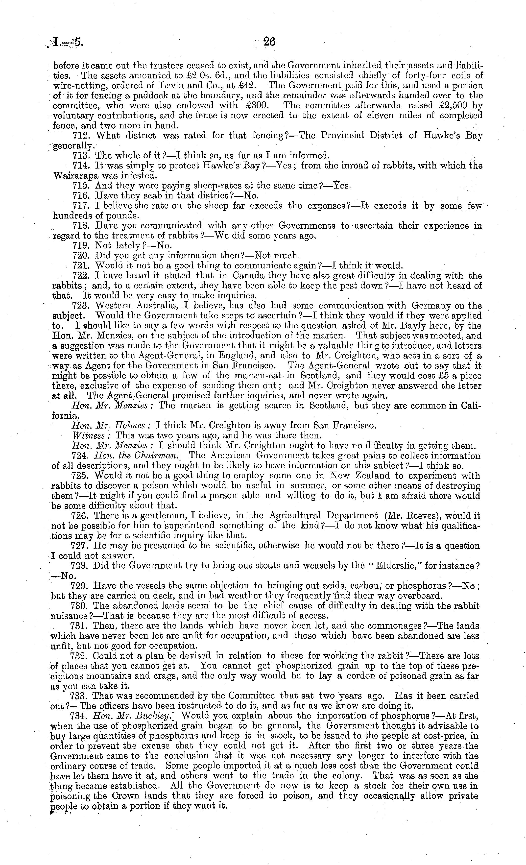 before it came out the trustees ceased to exist, and the Government inherited their assets and liabilities. The assets amounted to £2 Os. 6d., and the liabilities consisted chiefly of forty-four coils of wire-netting, ordered of Levin and Co., at £42. The Government paid for this, and used a portion of it for fencing a paddock at the boundary, and the remainder was afterwards handed over to the committee, who were also endowed with £300. The committee afterwards raised £2,500 by voluntary contributions, and the fence is now erected to the extent of eleven miles of completed fence, and two more in hand. 712. What district was rated for that fencing?— The Provincial District of Hawke's Bay generally. 713. The whole of it ? —I think so, as far as I am informed. 714. It was simply to protect Hawke's Bay?— Yes; from the inroad of rabbits, with which the Wairarapa was infested. 715. And they were paying sheep-rates at the same time?— Yes. 716. Have they scab in that district ?—No. 717. I believe the rate on the sheep far exceeds the expenses?—lt exceeds it by some few hundreds of pounds. 718. Have you communicated with any other Governments to ascertain their experience in regard to the treatment of rabbits ?—We did some years ago. 719. Not lately?— No. 720. Did you get any information then?— Not much. 721. Would it not be a good thing to communicate again?—l think it would. 722. I have heard it stated that in Canada they have also great difficulty in dealing with the rabbits ; and, to a certain extent, they have been able to keep the pest down?—l have not heard of that. It would be very easy to make inquiries. 723. Western Australia, I believe, has also had some communication with Germany on the subject. Would the Government take steps to ascertain ?—I think they would if they were applied to. I should like to say a few words with respect to the question asked of Mr. Bayly here, by the Hon. Mr. Menzies, on the subject of the introduction of the marten. That subject was mooted, and a suggestion was made to the Government that it might be a valuable thing to introduce, and letters were written to the Agent-General, in England, and also to Mr. Creighton, who acts in a sort of a way as Agent for the Government in San Francisco. The Agent-General wrote out to say that it might be possible to obtain a few of the marten-cat in Scotland, and they would cost £5 a piece there, exclusive of the expense of sending them out; and Mr. Creighton never answered the letter at all. The Agent-General promised further inquiries, and never wrote again. Hon. Mr. Menzies : The marten is getting scarce in Scotland, but they are common in California. Hon. Mr. Holmes : I think Mr. Creighton is away from San Francisco. Witness : This was two years ago, and he was there then. Hon. Mr. Menzies : I should think Mr. Creighton ought to have no difficulty in getting them. 724. Hon. the Chairman.] The American Government takes great pains to collect information of all descriptions, and they ought to be likely to have information on this subiect ?—I think so. 725. Would it not be a good thing to employ some one in New Zealand to experiment with rabbits to discover a poison which would be useful in summer, or some other means of destroying them ?—lt might if you could find a person able and willing to do it, but I am afraid there would be some difficulty about that. 726. There is a gentleman, I believe, in the Agricultural Department (Mr. Beeves), would it not be possible for him to superintend something of the kind ? —I do not know what his qualifications may be for a scientific inquiry like that. 727. He may be presumed to be scientific, otherwise he would not be there ?—lt is a question I could not answer. 728. Did the Government try to bring out stoats and weasels by the " Elderslie," for instance ? —No. 729. Have the vessels the same objection to bringing out acids, carbon, or phosphorus ?—No ; but they are carried on deck, and in bad weather they frequently find their way overboard. 730. The abandoned lands seem to be the chief cause of difficulty in dealing with the rabbit nuisance ? —That is because they are the most difficult of access. 731. Then, there are the lands which have never been let, and the commonages?— The lands which have never been let are unfit for occupation, and those which have been abandoned are less unfit, but not good for occupation. 732. Could not a plan be devised in relation to these for working the rabbit ?—There are lots of places that you cannot get at. You cannot get phosphorized- grain up to the top of these precipitous mountains and crags, and the only way would be to lay a cordon of poisoned grain as far as you can take it. 733. That was recommended by the Committee that sat two years ago. Has it been carried out ? —The officers have been instructed to do it, and as far as we know are doing it. 734. Hon. Mr. Buckley.] Would you explain about the importation of phosphorus ?—At first, when the use of phosphorized grain began to be general, the Government thought it advisable to buy large quantities of phosphorus and keep it in stock, to be issued to the people at cost-price, in order to prevent the excuse that they could not get it. After the first two or three years the Governmeut came to the conclusion that it was not necessary any longer to interfere with the ordinary course of trade. Some people imported it at a much less cost than the Government could have let them have it at, and others went to the trade in the colony. That was as soon as the thing became established. All the Government do now is to keep a stock for their own use in poisoning the Crown lands that they are forced to poison, and they occasionally allow private people to obtain a portion if they want it.