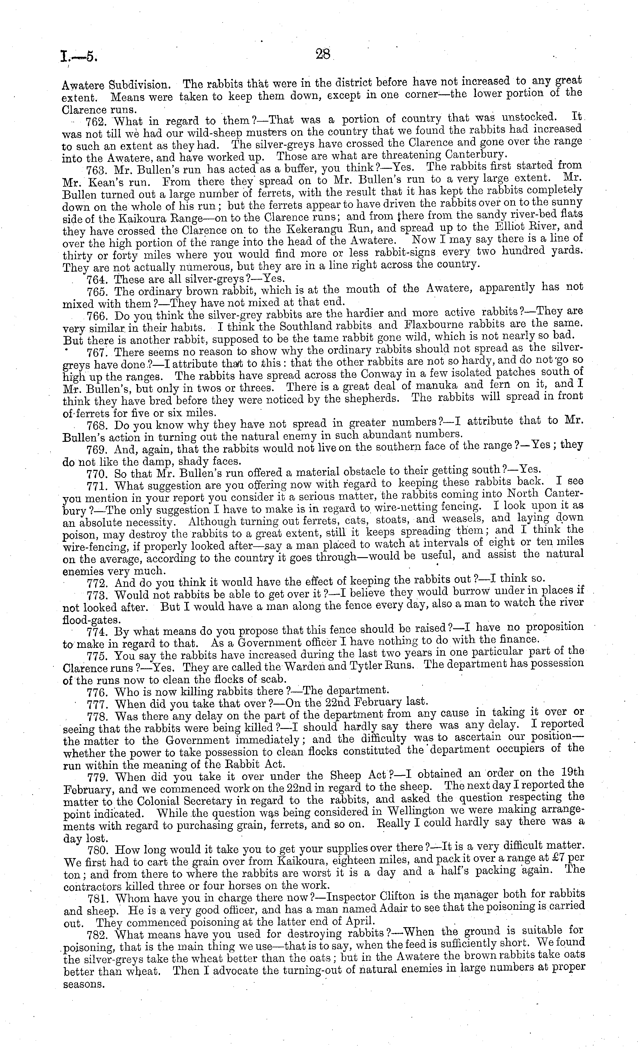 Awatere Subdivision. The rabbits that were in the district before have not increased to _ any great extent. Means were taken to keep them down, except in one corner—the lower portion of the Clarence runs. . , , T , 762 What in regard to them?— That was a portion of country that was unstocked. it. was not till we had our wild-sheep musters on the country that we found the rabbits had increased to such an extent as they had. The silver-greys have crossed the Clarence and gone over the range into the Awatere, and have worked up. Those are what are threatening Canterbury. 763. Mr. Bullen's run has acted as a buffer, you think?— Yes. The rabbits first started from Mr Kean's run. From there they' spread on to Mr. Bullen's run to a very large extent. Mr. Bullen turned out a large number of ferrets, with the result that it has kept the rabbits completely down on the whole of his run ; but the ferrets appear to have driven the rabbits over on to the sunny side of the Kaikoura Eange—on to the Clarence runs; and from fhere from the sandy river-bed flats they have crossed the Clarence on to the Kekerangu Eun, and spread up to the Elliot Biver, and over the high portion of the range into the head of the Awatere. Now I may say there is a line o± thirty or forty miles where you would find more or less rabbit-signs every two hundred yards. They are not actually numerous, but they are in a line right across the country. 764. These are all silver-greys?— Yes. 765. The ordinary brown rabbit, which is at the mouth of the Awatere, apparently has not mixed with them ?—They have not mixed at that end. _ 766 Do you think the silver-grey rabbits are the hardier and more active rabbits ! —±hey are very similar, in their habits. I think the Southland rabbits and Flaxbourne rabbits are the same. But there is another rabbit, supposed to be the tame rabbit gone wild, which is not nearly so bad. 767 There seems no reason to show why the ordinary rabbits should not spread as the silvergreys have done,?—l attribute that to this : that the other rabbits are not so hardy, and do not-go so high up the ranges. The rabbits have spread across the Conway in a few isolated patches _ south_ot Mr. Bullen's, but only in twos or threes. There is a great deal of manuka and fern on it, and 1 think they have bred before they were noticed by the shepherds. The rabbits will spread in front of ferrets for five or six miles. , .._ 768. Do you know why they have not spread in greater numbers?—! attribute that to Mr. Bullen's action in turning out the natural enemy in such abundant numbers. 769. And, again, that the rabbits would not live on the southern face of the range ?— Yes ; they do not like the damp, shady faces. . 770. So that Mr. Bullen's run offered a material obstacle to their getting south.' , — 1 es. 771. What suggestion are you offering now with regard to keeping these rabbits back 1 see you mention in your report you consider it a serious matter, the rabbits coming into North Canterbury ?—The only suggestion I have to make is in regard to. wire-netting fencing. I look upon it as an absolute necessity. Although turning out ferrets, cats, stoats, and weasels, and laying down poison may destroy the rabbits to a great extent, still it keeps spreading them; and 1 think the wire-fencing, if properly looked after—say a man placed to watch at intervals of eight or ten miles on the average, according to the country it goes through—would be useful, and assist the natural enemies very much. , . . 772 And do you think it would have the effect of keeping the rabbits out ?—I think so. 773 Would not rabbits be able to get over it ?—I believe they would burrow under in places if not looked after. But I would have a man along the fence every day, also a man to watch the river 774. By what means do you propose that this fence should be raised?—l have no proposition to make in regard to that. As a Government officer I have nothing to do with the finance. 775 You say the rabbits have increased during the last two years m one particular part of the Clarence runs ?—Yes. They are called the Warden and Tytler Buns. The department has possession of the runs now to clean the flocks of scab. 776. Who is now killing rabbits there ?—The department. ■ 777 When did you take that over ?—On the 22nd February last. 778 Was there any delay on the part of the department from any cause m taking it over or seeing that the rabbits were being killed ?—I should hardly say there was any delay. I reported the matter to the Government immediately; and the difficulty was to ascertain our_ position— whether the power to take possession to clean flocks constituted the department occupiers of the run within the meaning of the Eabbit Act. 779 When did you take it over under the Sheep Act ?—I obtained an order on the 19th February, and we commenced work on the 22nd in regard to the sheep. The next day I reported the matter to the Colonial Secretary in regard to the rabbits, and asked the question respecting the point indicated. While the question was being considered in Wellington we were making arrangements with regard to purchasing grain, ferrets, and so on. Eeally I could hardly say there was a 780' How long would it take you to get your supplies over there ?—lt is a very difficult matter. We first had to cart the grain over from Kaikoura, eighteen miles, and pack it over a range at £7 per ton; and from there to where the rabbits are worst it is a day and a half's packing again. Ine contractors killed three or four horses on the work. • 781. Whom have you in charge there now ?—lnspector Clifton is the manager both for rabbits and sheep. He is a very good officer, and has a man named Adair to see that the poisoning is carried out They commenced poisoning at the latter end of April. . 782. What means have you used for destroying rabbits ?—When the ground is suitable for poisoning, that is the main thing we use—tha
