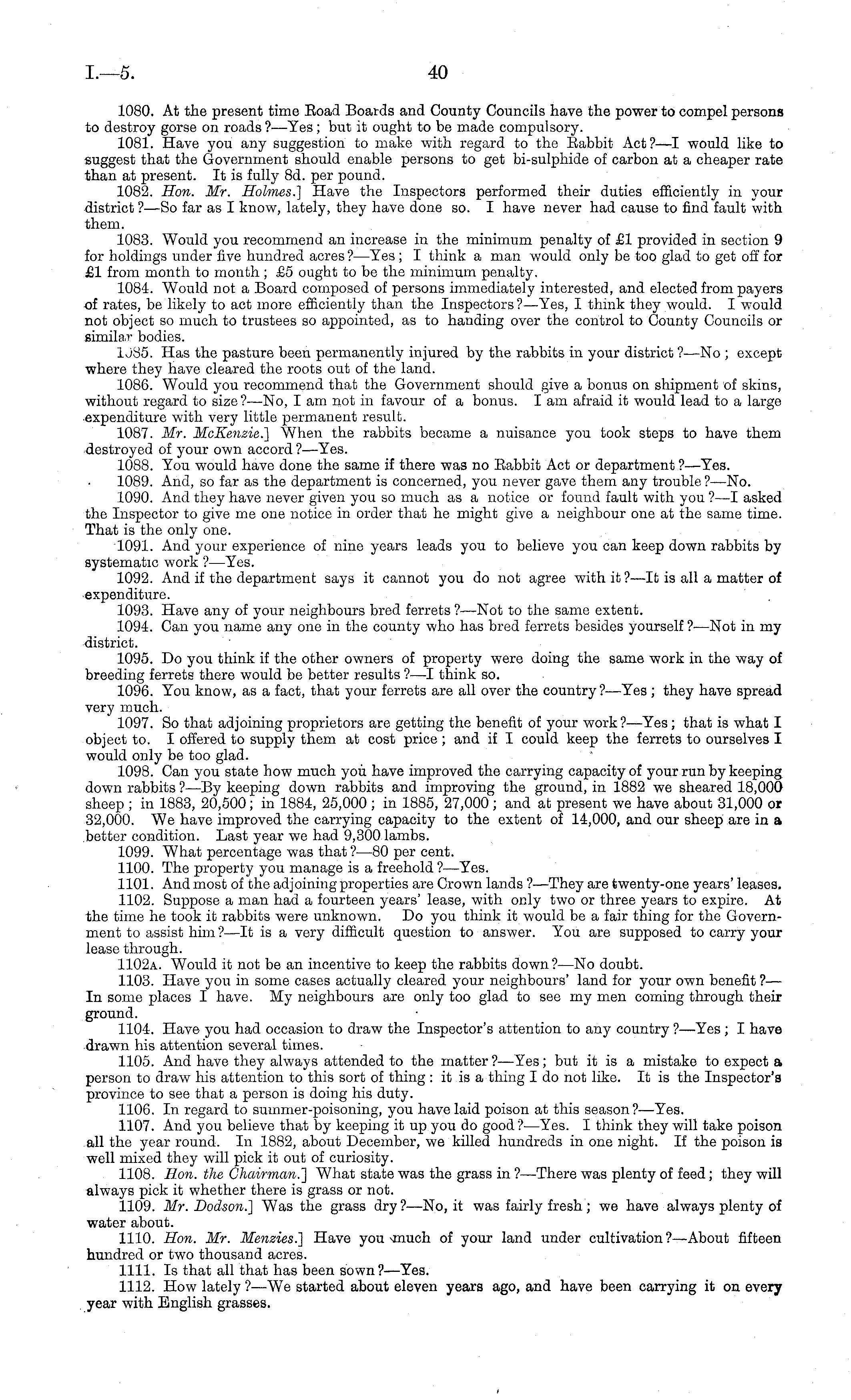 1080. At the present time Eoad Boards and County Councils have the power to compel persons to destroy gorse on roads ?—Yes; but it ought to be made compulsory. 1081. Have you any suggestion to make with regard to the Eabbit Act?—l would like to suggest that the Government should enable persons to get bi-sulphide of carbon at a cheaper rate than at present. It is fully Bd. per pound. 1082. Hon. Mr. Holmes.] Have the Inspectors performed their duties efficiently in your district ? —So far as I know, lately, they have done so. I have never had cause to find fault with them. 1083. Would you recommend an increase in the minimum penalty of £1 provided in section 9 for holdings under five hundred acres ? —Yes ; I think a man would only be too glad to get off for £1 from month to month; £5 ought to be the minimum penalty. 1084. Would not a Board composed of persons immediately interested, and elected from payers of rates, be likely to act more efficiently than the Inspectors?— Yes, I think they would. I would not object so much to trustees so appointed, as to handing over the control to County Councils or similar bodies. IJBS. Has the pasture been permanently injured by the rabbits in your district ?—No ; except where they have cleared the roots out of the land. 1086. Would you recommend that the Government should give a bonus on shipment of skins, without regard to size ?—No, lam not in favour of a bonus. lam afraid it would lead to a large expenditure with very little permanent result. 1087. Mr. McEe?izie.] When the rabbits became a nuisance you took steps to have them destroyed of your own accord ?—Yes. 1088. You would have done the same if there was no Eabbit Act or department ?—Yes. 1089. And, so far as the department is concerned, you never gave them any trouble ? —No. 1090. And they have never given you so much as a notice or found fault with you ?—I asked the Inspector to give me one notice in order that he might give a neighbour one at the same time. That is the only one. 1091. And your experience of nine years leads you to believe you can keep down rabbits by systematic work ?—Yes. 1092. And if the department says it cannot you do not agree with it?—lt is all a matter of expenditure. 1093. Have any of your neighbours bred ferrets ?—Not to the same extent. 1094. Can you name any one in the county who has bred ferrets besides yourself ? —Not in my district. 1095. Do you think if the other owners of property were doing the same work in the way of breeding ferrets there would be better results ?—I think so. 1096. You know, as a fact, that your ferrets are all over the country ?—Yes ; they have spread very much. 1097. So that adjoining proprietors are getting the benefit of your work?— Yes; that is what I object to. I offered to supply them at cost price ; and if I could keep the ferrets to ourselves I would only be too glad. 1098. Can you state how much you have improved the carrying capacity of your run by keeping down rabbits ? —By keeping down rabbits and improving the ground, in 1882 we sheared 18,000 sheep ; in 1883, 20,500; in 1884, 25,000 ; in 1885, 27,000 ; and at present we have about 31,000 or 32,000. We have improved the carrying capacity to the extent of 14,000, and our sheep are in a better condition. Last year we had 9,300 lambs. 1099. What percentage was that ?—BO per cent. 1100. The property you manage is a freehold ?—Yes. 1101. And most of the adjoining properties are Crown lands ?—They are twenty-one years' leases. 1102. Suppose a man had a fourteen years' lease, with only two or three years to expire. At the time he took it rabbits were unknown. Do you think it would be a fair thing for the Government to assist him ?—lt is a very difficult question to answer. You are supposed to carry your lease through. 1102 a. Would it not be an incentive to keep the rabbits down ?—No doubt. 1103. Have you in some cases actually cleared your neighbours' land for your own benefit ?— In some places I have. My neighbours are only too glad to see my men coming through their ground. 1104. Have you had occasion to draw the Inspector's attention to any country ? —Yes ; I have drawn his attention several times. 1105. And have they always attended to the matter?— Yes; but it is a mistake to expect a person to draw his attention to this sort of thing :itis a thing Ido not like. It is the Inspector's province to see that a person is doing his duty. 1106. In regard to summer-poisoning, you have laid poison at this season? —Yes. 1107. And you believe that by keeping it up you do good ?—Yes. I think they will take poison all the year round. In 1882, about December, we killed hundreds in one night. If the poison is well mixed they will pick it out of curiosity. 1108. Hon. the Chairman.'] What state was the grass in ? —There was plenty of feed; they will always pick it whether there is grass or not. 1109. Mr. Dodson.] Was the grass dry ?—No, it was fairly fresh ; we have always plenty of water about. 1110. Hon. Mr. Menzies.] Have you -much of your land under cultivation?— About fifteen hundred or two thousand acres. 1111. Is that all that has been sown?— Yes. 1112. How lately ?—We started about eleven years ago, and have been carrying it on every year with English grasses.