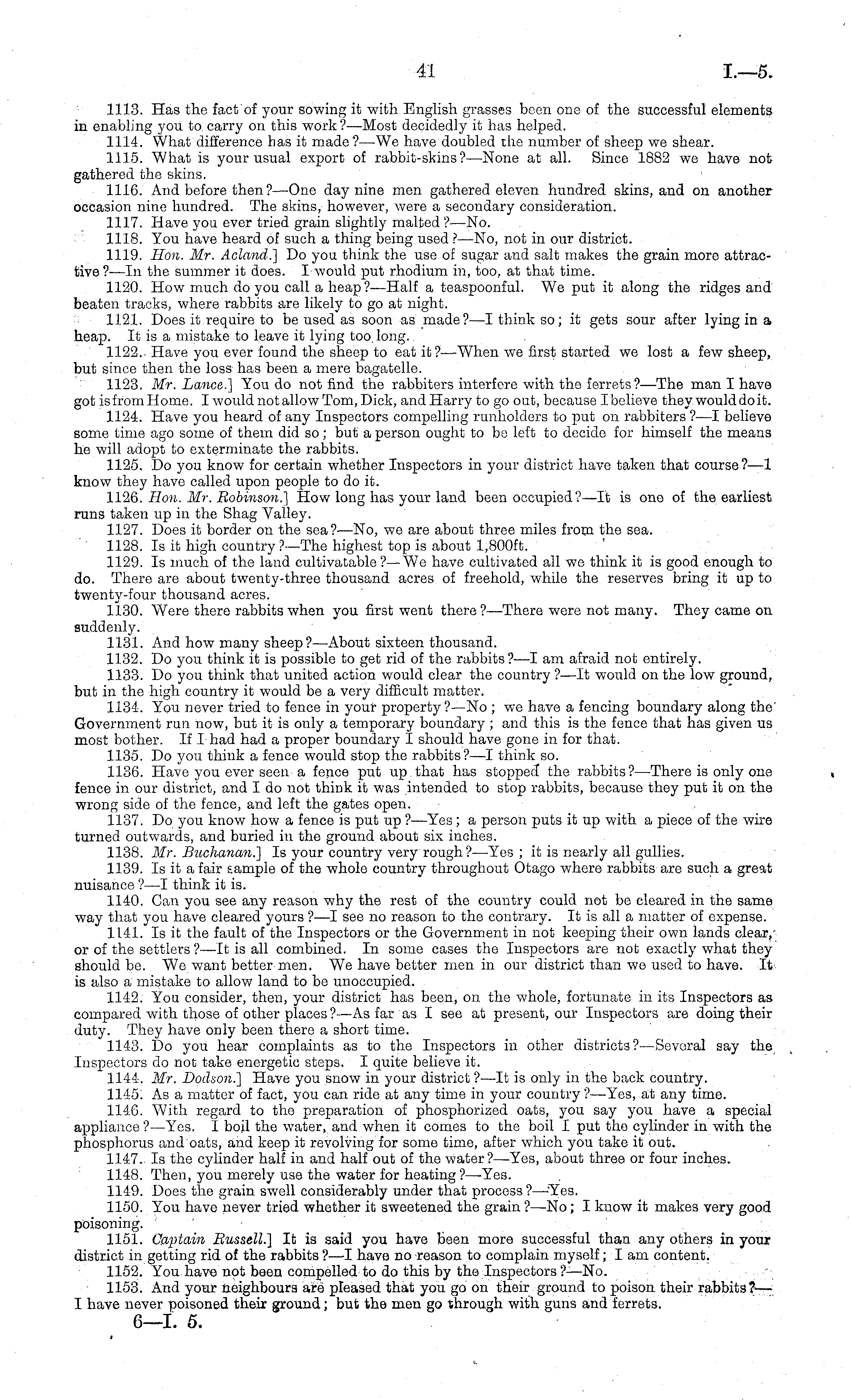 1113. Has the fact of your sowing it with English grasses been one of the successful elements in enabling you to, carry on this work?— Most decidedly it has helped. 1114. What difference has it made ?—We have doubled the number of sheep we shear. 1115. What is your usual export of rabbit-skins?— None at all. Since 1882 we have not gathered the skins. 1116. And before then ?—One day nine men gathered eleven hundred skins, and on another occasion nine hundred. The skins, however, were a secondary consideration. 1117. Have you ever tried grain slightly malted?— No. 1118. You have heard of such a thing being used ? —No, not in our district. 1119. Hon. Mr. Acland.] Do you think the use of sugar and salt makes the grain more attractive ?—ln the summer it does. I would put rhodium in, too, at that time. 1120. How much do you call a heap?— Half a teaspoonful. We put it along the ridges and beaten tracks, where rabbits are likely to go at night. 1121. Does it require to be used as soon as made?—l think so; it gets sour after lying in a heap. It is a mistake to leave it lying too. long. 1122.. Have you ever found the sheep to eat it? —When we first started we lost a few sheep, but since then the loss has been a mere bagatelle. 1123. Mr. Lance.] You do not find the rabbiters interfere with the ferrets?— The man I have got is from Home. I would not allow Tom, Dick, and Harry to go out, because I believe they would doit. 1124. Have you heard of any Inspectors compelling runholders to put on rabbiters ?—I believe some time ago some of them did so; but a person ought to be left to decide for himself the means he will adopt to exterminate the rabbits. 1125. Do you know for certain whether Inspectors in your district have taken that course?—l know they have called upon people to do it. 1126. Hon. Mr. Robinson.] How long has your land been occupied?—lt is one of the earliest runs taken up in the Shag Valley. 1127. Does it border on the sea? —No, we are about three miles from the sea. 1128. Is it high country?— The highest top is about I,Booft. 1129. Is much of the land cultivatable ?—We have cultivated all we think it is good enough to do. There are about twenty-three thousand acres of freehold, while the reserves bring it up to twenty-four thousand acres. 1130. Were there rabbits when you first went there?— There were not many. They came on suddenly. 1131. And how many sheep?— About sixteen thousand. 1132. Do you think it is possible to get rid of the rabbits?—l am afraid not entirely. 1133. Do you think that united action would clear the country ?—lt would on the low ground, but in the high country it would be a very difficult matter. 1134. You never tried to fence in your property ?—No ; we have a fencing boundary along the Government run now, but it is only a temporary boundary ; and this is the fence that has given us most bother. If I had had a proper boundary I should have gone in for that. 1135. Do you think a fence would stop the rabbits?—l think so. 1136. Have you ever seen a fence put up that has stopped" the rabbits?— There is only one fence in our district, and I do not think it was intended to stop rabbits, because they put it on the wrong side of the fence, and left the gates open. 1137. Do you know how a fence is put up ? —Yes; a person puts it up with a piece of the wire turned outwards, and buried in the ground about six inches. 1138. Mr. Buchanan.] Is your country very rough ? —Yes ; it is nearly all gullies. 1139. Is it a fair sample of the whole country throughout Otago where rabbits are such a great nuisance ?—I think it is. 1140. Can you see any reason why the rest of the country could not be cleared in the same way that you have cleared yours ? —I see no reason to the contrary. It is all a matter of expense. 1141. Is it the fault of the Inspectors or the Government in not keeping their own lands clear, or of the settlers ? —lt is all combined. In some cases the Inspectors are not exactly what they should be. We want better men. We have better men in our district than we used to have. It is also a mistake to allow land to be unoccupied. 1142. You consider, then, your district has been, on the whole, fortunate in its Inspectors as compared with those of other places ? —As far as I see at present, our Inspectors are doing their duty. They have only been there a short time. 1143. Do you hear complaints as to the Inspectors in other districts?— Several say the Inspectors do not take energetic steps. I quite believe it. 1144. Mr. Dodson.] Have you snow in your district ?—lt is only in the back country. 1145. As a matter of fact, you can ride at any time in your country ?—Yes, at any time. 1146. With regard to the preparation of phosphorized oats, you say you have a special appliance ?—Yes. I boil the water, and when it comes to the boil I put the cylinder in with the phosphorus and oats, and keep it revolving for some time, after which you take it out. 1147. Is the cylinder half in and half out of the water?— Yes, about three or four inches. 1148. Then, you merely use the water for heating ?—Yes. 1149. Does the grain swell considerably under that process ?—-Yes. 1150. You have never tried whether it sweetened the grain ?—No; I know it makes very good poisoning. 1151. Captain Bussell.] It is said you have been more successful than any others in your district in getting rid of the rabbits ?—I have no reason to complain myself; lam content. 1152. You have not been compelled to do this by the Inspectors ?—No. 1153. And your neighbours are pleased that you go on their ground to poison their rabbits?— I have never poisoned their ground; but the men go through with guns and ferrets.