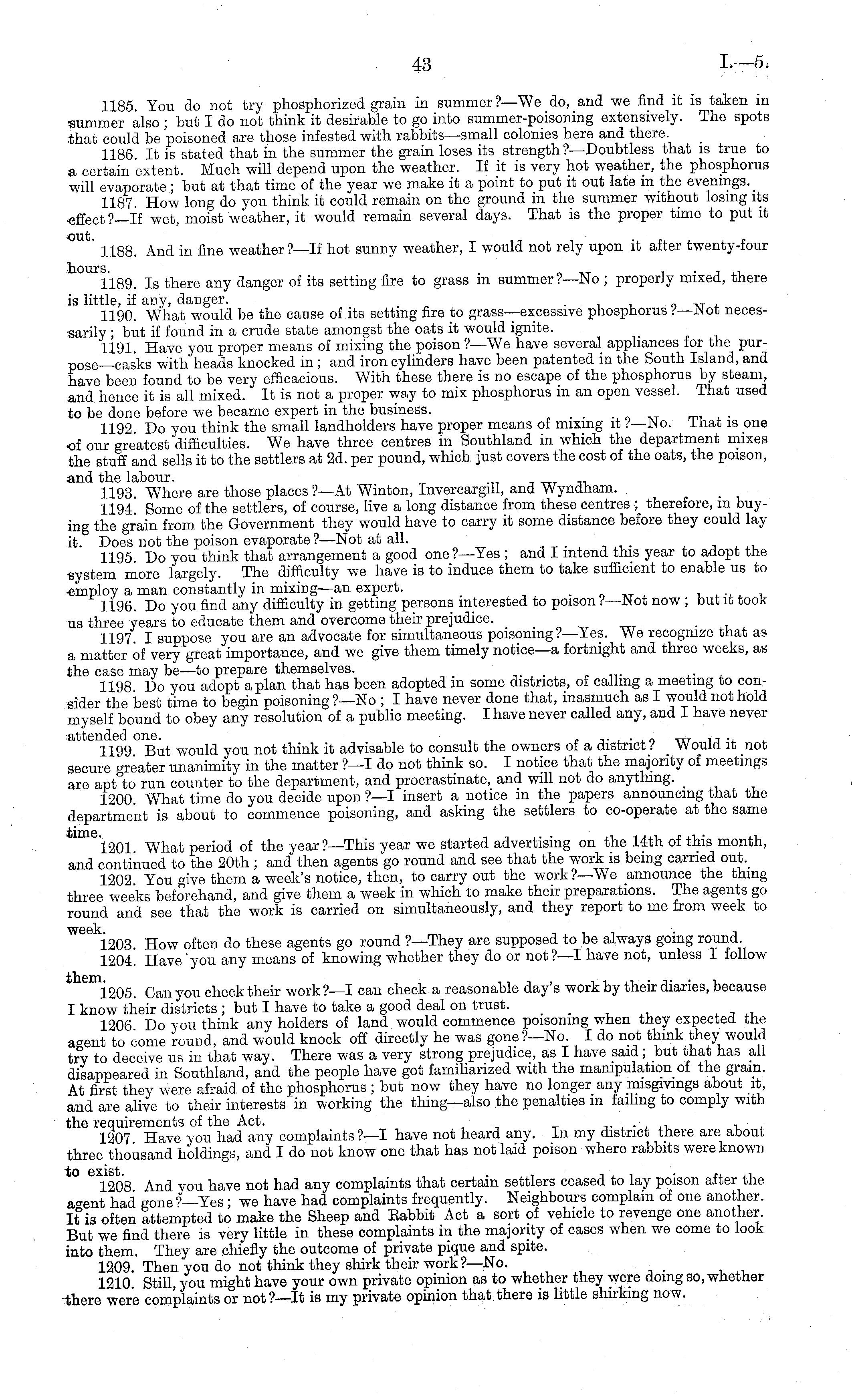 1185. You do not try phosphorized grain in summer?—We do, and we find it is taken in summer also ; but Ido not think it desirable to go into summer-poisoning extensively. The spots that could be poisoned are those infested with rabbits —small colonies here and there. 1186. It is stated that in the summer the grain loses its strength? —Doubtless that is true to a certain extent. Much will depend upon the weather. If it is very hot weather, the phosphorus will evaporate; but at that time of the year we make it a point to put it out late in the evenings. _ 1187. How long do you think it could remain on the ground in the summer without losing its .effect ?_lf wet, moist weather, it would remain several days. That is the proper time to put it " 1188. And in fine weather?—lf hot sunny weather, I would not rely upon it after twenty-four 1189. Is there any danger of its setting fire to grass in summer?—No ; properly mixed, there is little, if any, danger. 1190. What would be the cause of its setting fire to grass—excessive phosphorus >— Not necessarily • but if found in a crude state amongst the oats it would ignite. 1191 Have you proper means of mixing the poison ?—We have several appliances for the purpose—casks with heads knocked in ; and iron cylinders have been patented in the South Island, and have been found to be very efficacious. With these there is no escape of the phosphorus by steam, and. hence it is all mixed. It is not a proper way to mix phosphorus in an open vessel. That used to be done before we became expert in the business. , 1192. Do you think the small landholders have proper means of mixing it >— JNo. lhat is one of our greatest difficulties. We have three centres in Southland in which the department mixes the stuff and sells it to the settlers at 2d. per pound, which, just covers the cost of the oats, the poison, and the labour. 1193. Where are those places ?—At Winton, Invercargill, and Wyndham. 1194. Some of the settlers, of course, live a long distance from these centres ; therefore, in buying the grain from the Government they would have to carry it some distance before they could lay it. Does not the poison evaporate ?—Not at all. 1195. Do you think that arrangement a good one? —Yes ; and I intend this year to adopt the system more largely. The difficulty we have is to induce them to take sufficient to enable us to ■employ a man constantly in mixing—an expert. . 1196. Do you find any difficulty in getting persons interested to poison ? —Not now ; but it took us three years to educate them and overcome their prejudice. 1197 I suppose you are an advocate for simultaneous poisoning?— Yes. We recognize that as a matter of very great importance, and we give them timely notice—a fortnight and three weeks, as the case may be—to prepare themselves. g 1198 Do you adopt apian that has been adopted in some districts, of calling a meeting to consider the best time to begin poisoning ?—No ; I have never done that, inasmuch as I would not hold myself bound to obey any resolution of a public meeting. I have never called any, and I have never attended one. .■' _. .- ,„ _•_ ~ . 1199 But would you not think it advisable to consult the owners of a district >. Would it not secure greater unanimity in the matter ?—I do not think so. I notice that the majority of meetings are apt to run counter to the department, and procrastinate, and will not do anything. _ 1200 What time do you decide upon ?—I insert a notice in the papers announcing that the department is about to commence poisoning, and asking the settlers to co-operate at the same 1201 What period of the year ? —This year we started advertising on the 14th of this month, and continued to the 20th ; and then agents go round and see that the work is being carried out. 1202 You give them a week's notice, then, to carry out the work?—We announce the thing three weeks beforehand, and give them a week in which to make their preparations. The agents go round and see that the work is carried on simultaneously, and they report to me from week to 1203. How often do these agents go round ?—They are supposed to be always going round. 1204. Have you any means of knowing whether they do or not?—l have not, unless I follow 1205. Can you check their work ?—I can check a reasonable day's work by their diaries, because I know their districts ; but I have to take a good deal on trust. 1206 Do you think any holders of land would commence poisoning when they expected the agent to come round, and would knock off directly he was gone?— No. Ido not think they would try to deceive us in that way. There was a very strong prejudice, as I have said; but that has all disappeared in Southland, and the people have got familiarized with the manipulation of the gram. At first they were afraid of the phosphorus ; but now they have no longer any misgivings about it, and are alive to their interests in working the thing—also the penalties in failing to comply with the requirements of the Act. . 1207 Have you had any complaints ?—I have not heard any. In my district there are about three thousand holdings, and I do not know one that has not laid poison where rabbits were known 1208 And you have not had any complaints that certain settlers ceased to lay poison after the agent had gone ?—Yes; we have had complaints frequently. Neighbours complain of one another. It is often attempted to make the Sheep and Babbit Act a sort of vehicle to revenge one another. But we find there is very little in these complaints in the majority of cases when we come to look into them. They are chiefly the outcome of private pique and spite. 1209. Then you do not think they shirk their work?— No. 1210 Still, you might have your own private opinion as to whether they were doing so, whether there were complaints or not?—lt is my private opinion that there is little shirking now.