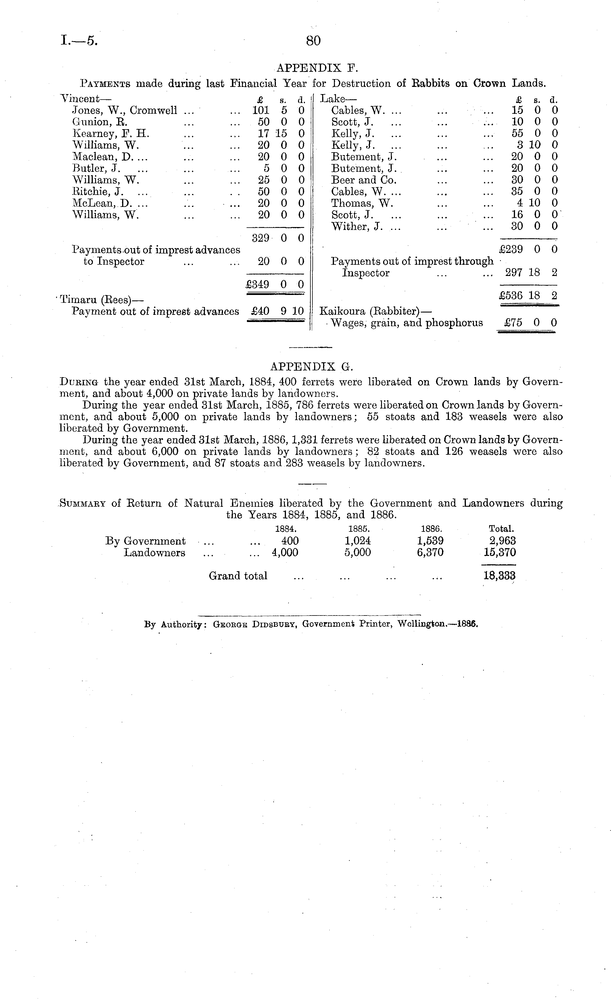 APPENDIX G. Dubing the year ended 31st March, 1884, 400 ferrets were liberated on Crown lands by Government, and about 4,000 on private lands by landowners. During the year ended 31st March, 1885, 786 ferrets were liberated on Crown lands by Government, and about 5,000 on private lands by landowners; 55 stoats and 183 weasels were also liberated by Government. During the year ended 31st March, 1886,1,331 ferrets were liberated on Crown lands by Government, and about 6,000 on private lands by landowners ; 82 stoats and 126 weasels were also liberated by Government, and 87 stoats and 283 weasels by landowners.