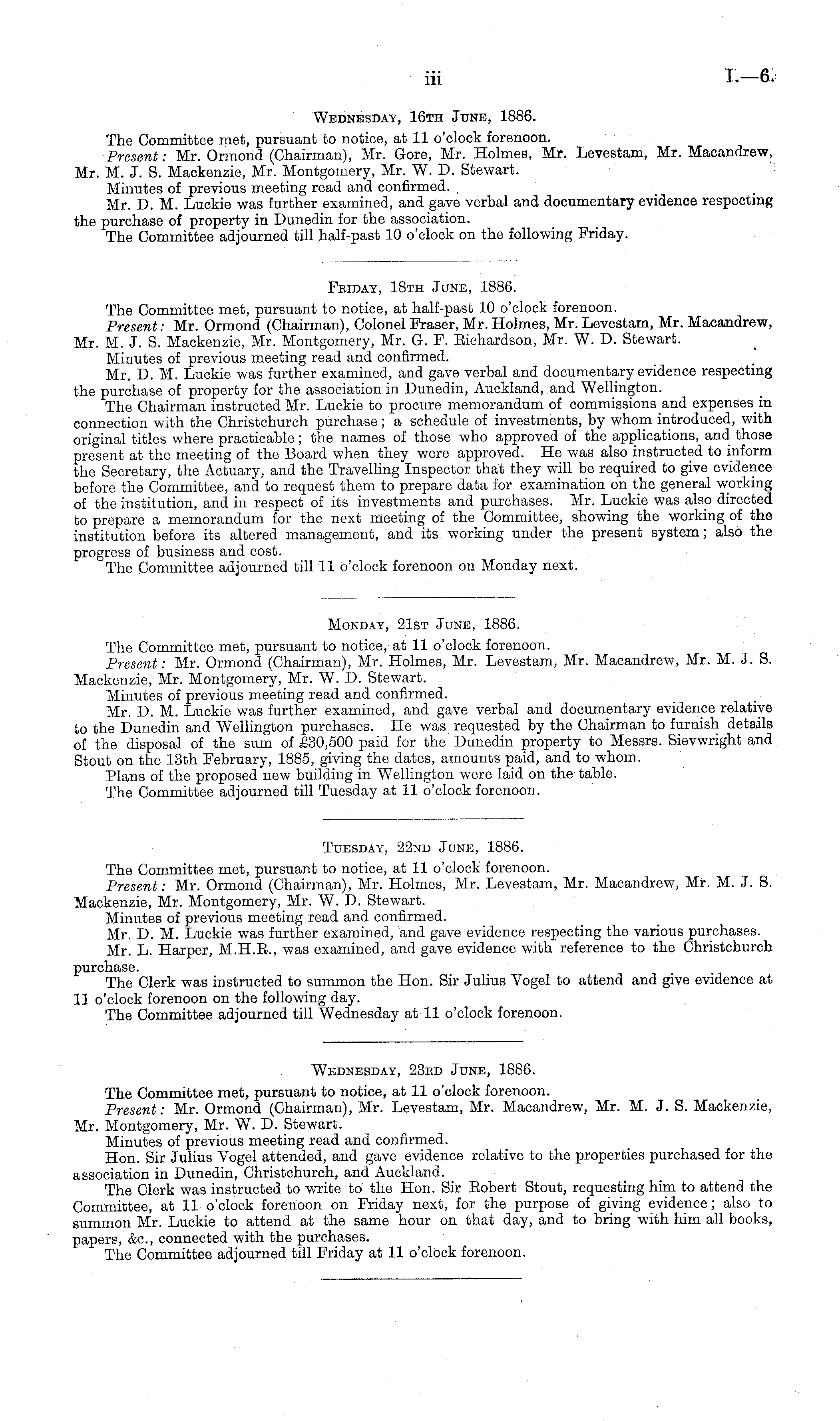 Wednesday, 16th June, 1886. The Committee met, pursuant to notice, at 11 o'clock forenoon. Present: Mr. Ormond (Chairman), Mr. Gore, Mr. Holmes, Mr. Levestam, Mr. Macandrew, Mr. M. J. S. Mackenzie, Mr. Montgomery, Mr. W. D. Stewart. Minutes of previous meeting read and confirmed. , Mr. D. M. Luckie was further examined, and gave verbal and documentary evidence respecting the purchase of property in Dunedin for the association. The Committee adjourned till half-past 10 o'clock on the following Friday.