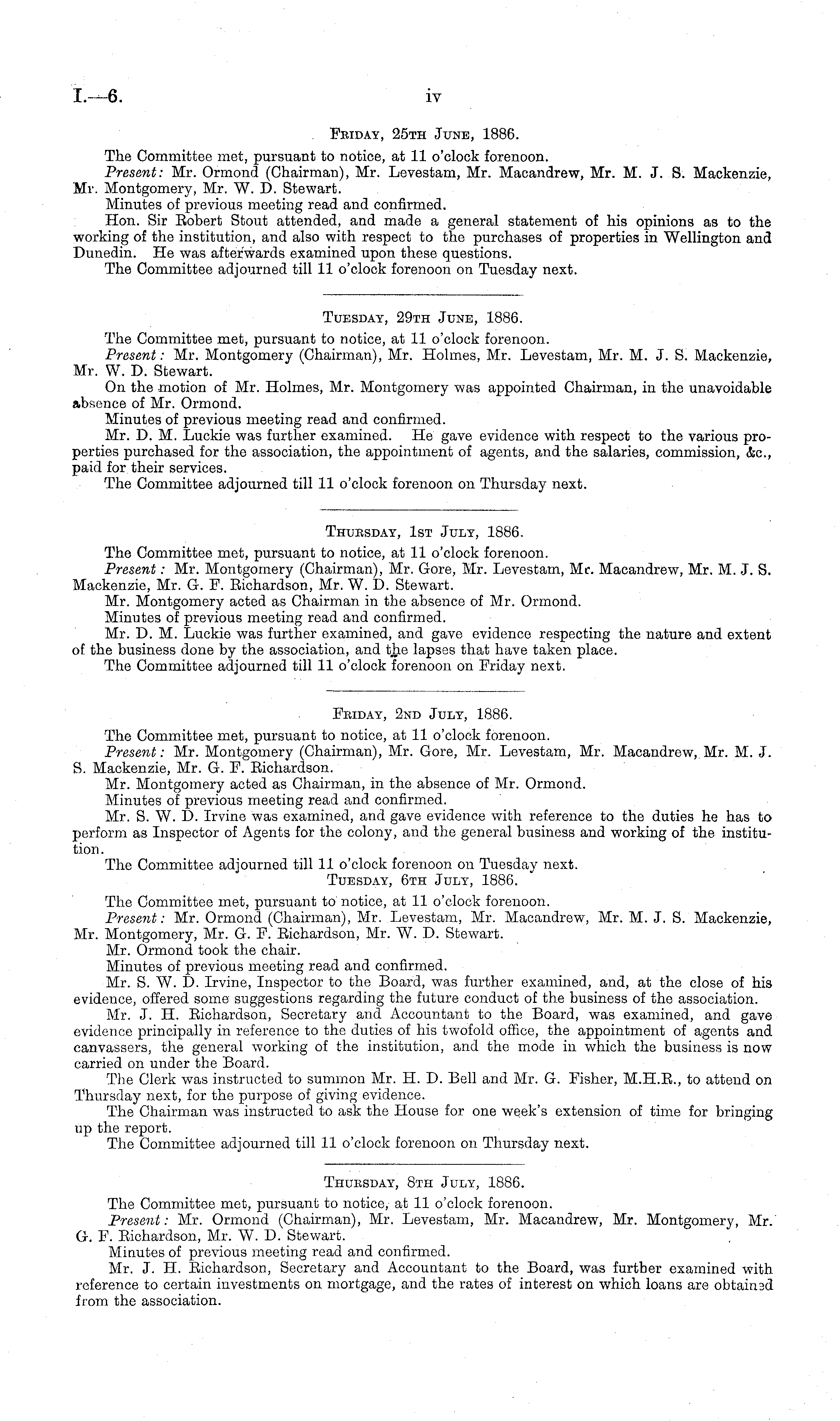 Tuesday, 29th June, 1886. The Committee met, pursuant to notice, at 11 o'clock forenoon. Present: Mr. Montgomery (Chairman), Mr. Holmes, Mr. Levestam, Mr. M. J. S. Mackenzie, Mr. W. D. Stewart. On the motion of Mr. Holmes, Mr. Montgomery was appointed Chairman, in the unavoidable absence of Mr. Ormond. Minutes of previous meeting read and confirmed. Mr. D. M. Luckie was further examined. He gave evidence with respect to the various properties purchased for the association, the appointment of agents, and the salaries, commission, &c, paid for their services. The Committee adjourned till 11 o'clock forenoon on Thursday next.