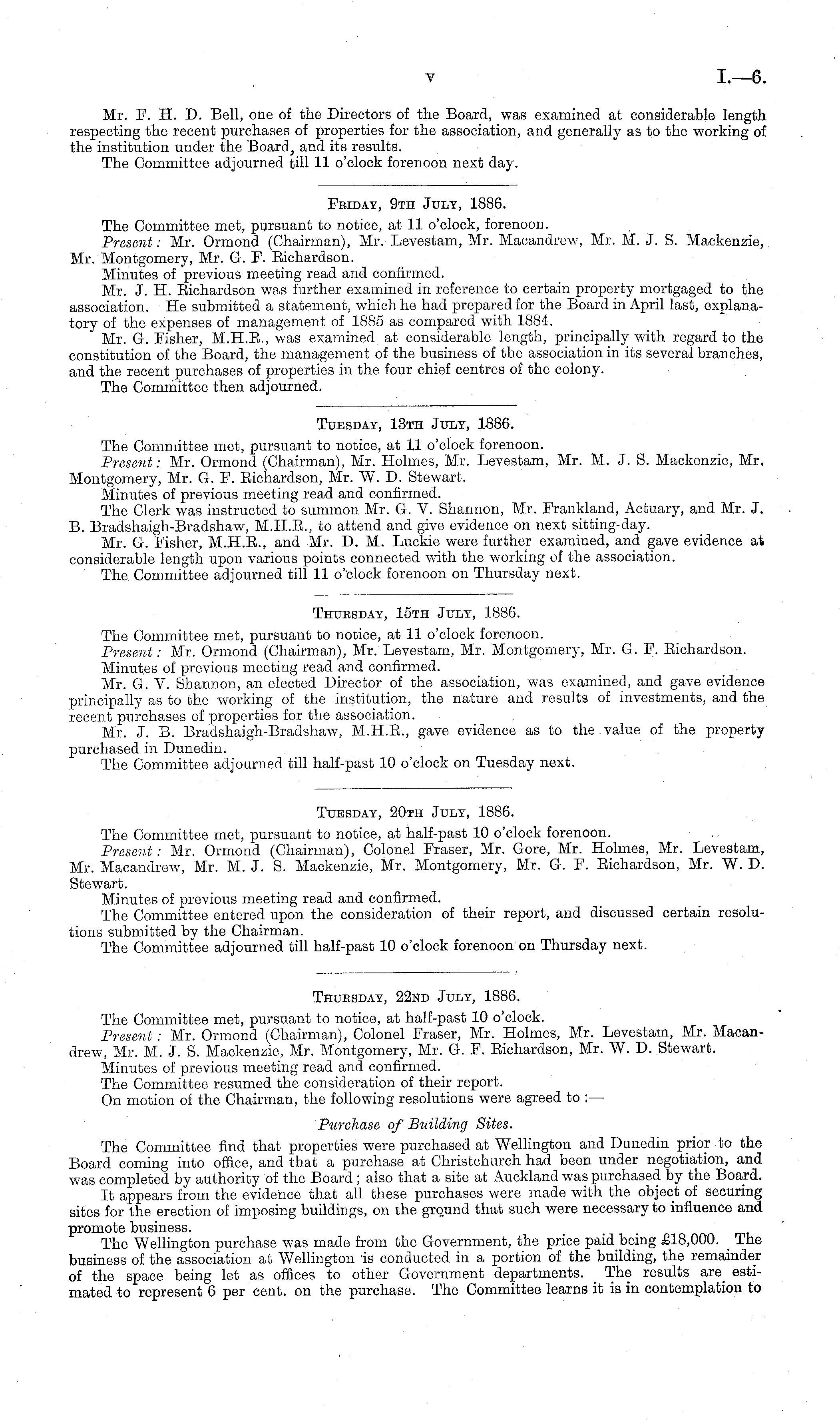 Thursday, 15th July, 1886. The Committee met, pursuant to notice, at 11 o'clock forenoon. Present: Mr. Ormond (Chairman), Mr. Levestam, Mr. Montgomery, Mr. G. F. Eichardson. Minutes of previous meeting read and confirmed. Mr. G. V. Shannon, an elected Director of the association, was examined, and gave evidence principally as to the working of the institution, the nature and results of investments, and the recent purchases of properties for the association. Mr. J. B. Bradshaigh-Bradshaw, M.H.E., gave evidence as to the value of the property purchased in Dunedin. The Committee adjourned till half-past 10 o'clock on Tuesday next.