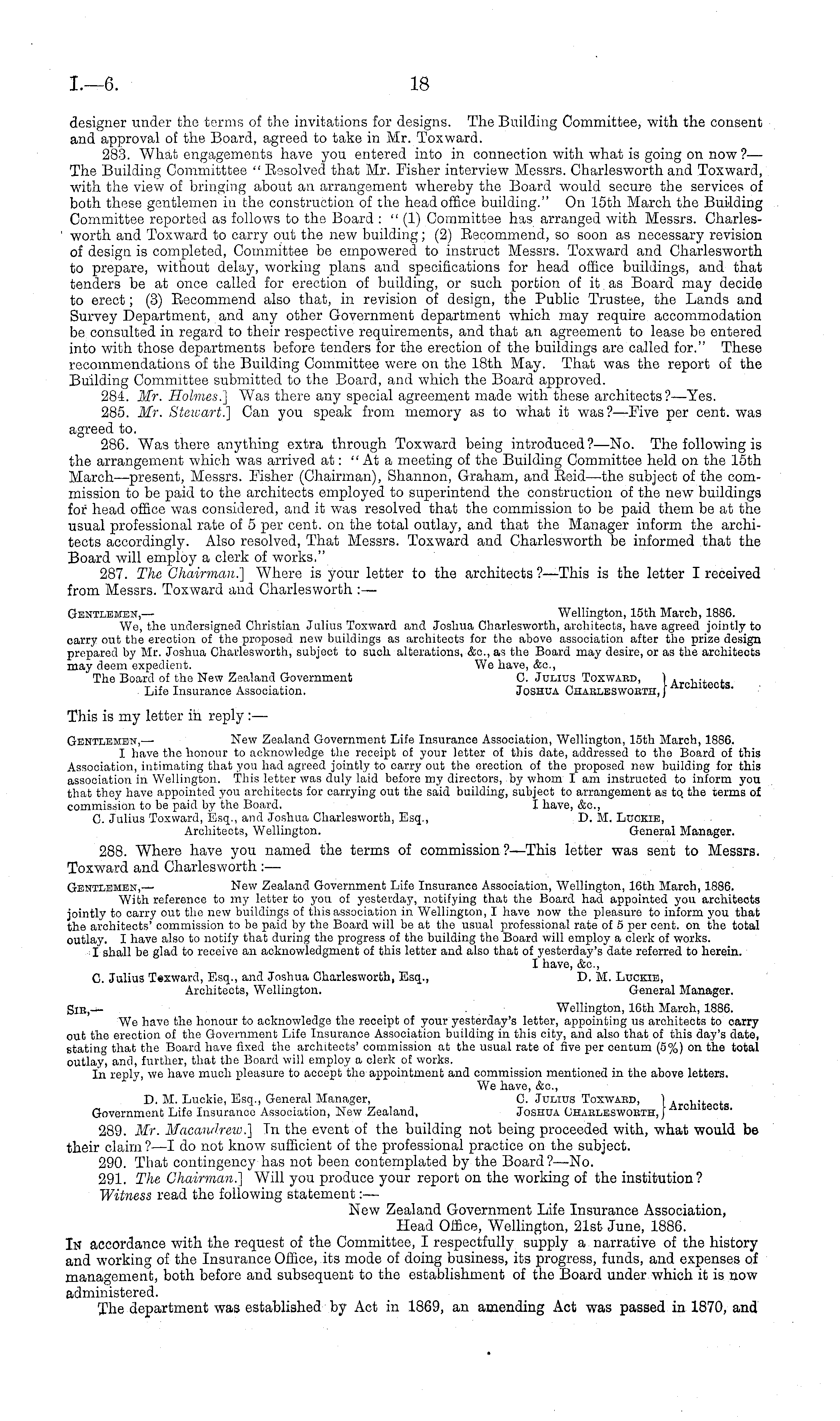 designer under the terms of the invitations for designs. The Building Committee, with the consent and approval of the Board, agreed to take in Mr. Toxward. 283. What engagements have you entered into in connection with what is going on now ?— The Building Committtee " Eesolved that Mr. Fisher interview Messrs. Charlesworth and Toxward, with the view of bringing about an arrangement whereby the Board would secure the services of both these gentlemen in the construction of the head office building." On 15th March the Building Committee reported as follows to the Board : " (1) Committee has arranged with Messrs. Charlesworth and Toxward to carry out the new building; (2) Escommend, so soon as necessary revision of design is completed, Committee be empowered to instruct Messrs. Toxward and Charlesworth to prepare, without delay, working plans and specifications for head office buildings, and that tenders be at once called for erection of building, or such portion of it as Board may decide to erect; (3) Eecommend also that, in revision of design, the Public Trustee, the Lands and Survey Department, and any other Government department which may require accommodation be consulted in regard to their respective requirements, and that an agreement to lease be entered into with those departments before tenders for the erection of the buildings are called for." These recommendations of the Building Committee were on the 18th May. That was the report of the Building Committee submitted to the Board, and which the Board approved. 284. Mr. Holmes.] Was there any special agreement made with these architects?— Yes. 285. Mr. Stewart.] Can you speak from memory as to what it was?— Five per cent, was agreed to. 286. Was there anything extra through Toxward being introduced?— No. The following is the arrangement which was arrived at: "At a meeting of the Building Committee held on the 15th March—present, Messrs. Fisher (Chairman), Shannon, Graham, and Eeid—the subject of the commission to be paid to the architects employed to superintend the construction of the new buildings for head office was considered, and it was resolved that the commission to be paid them be at the usual professional rate of 5 per cent, on the total outlay, and that the Manager inform the architects accordingly. Also resolved, That Messrs. Toxward and Charlesworth be informed that the Board will employ a clerk of works." 287. The Chairman.] Where is your letter to the architects ?—This is the letter I received from Messrs. Toxward and Charlesworth :— Gentlemen, —■ Wellington, 15th March, 1886. We, the undersigned Christian Julius Toxward and Joshua Charlesworth, architects, have agreed jointly to carry out the erection of the proposed new buildings as architects for the above association after the prize design prepared by Mr. Joshua Charlesworth, subject to such alterations, &c, as the Board may desire, or as the architects may deem expedient. We have, &c, The Board of the New Zealand Government C. Julius Toxward, lAreh'teefcq Life Insurance Association. Joshua Charlesworth,} rcmce cs - This is my letter in reply : — Gentlemen, — New Zealand Government Life Insurance Association, Wellington, 15th March, 1886. I have the honour to acknowledge the receipt of your letter of this date, addressed to the Board of this Association, intimating that you had agreed jointly to carry out the erection of the proposed new building for this association in Wellington. This letter was duly laid before my directors, by whom I am instructed to inform you that they have appointed you architects for carrying out the said building, subject to arrangement as to the terms o£ commission to be paid by tho Board. I have, &c, C. Julius Toxward, Esq., and Joshua Charlesworth, Esq., D. M. Luckie, Architects, Wellington. General Manager. 288. Where have you named the terms of commission?— This letter was sent to Messrs. Toxward and Charlesworth :— Gentlemen, — New Zealand Government Life Insurance Association, Wellington, 16th March, 1886. With reference to my letter to you of yesterday, notifying that the Board had appointed you architects jointly to carry out the new buildings of this association in Wellington, I have now the pleasure to inform you that the architects' commission to be paid by the Board will be at the usual professional rate of 5 per cent, on the total outlay. I have also to notify that during the progress of the building the Board will employ a clerk of works. I shall be glad to receive an acknowledgment of this letter and also that of yesterday's date referred to herein. I have, &c, C. Julius Texward, Esq., and Joshua Charlesworth, Esq., D. M. Luckie, Architects, Wellington. General Manager. Sir,— Wellington, 16th March, 1886. We have the honour to acknowledge the receipt of your yesterday's letter, appointing us architects to carry out the erection of the Government Life Insurance Association building in this city, and also that of this day's date, stating that the Board have fixed the architects' commission at the usual rate of five per centum (5%) on the total outlay, and, further, that the Board will employ a clerk of works. In reply, we have much pleasure to accept the appointment and commission mentioned in the above letters. We have, &c, D. M. Luckie, Esq., General Manager, C. Julius Toxward, 1 . ... . Government Life Insurance Association, New Zealand, Joshua Charlesworth, } c'ec ' 289. Mr. Macandrew.] In the event of the building not being proceeded with, what would be their claim? —I do not know sufficient of the professional practice on the subject. 290. That contingency has not been contemplated by the Board?—-No. 291. The Chairman.] Will you produce your report on the working of the institution? Witness read the following statement: — New Zealand Government Life Insurance Association, Head Office, Wellington, 21st June, 1886. In accordance with the request of the Committee, I respectfully suppl