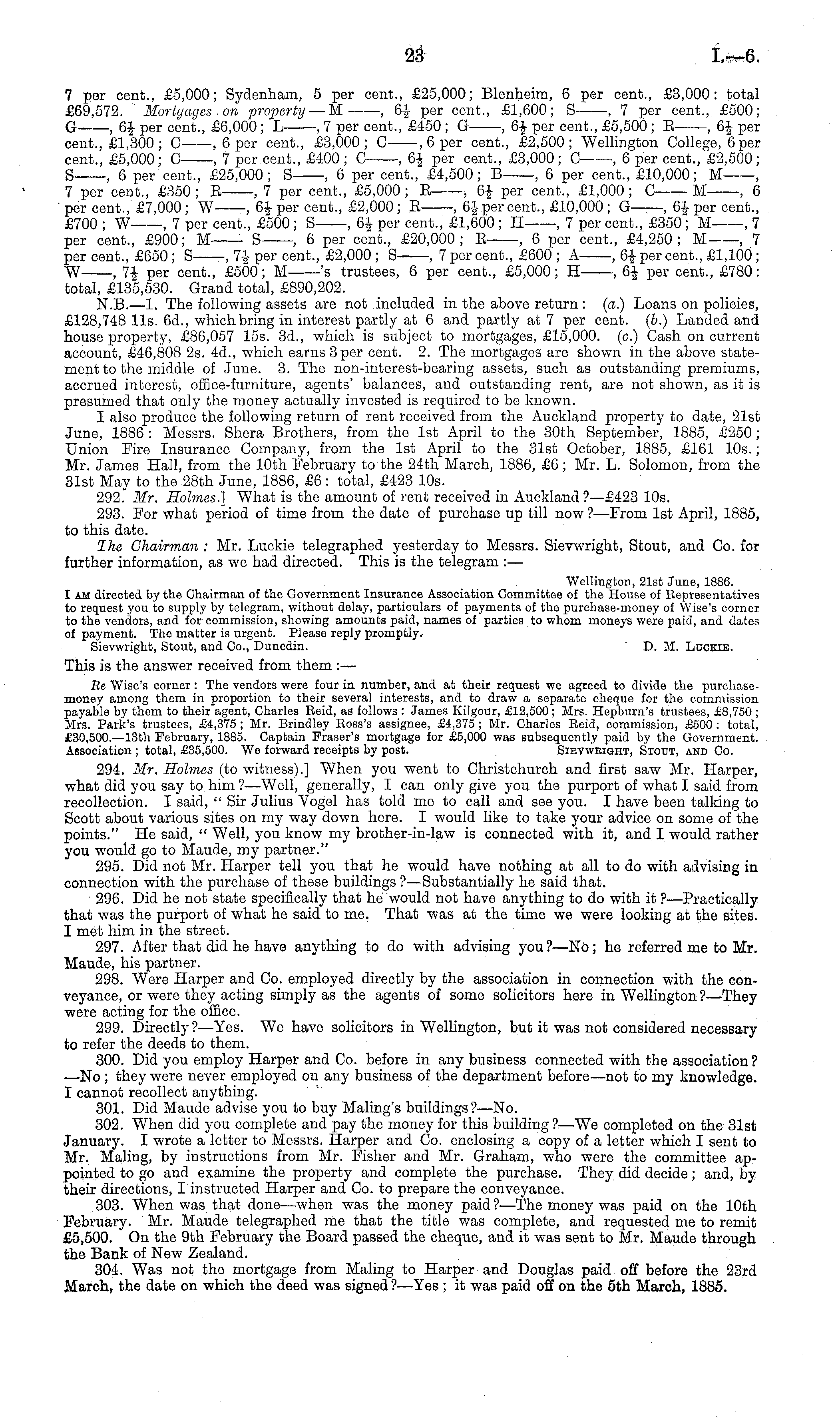7 per cent., £5,000; Sydenham, 5 per cent., £25,000; Blenheim, 6 per cent., £3,000: total £69,572. Mortgages on property — M ——, 6-_ per cent., £1,600; S , 7 per cent., £500; G ,6$ per cent., £6,000; L , 7 per cent., £450; G——, 6| per cent., £5,500; E -, 6-_ per cent., £1,300 ; C , 6 per cent., £3,000; C , 6 per cent., £2,500; Wellington College, 6 per cent., £5,000; C , 7 per cent., £400 ; C , 6_ per cent., £3,000; C , 6 per cent., £2,500; S- , 6 per cent., £25,000 ; S , 6 per cent., £4,500 ; B , 6 per cent., £10,000 ; M , 7 per cent., £350; E , 7 per cent., £5,000; E , 6. per cent., £1,000; C—— M , 6 per cent., £7,000; W , 6£ per cent., £2,000; E , 6| per cent., £10,000 ; G , 6* per cent., £700 ; W- , 7 per cent., £500 ; S ,6| per cent., £1,600; H , 7 per cent., £350; M , 7 per cent., £900; M S , 6 per cent., £20,000; E , 6 per cent., £4,250; M , 7 per cent., £650; S , 7-f- per cent., £2,000 ; S—, 7 per cent., £600 ;A- , 6_. per cent., £1,100; W , 7_- per cent., £500; M 's trustees, 6 per cent., £5,000; H , 6-. per cent., £780: total, £135,530. Grand total, £890,202. N. B.—l. The following assets are not included in the above return : (a.) Loans on policies, £128,748 lis. 6d., which bring in interest partly at 6 and partly at 7 per cent, (b.) Landed and house property, £86,057 15s. 3d., which is subject to mortgages, £15,000. (c.) Cash on current account, £46,808 2s. 4d., which earns 3 per cent. 2. The mortgages are shown in the above statement to the middle of June. 3. The non-interest-bearing assets, such as outstanding premiums, accrued interest, office-furniture, agents' balances, and outstanding rent, are not shown, as it is presumed that only the money actually invested is required to be known. I also produce the following return of rent received from the Auckland property to date, 21st June, 1886 : Messrs. Shera Brothers, from the Ist April to the 30th September, 1885, £250; Union Fire Insurance Company, from the Ist April to the 31st October, 1885, £161 10s.; Mr. James Hall, from the 10th February to the 24th March, 1886, £6; Mr. L. Solomon, from the 31st May to the 28th June, 1886, £6: total, £423 10s. 292. Mr. Holmes.] What is the amount of rent received in Auckland ?—£423 10s. 293. For what period of time from the date of purchase up till now ? —From Ist April, 1885, to this date. Ihe Chairman ; Mr. Luckie telegraphed yesterday to Messrs. Sievwright, Stout, and Co. for further information, as we had directed. This is the telegram : — Wellington, 21st June, 1886. I am directed by the Chairman of the Government Insurance Association Committee of the House of Representatives to request you to supply by telegram, without delay, particulars of payments of the purchase-money of Wise's corner to the vendors, and for commission, showing amounts paid, names of parties to whom moneys were paid, and dates of payment. The matter is urgent. Please reply promptly. Sievwright, Stout, and Co., Dunedin. D. M. Luckie. This is the answer received from them :— Re Wise's corner: The vendors were four in number, and at their request we agreed to divide the purchasemoney among them in proportion to their several interests, and to draw a separate cheque for the commission payable by them to their agent, Charles Reid, as follows : James Kilgour, £12,500 ; Mrs. Hepburn's trustees, £8,750 ; Mrs. Park's trustees, £4,375; Mr. Brindley Ross's assignee, £4,375 ; Mr. Charles Reid, commission, £500 : total, £30,500. —13th February, 1885. Captain Fraser's mortgage for £5,000 was subsequently paid by the Government. Association ; total, £35,500. We forward receipts by post. Sievwright, Stout, and Co. 294. Mr. Holmes (to witness).] When you went to Christchurch and first saw Mr. Harper, what did you say to him ?—Well, generally, I can only give you the purport of what I said from recollection. I said, " Sir Julius Vogel has told me to call and see you. I have been talking to Scott about various sites on my way down here. I would like to take your advice on some of the points." He said, " Well, you know my brother-in-law is connected with it, and I would rather you would go to Maude, my partner." 295. Did not Mr. Harper tell you that he would have nothing at all to do with advising in connection with the purchase of these buildings ? —Substantially he said that. 296. Did he not state specifically that he would not have anything to do with it ? —Practically that was the purport of what he said to me. That was at the time we were looking at the sites. I met him in the street. 297. After that did he have anything to do with advising you?—No; he referred me to Mr. Maude, his partner. 298. Were Harper and Co. employed directly by the association in connection with the conveyance, or were they acting simply as the agents of some solicitors here in Wellington ?—They were acting for the office. 299. Directly?— Yes. We have solicitors in Wellington, but it was not considered necessary to refer the deeds to them. 300. Did you employ Harper and Co. before in any business connected with the association? —No ; they were never employed on any business of the department before—not to my knowledge. I cannot recollect anything. 301. Did Maude advise you to buy Maling's buildings?— No. 302. When did you complete and pay the money for this building ?—We completed on the 31st January. I wrote a letter to Messrs. Harper and Co. enclosing a copy of a letter which I sent to Mr. Maling, by instructions from Mr. Fisher and Mr. Graham, who were the committee appointed to go and examine the property and complete the purchase. They did decide; and, by their directions, I instructed Harper and Co. to prepare the conveyance. 303. When was that done—when was the money paid?— The money was paid on the 10th February. Mr. Maude telegraphed me that the title was complete, and requested me to remit £5,500. On the 9th February the Board
