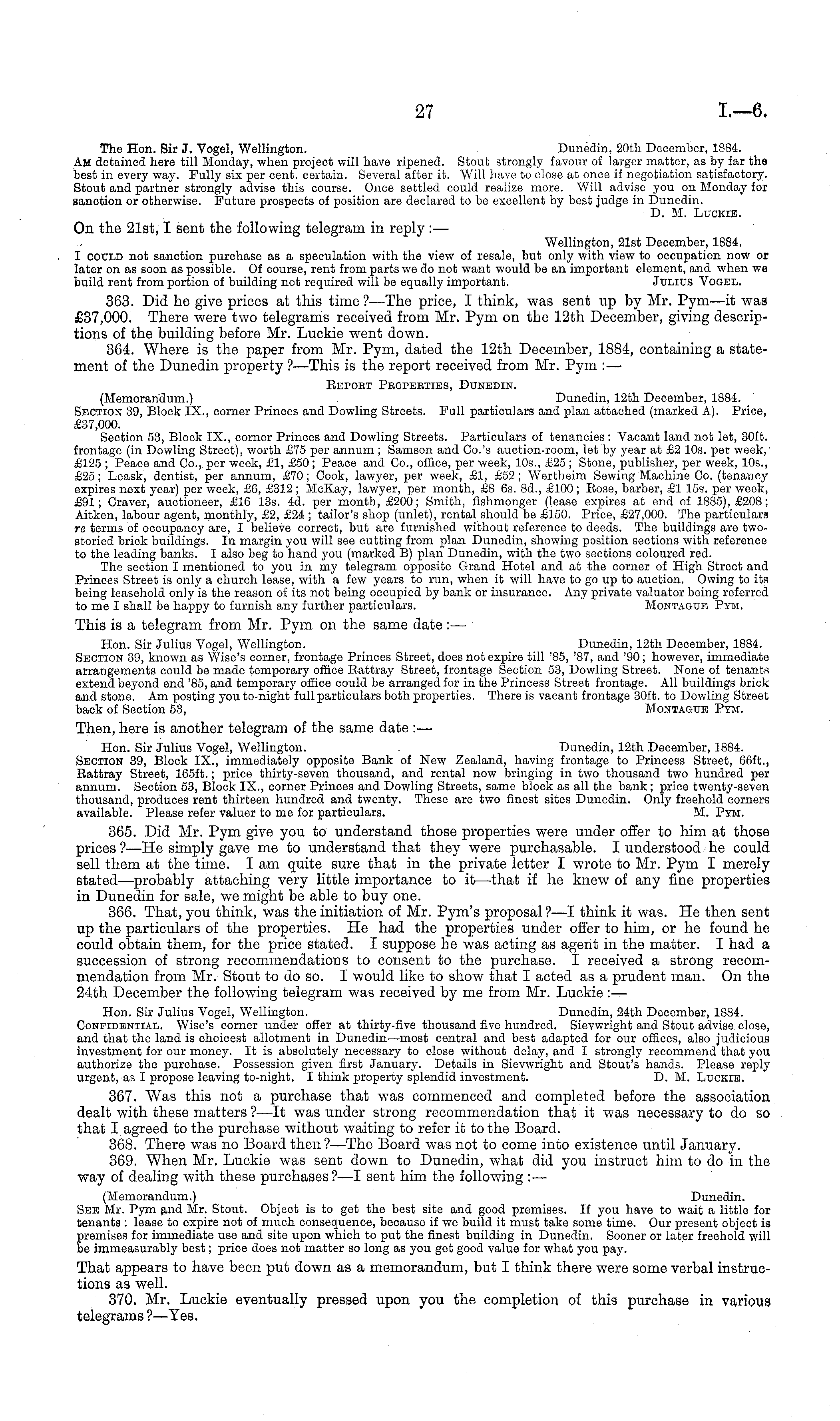 The Hon. Sir J. Vogel, Wellington. Dunedin, 20th December, 1884. Am detained here till Monday, when project will have ripened. Stout strongly favour of larger matter, as by far the best in every way. Fully six per cent, certain. Several after it. Will have to close at once if negotiation satisfactory. Stout and partner strongly advise this course. Once settled could realize more. Will advise you on Monday for sanction or otherwise. Future prospects of position are declared to be excellent by best judge in Dunedin. D. M. Luckie. On the 21st, I sent the following telegram in reply : — Wellington, 21st December, 1884. I could not sanction purchase as a speculation with the view of resale, but only with view to occupation now or later on as soon as possible. Of course, rent from parts we do not want would be an important element, and when we build rent from portion of building not required will be equally important. Julius Vogel. 363. Did he give prices at this time ?—The price, I think, was sent up by Mr. Pym—it was £37,000. There were two telegrams received from Mr. Pym on the 12th December, giving descriptions of the building before Mr. Luckie went down. 364. Where is the paper from Mr. Pym, dated the 12th December, 1884, containing a statement of the Dunedin property ?—This is the report received from Mr. Pym :— Report Pbopeeties, Dunedin. (Memorandum.) Dunedin, 12th December, 1884. Section 39, Block IX., corner Princes and Dowling Streets. Full particulars and plan attached (marked A). Price, £37,000. Section 53, Block IX., corner Princes and Dowling Streets. Particulars of tenancies : Vacant land not let, 30ft. frontage (in Dowling Street), worth £75 per annum ; Samson and Co.'s auction-room, let by year at £2 10s. per week,' £125 ; Peace and Co., per week, £1, £50; Peace and Co., office, per week, 10s., £25 ; Stone, publisher, per week, 10s., £25; Leask, dentist, per annum, £70; Cook, lawyer, per week, £1, £52 ; Wertheim Sewing Machine Co. (tenancy expires next year) per week, £6, £312 ; McKay, lawyer, per month, £8 6s. Bd., £100; Rose, barber, £1 15s. per week, £91; Craver, auctioneer, £16 13s. 4d. per month, £200; Smith, fishmonger (lease expires at end of 1885), £208 ; Aitken, labour agent, monthly, £2, £24 ; tailor's shop (unlet), rental should be £150. Price, £27,000. The particulars re terms of occupancy are, I believe correct, but are furnished without reference to deeds. The buildings are twostoried brick buildings. In margin you will see cutting from plan Dunedin, showing position sections with reference to the leading banks. I also beg to hand you (marked B) plan Dunedin, with the two sections coloured red. The section I mentioned to you in my telegram opposite Grand Hotel and at the corner of High Street and Princes Street is only a church lease, with a few years to run, when it will have to go up to auction. Owing to its being leasehold only is the reason of its not being occupied by bank or insurance. Any private valuator being referred to me I shall be happy to furnish any further particulars. Montague Pym. This is a telegram from Mr. Pym on the same date: — Hon. Sir Julius Vogel, Wellington. Dunedin, 12th December, 1884. Section 39, known as Wise's corner, frontage Princes Street, does not expire till '85, '87, and '90; however, immediate arrangements could be made temporary office Rattray Street, frontage Section 53, Dowling Street. None of tenants extend beyond end '85, and temporary office could be arranged for in the Princess Street frontage. All buildings brick and stone. Am posting you to-night full particulars both properties. There is vacant frontage 30ft. to Dowling Street back of Section 53, Montague Pym. Then, here is another telegram of the same date : — Hon. Sir Julius Vogel, Wellington. Dunedin, 12th December, 1884. Section 39, Block IX., immediately opposite Bank of New Zealand, having frontage to Princess Street, 66ft., Rattray Street, 165 ft.; price thirty-seven thousand, and rental now bringing in two thousand two hundred per annum. Section 53, Block IX., corner Princes and Dowling Streets, same block as all the bank; price twenty-seven thousand, produces rent thirteen hundred and twenty. These are two finest sites Dunedin. Only freehold corners available. Please refer valuer to me for particulars. M. Pym. 365. Did Mr. Pym give you to understand those properties were under offer to him at those prices ?—He simply gave me to understand that they were purchasable. I understood he could sell them at the time. lam quite sure that in the private letter I wrote to Mr. Pym I merely stated—probably attaching very little importance to it—that if he knew of any fine properties in Dunedin for sale, we might be able to buy one. 366. That, you think, was the initiation of Mr. Pym's proposal ? —I think it was. He then sent up the particulars of the properties. He had the properties under offer to him, or he found he could obtain them, for the price stated. I suppose he was acting as agent in the matter. I had a succession of strong recommendations to consent to the purchase. I received a strong recommendation from Mr. Stout to do so. I would like to show that I acted as a prudent man. On the 24th December the following telegram was received by me from Mr. Luckie : — Hon. Sir Julius Vogel, Wellington. Dunedin, 24th December, 1884. Confidential. Wise's corner under offer at thirty-five thousand five hundred. Sievwright and Stout advise close, and that the land is choicest allotment in Dunedin—most central and best adapted for our offices, also judicious investment for our money. It is absolutely necessary to close without delay, and I strongly recommend that you authorize the purchase. Possession given first January. Details in Sievwright and Stout's hands. Please reply urgent, as I propose leaving to-night. I think property splendid investment. D. M. Luckie. 367. Was this not a purchase that was commenced and complet