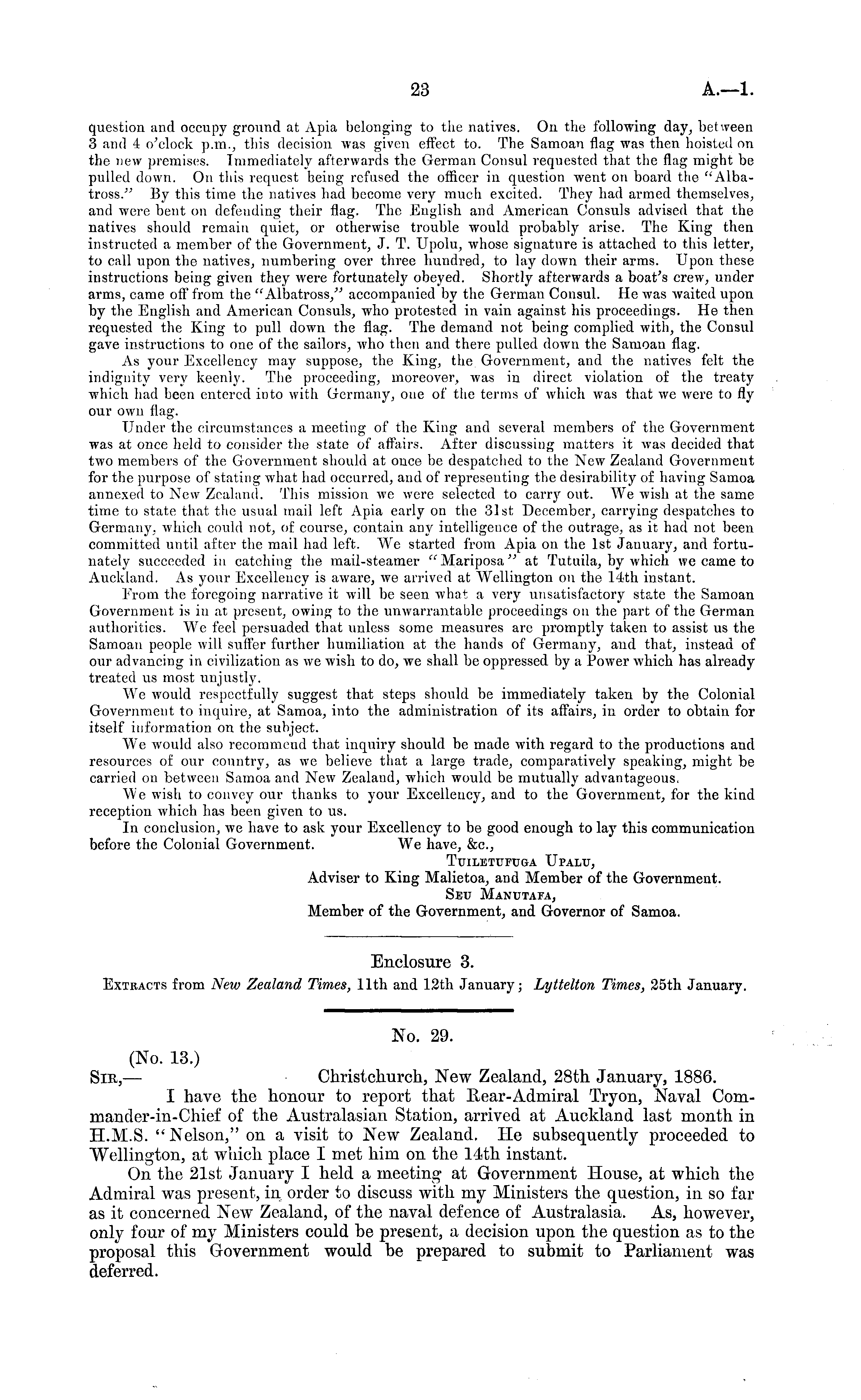 question and occupy ground at Apia belonging to the natives. On the following day, between 3 and 4 o'clock p.m., this decision was given effect to. The Samoan flag was then hoisted on the new premises. Immediately afterwards the German Consul requested that the flag might be pulled down. On this request being refused the officer in question went on board the "Albatross." By this time the natives had become very much excited. They had armed themselves, and were bent on defending their flag. The English and American Consuls advised that the natives should remain quiet, or otherwise trouble would probably arise. The King then instructed a member of the Government, J. T. Upolu, whose signature is attached to this letter, to call upon the natives, numbering over three hundred, to lay clown their arms. Upon these instructions being given they were fortunately obeyed. Shortly afterwards a boat's crew, under arms, came off from the "Albatross," accompanied by the German Consul. He was waited upon by the English and American Consuls, who protested in vain against his proceedings. He then requested the King to pull down the flag. The demand not being complied with, the Consul gave instructions to one of the sailors, who then and there pulled down the Samoan flag. As your Excellency may suppose, the King, the Government, and the natives felt the indignity very keenly. The proceeding, moreover, was in direct violation of the treaty which had been entered into with Germany, one of the terms of which was that we were to fly our own flag. Under the circumstances a meeting of the King and several members of the Government was at once held to consider the state of affairs. After discussing matters it was decided that two members of the Government should at once be despatched to the New Zealand Government for the purpose of stating what had occurred, and of representing the desirability of having Samoa annexed to New Zealand. This mission we were selected to carry out. We wish at the same time to state that the usual mail left Apia early on the 31st December, carrying despatches to Germany, which could not, of course, contain any intelligence of the outrage, as it had not been committed until after the mail had left. We started from Apia on the Ist January, and fortunately succeeded in catching the mail-steamer " Mariposa" at Tutuila, by which we came to Auckland. As your Excellency is aware, we arrived at Wellington on the 14th instant. Erom the foregoing narrative it will be seen what a very unsatisfactory state the Samoan Government is in at present, owing to the unwarrantable proceedings on the part of the German authorities. We feel persuaded that unless some measures are promptly taken to assist us the Samoan people will suffer further humiliation at the hands of Germany, and that, instead of our advancing in civilization as we wish to do, we shall be oppressed by a Power which has already treated us most unjustly. We would respectfully suggest that steps should be immediately taken by the Colonial Government to inquire, at Samoa, into the administration of its affairs, in order to obtain for itself information on the subject. We would also recommend that inquiry should be made with regard to the productions and resources of our country, as we believe that a large trade, comparatively speaking, might be carried on between Samoa and New Zealand, which would be mutually advantageous. We wish to convey our thanks to your Excellency, and to the Government, for the kind reception which has been given to us. In conclusion, we have to ask your Excellency to be good enough to lay this communication before the Colonial Government. We have, &c, TuiLETUFUGA UpALU, Adviser to King Malietoa, and Member of the Government. Seu Manutafa, Member of the Government, and Governor of Samoa.