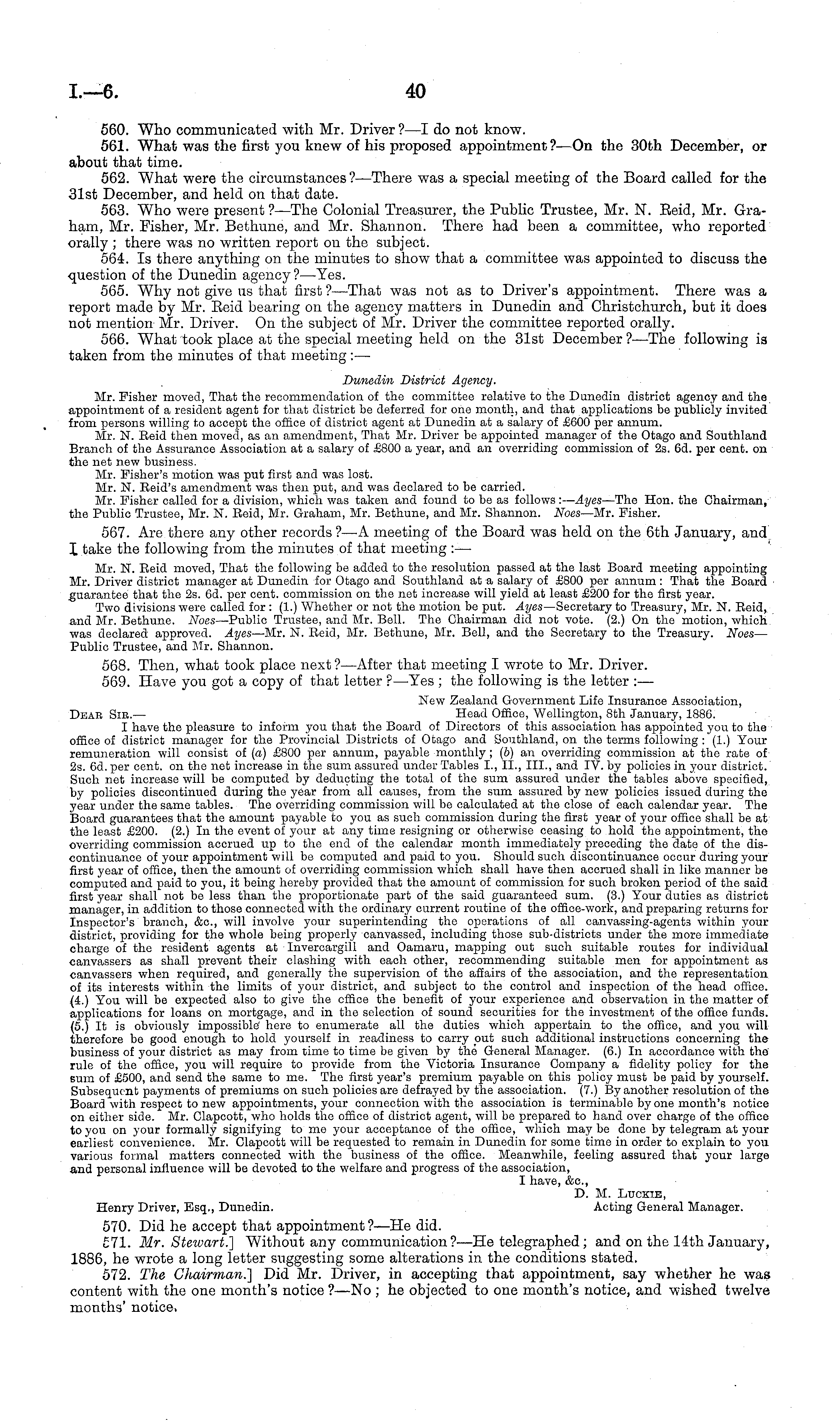 560. Who communicated with Mr. Driver ?—I do not know. 561. What was the first you knew of his proposed appointment?—On the 30th December, or about that time. 562. What were the circumstances? —There was a special meeting of the Board called for the 31st December, and held on that date. 563. Who were present ?—The Colonial Treasurer, the Public Trustee, Mr. N. Beid, Mr. Graham, Mr. Pisher, Mr. Bethune, and Mr. Shannon. There had been a committee, who reported orally ; there was no written report on the subject. 564. Is there anything on the minutes to show that a committee was appointed to discuss the question of the Dunedin agency?— Yes. 565. Why not give us that first ?—That was not as to Driver's appointment. There was a report made by Mr. Beid bearing on the agency matters in Dunedin and Christchurch, but it does not mention Mr. Driver. On the subject of Mr. Driver the committee reported orally. 566. What took place at the special meeting held on the 31st December ?—The following is taken from the minutes of that meeting : — Dunedin District Agency. Mr. Pisher moved, That the recommendation of the committee relative to the Dunedin district agency and the appointment of a resident agent for that district be deferred for one month, and that applications be publicly invited from persons willing to accept the office of district agent at Dunedin at a salary of £600 per annum. Mr. N. Reid then moved, as an amendment, That Mr. Driver be appointed manager of the Otago and Southland Branch of the Assurance Association at a salary of £800 a year, and an overriding commission of 2s. 6d. per cent, on the net new business. Mr. Fisher's motion was put first and was lost. Mr. N. Reid's amendment was then put, and was declared to be carried. Mr. Eisher called for a division, which was taken and found to be as follows: — Ayes —The Hon. the Chairman, the Public Trustee, Mr. N. Reid, Mr. Graham, Mr. Bethune, and Mr. Shannon. Noes —Mr. Eisher. 567. Are there any other records ?—A meeting of the Board was held on the 6th January, and I take the following from the minutes of that meeting : — Mr. N. Reid moved, That the following be added to the resolution passed at the last Board meeting appointing Mr. Driver district manager at Dunedin for Otago and Southland at a salary of £800 per annum : That tho Board guarantee that the 2s. 6d. per cent, commission on the net increase will yield at least £200 for the first year. Two divisions were called for : (1.) Whether or not the motion be put. Ayes —Secretary to Treasury, Mr. N. Reid, and Mr. Bethune. Noes —Public Trustee, and Mr. Bell. The Chairman did not vote. (2.) On the motion, which was declared approved. Ayes —Mr. N. Reid, Mr. Bethune, Mr. Bell, and the Secretary to the Treasury. Noes — Public Trustee, and Sir. Shannon. 568. Then, what took place next ?—After that meeting I wrote to Mr. Driver. 569. Have you got a copy of that letter ?—Yes ; the following is the letter : — New Zealand Government Life Insurance Association, Dear Sir. — Head Office, Wellington, Bth January, 1886. I have the pleasure to inform you that the Board of Directors of this association has appointed you to the office of district manager for the Provincial Districts of Otago and Southland, on tho terms following : (1.) Your remuneration will consist of (a) £800 per annum, payable monthly ; (b) an overriding commission at the rate of 2s. 6d. per cent, on the net increase in the sum assured under Tables 1., 11., 111., and TV. by policies in your district. Such net increase will be computed by deducting the total of the sum assured under the tables above specified, by policies discontinued during the year from all causes, from the sum assured by new policies issued during the year under the same tables. The overriding commission will be calculated at the close of each calendar year. The Board guarantees that the amount payable to you as such commission during the first year of your office shall be at the least £200. (2.) In the event of your at any time resigning or otherwise ceasing to hold the appointment, the overriding commission accrued up to the end of the calendar month immediately preceding the date of the discontinuance of your appointment will be computed and paid to you. Should such discontinuance occur during your first year of office, then the amount of overriding commission which shall have then accrued shall in like manner be computed and paid to you, it being hereby provided that the amount of commission for such broken period of the said first year shall not be less than the proportionate part of the said guaranteed sum. (3.) Your duties as district manager, in addition to those connected with the ordinary current routine of the office-work, and preparing returns for Inspector's branch, &c, will involve your superintending the operations of all canvassing-agents within your district, providing for the whole being properly canvassed, including those sub-districts under the more immediate charge of the resident agents at Invercargill and Oamaru, mapping out such suitable routes for individual canvassers as shall prevent their clashing with each other, recommending suitable men for appointment as canvassers when required, and generally the supervision of the affairs of the association, and the representation of its interests within the limits of your district, and subject to the control and inspection of the head office. (4.) You will be expected also to give the office the benefit of your experience and observation in the matter of applications for loans on mortgage, and in the selection of sound securities for the investment of the office funds. (5.) It is obviously impossible hero to enumerate all the duties which appertain to the office, and you will therefore be good enough to hold yourself in readiness to carry out such additional instructions concerning the business of your district as may from time to time be given by