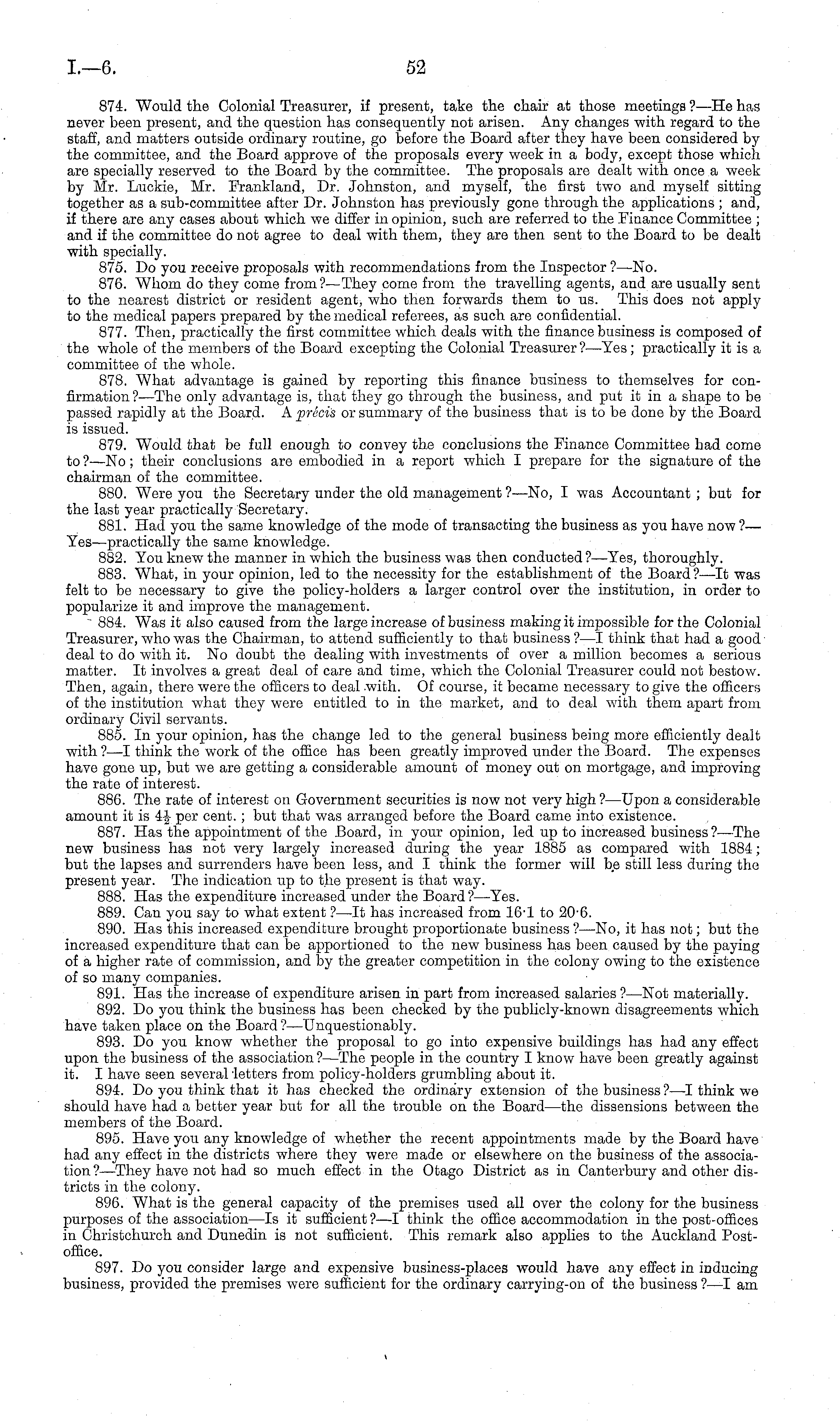 874. Would the Colonial Treasurer, if present, take the chair at those meetings ? —He has never been present, and the question has consequently not arisen. Any changes with regard to the staff, and matters outside ordinary routine, go before the Board after they have been considered by the committee, and the Board approve of the proposals every week in a body, except those which are specially reserved to the Board by the committee. The proposals are dealt with once a week by Mr. Luckie, Mr. Frankland, Dr. Johnston, and myself, the first two and myself sitting together as a sub-committee after Dr. Johnston has previously gone through the applications ; and, if there are any cases about which we differ in opinion, such are referred to the Finance Committee ; and if the committee do not agree to deal with them, they are then sent to the Board to be dealt with specially. 875. Do you receive proposals with recommendations from the Inspector ?—No. 876. Whom do they come from?— They come from the travelling agents, and are usually sent to the nearest district or resident agent, who then forwards them to us. This does not apply to the medical papers prepared by the medical referees, as such are confidential. 877. Then, practically the first committee which deals with the finance business is composed of the whole of the members of the Board excepting the Colonial Treasurer ?—Yes; practically it is a committee of the whole. 878. What advantage is gained by reporting this finance business to themselves for confirmation?— The only advantage is, that they go through the business, and put it in a shape to be passed rapidly at the Board. A precis or summary of the business that is to be done by the Board is issued. 879. Would that be full enough to convey the conclusions the Finance Committee had come to ?—No; their conclusions are embodied in a report which I prepare for the signature of the chairman of the committee. 880. Were you the Secretary under the old management ?—No, I was Accountant ; but for the last year practically Secretary. 881. Had you the same knowledge of the mode of transacting the business as you have now?— Yes—practically the same knowledge. 882. You knew the manner in which the business was then conducted ?—Yes, thoroughly. 883. What, in your opinion, led to the necessity for the establishment of the Board?—lt was felt to be necessary to give the policy-holders a larger control over the institution, in order to popularize it and improve the management. 884. Was it also caused from the large increase of business making it impossible for the Colonial Treasurer, who was the Chairman, to attend sufficiently to that business ? —I think that had a good deal to do with it. No doubt the dealing with investments of over a million becomes a serious matter. It involves a great deal of care and time, which the Colonial Treasurer could not bestow. Then, again, there were the officers to deal .with. Of course, it became necessary to give the officers of the institution what they were entitled to in the market, and to deal with them apart from ordinary Civil servants. 885. In your opinion, has the change led to the general business being more efficiently dealt with ?—I think the work of the office has been greatly improved under the Board. The expenses have gone up, but we are getting a considerable amount of money out on mortgage, and improving the rate of interest. 886. The rate of interest on Government securities is now not very high? —Upon a considerable amount it is 4J per cent. ; but that was arranged before the Board came into existence. 887. Has the appointment of the Board, in your opinion, led up to increased business ?—The new business has not very largely increased during the year 1885 as compared with 1884; but the lapses and surrenders have been less, and I think the former will be still less during the present year. The indication up to the present is that way. 888. Has the expenditure increased under the Board?— Yes. 889. Can you say to what extent ?—lt has increased from 16T to 206. 890. Has this increased expenditure brought proportionate business ?—No, it has not; but tho increased expenditure that can be apportioned to the new business has been caused by the paying of a higher rate of commission, and by the greater competition in the colony owing to the existence of so many companies. 891. Has the increase of expenditure arisen in part from increased salaries ?—Not materially. 892. Do you think the business has been checked by the publicly-known disagreements which have taken place on the Board ?—Unquestionably. 893. Do you know whether the proposal to go into expensive buildings has had any effect upon the business of the association ?—The people in the country I know have been greatly against it. I have seen several letters from policy-holders grumbling about it. 894. Do you think that it has checked the ordinary extension of the business?—l think we should have had a better year but for all the trouble on the Board—the dissensions between the members of the Board. 895. Have you any knowdedge of whether the recent appointments made by the Board have had any effect in the districts where they were made or elsewhere on the business of the association?— They have not had so much effect in the Otago District as in Canterbury and other districts in the colony. 896. What is the general capacity of the premises used all over the colony for the business purposes of the association —Is it sufficient ? —I think the office accommodation in the post-offices in Christchurch and Dunedin is not sufficient. This remark also applies to the Auckland Postoffice. 897. Do you consider large and expensive business-places would have any effect in inducing business, provided the premises were sufficient for the ordinary carrying-on of the business ?—I am