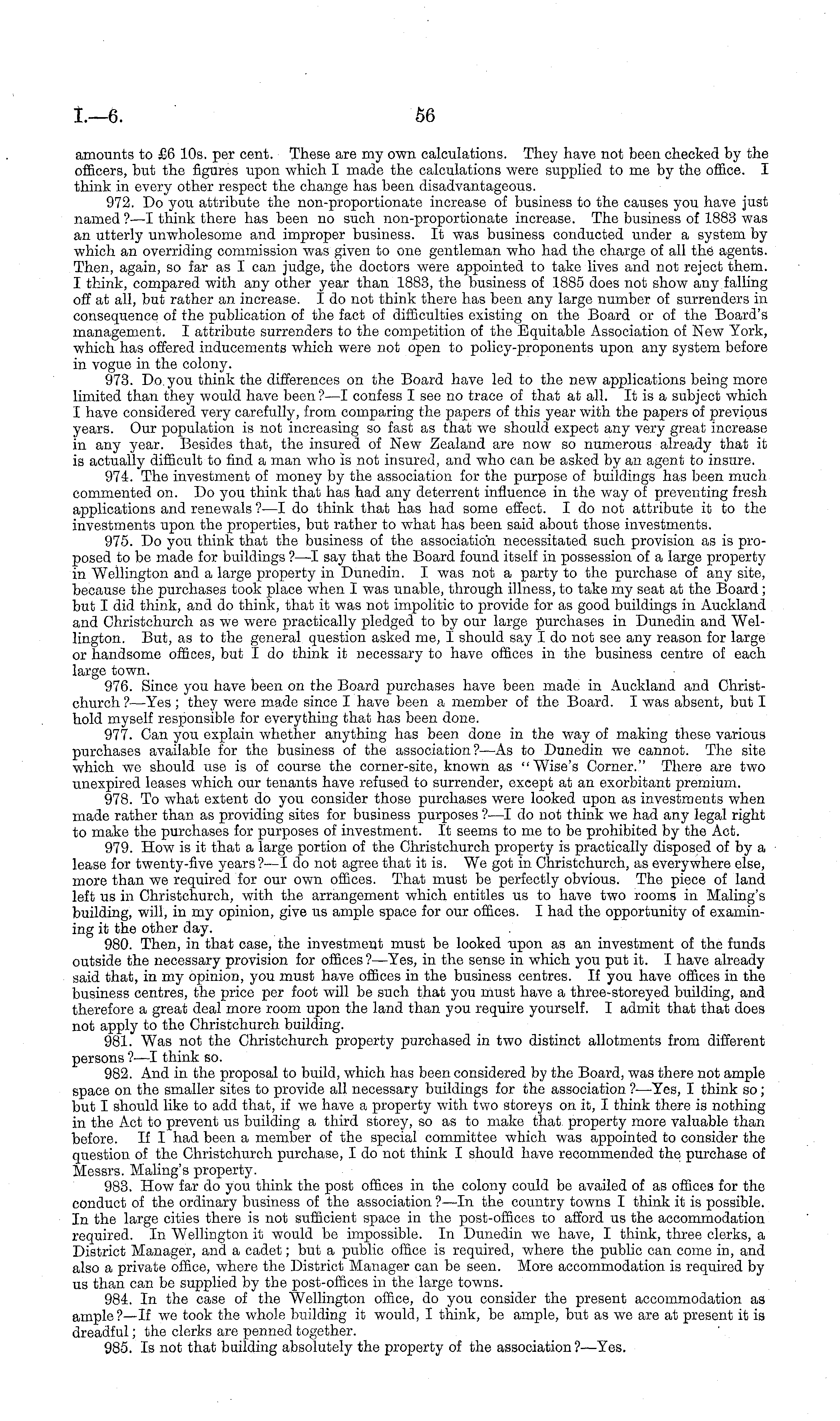 amounts to £6 10s. per cent. These are my own calculations. They have not been checked by the officers, but the figures upon which I made the calculations were supplied to me by the office. I think in every other respect the change has been disadvantageous. 972. Do you attribute the non-proportionate increase of business to the causes you have just named ?—I think there has been no such non-proportionate increase. The business of 1883 was an utterly unwholesome and improper business. It was business conducted under a system by which an overriding commission was given to one gentleman who had the charge of all the agents. Then, again, so far as I can judge, the doctors were appointed to take lives and not reject them. I think, compared with any other year than 1883, the business of 1885 does not show any falling off at all, but rather an increase. Ido not think there has been any large number of surrenders in consequence of the publication of the fact of difficulties existing on the Board or of the Board's management. I attribute surrenders to the competition of the Equitable Association of New York, which has offered inducements which were not open to policy-proponents upon any system before in vogue in the colony. 973. Do. you think the differences on the Board have led to the new applications being more limited than they would have been? —I confess I see no trace of that at all. It is a subject which I have considered very carefully, from comparing the papers of this year with the papers of previous years. Our population is not increasing so fast as that we should expect any very great increase in any year. Besides that, the insured of New Zealand are now so numerous already that it is actually difficult to find a man who is not insured, and who can be asked by an agent to insure. 974. The investment of money by the association for the purpose of buildings has been much commented on. Do you think that has had any deterrent influence in the way of preventing fresh applications and renewals ? —I do think that has had some effect. Ido not attribute it to the investments upon the properties, but rather to what has been said about those investments. 975. Do you think that the business of the association necessitated such provision as is proposed to be made for buildings ?—I say that the Board found itself in possession of a large property in Wellington and a large property in Dunedin. I was not a party to the purchase of any site, because the purchases took place when I was unable, through illness, to take my seat at the Board; but I did think, and do think, that it was not impolitic to provide for as good buildings in Auckland and Christchurch as we were practically pledged to by our large purchases in Dunedin and Wellington. But, as to the general question asked me, I should say Ido not see any reason for large or handsome offices, but 1 do think it necessary to have offices in the business centre of each large town. 976. Since you have been on the Board purchases have been made in Auckland and Christchurch? —Yes ; they were made since I have been a member of the Board. I was absent, but I hold myself responsible for everything that has been done. 977. Can you explain whether anything has been done in the way of making these various purchases available for the business of the association? —As to Dunedin we cannot. The site which wo should use is of course the corner-site, known as "Wise's Corner." There are two unexpired leases which our tenants have refused to surrender, except at an exorbitant premium. 978. To what extent do you consider those purchases were looked upon as investments when made rather than as providing sites for business purposes ?—I do not think we had any legal right to make the purchases for purposes of investment. It seems to me to be prohibited by the Act. 979. How is it that a large portion of the Christchurch property is practically disposed of by a lease for twenty-five years?—l do not agree that it is. We got in Christchurch, as everywhere else, more than we required for our own offices. That must be perfectly obvious. The piece of land left us in Christchurch, with the arrangement which entitles us to have two rooms in Maling's building, will, in my opinion, give us ample space for our offices. I had the opportunity of examining it the other day. 980. Then, in that case, the investment must be looked upon as an investment of the funds outside the necessary provision for offices? —Yes, in the sense in which you put it. I have already said that, in my opinion, you must have offices in the business centres. If you have offices in the business centres, the price per foot will be such that you must have a three-storeyed building, and therefore a great deal more room upon the land than you require yourself. I admit that that does not apply to the Christchurch building. 981. Was not the Christchurch property purchased in two distinct allotments from different persons ?—I think so. 982. And in the proposal to build, which has been considered by the Board, was there not ample space on the smaller sites to provide all necessary buildings for the association ?—Yes, I think so; but I should like to add that, if we have a property with two storeys on it, I think there is nothing in the Act to prevent us building a third storey, so as to make that property more valuable than before. If I had been a member of the special committee which was appointed to consider the question of the Christchurch purchase, I do not think I should have recommended the purchase of Messrs. Maling's property. 983. How far do you think the post offices in the colony could be availed of as offices for the conduct of the ordinary business of the association ?—ln the country towns I think it is possible. In the large cities there is not sufficient space in the post-offices to afford us the accommodation required. In Wellington it would be impossible. In Dunedin we have, I thin