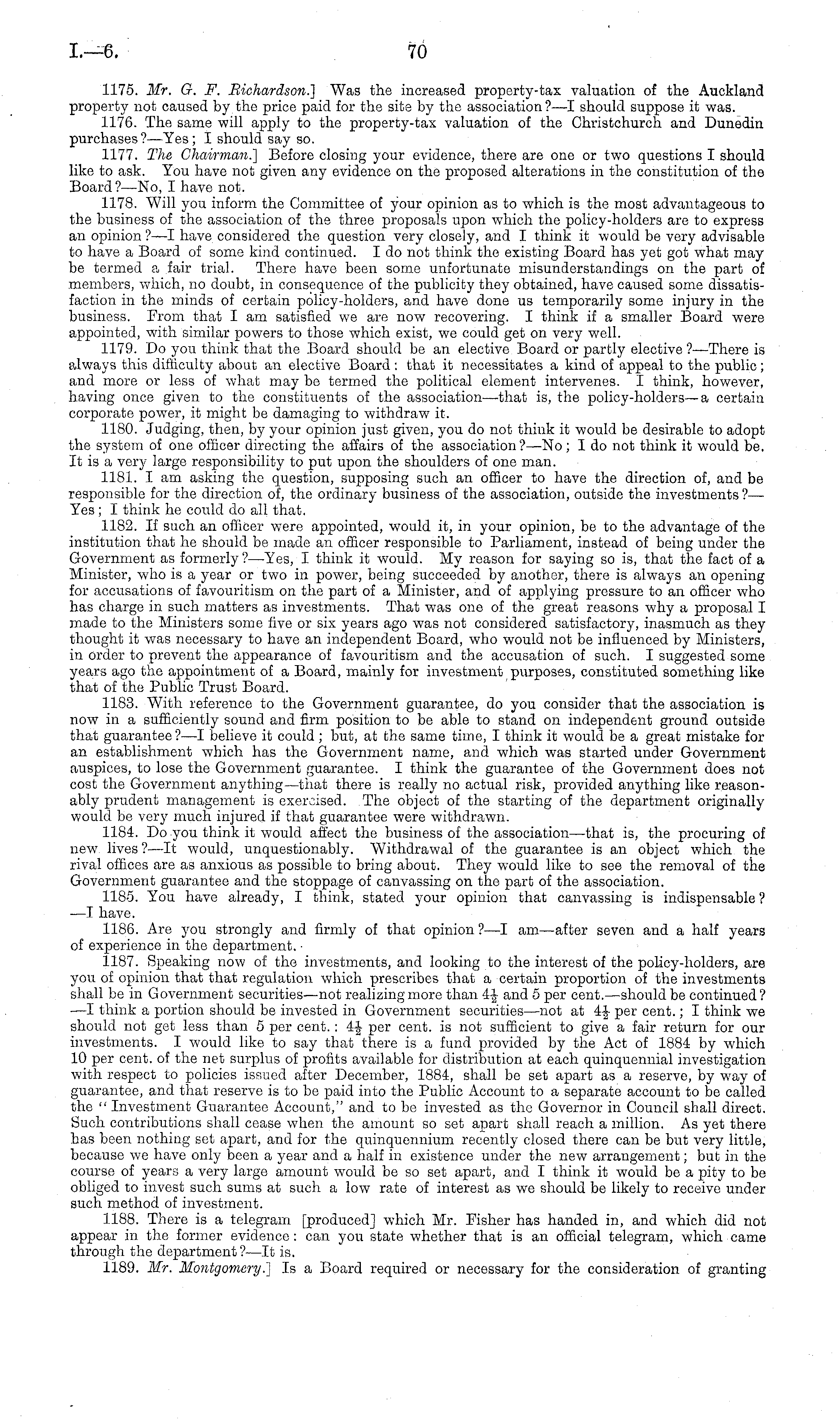 1175. Mr. G. F. Richardson.] Was the increased property-tax valuation of the Auckland property not caused by the price paid for the site by the association?—l should suppose it was. 1176. The same will apply to the property-tax valuation of the Christchurch and Dunedin purchases?— Yes; I should say so. 1177. The Chairman.] Before closing your evidence, there are one or two questions I should like to ask. You have not given any evidence on tho proposed alterations in the constitution of the Board?—No, I have not. 1178. Will you inform the Committee of your opinion as to which is the most advantageous to the business of the association of the three proposals upon which the policy-holders are to express an opinion ?—I have considered the question very closely, and I think it would be very advisable to have a Board of some kind continued. Ido not think the existing Board has yet got what may be termed a fair trial. There have been some unfortunate misunderstandings on the part of members, which, no doubt, in consequence of the publicity they obtained, have caused some dissatisfaction in the minds of certain policy-holders, and have done us temporarily some injury in the business. From that I am satisfied we are now recovering. I think if a smaller Board were appointed, with similar powers to those which exist, we could get on very well. 1179. Do you think that the Board should be an elective Board or partly elective ?—There is always this difficulty about an elective Board: that it necessitates a kind of appeal to the public ; and more or less of what may be termed the political element intervenes. I think, however, having once given to the constituents of the association—that is, the policy-holders—a certain corporate power, it might be damaging to withdraw it. 1180. Judging, then, by your opinion just given, you do not think it would be desirable to adopt the system of one officer directing the affairs of the association?—No; I do not think it would be. It is a very large responsibility to put upon the shoulders of one man. 1181. I am asking the question, supposing such an officer to have the direction of, and be responsible for the direction of, the ordinary business of the association, outside the investments ?—■ Yes; I think he could do all that. 1182. If such an officer were appointed, would it, in your opinion, be to the advantage of the institution, that he should be made an officer responsible to Parliament, instead of being under the Government as formerly ?—Yes, I think it would. My reason for saying so is, that the fact of a Minister, who is a year or two in power, being succeeded by another, there is always an opening for accusations of favouritism on the part of a Minister, and of applying pressure to an officer who has charge in such matters as investments. That was one of the great reasons why a proposal I made to the Ministers some five or six years ago was not considered satisfactory, inasmuch as they thought it was necessary to have an independent Board, who would not be influenced by Ministers, in order to prevent the appearance of favouritism and the accusation of such. I suggested some years ago the appointment of a Board, mainly for investment purposes, constituted something like that of the Public Trust Board. 1183. With reference to the Government guarantee, do you consider that the association is now in a sufficiently sound and firm position to be able to stand on independent ground outside that guarantee ?—I believe it could ; but, at the same time, I think it would be a great mistake for an establishment which has the Government name, and which was started under Government auspices, to lose the Government guarantee. I think the guarantee of the Government does not cost the Government anything—that there is really no actual risk, provided anything like reasonably prudent management is exercised. The object of the starting of the department originally would be very much injured if that guarantee were withdrawn. 1184. Do you think it would affect the business of the association—that is, the procuring of new lives ?—lt would, unquestionably. Withdrawal of the guarantee is an object which the rival offices are as anxious as possible to bring about. They w-ould like to see the removal of the Government guarantee and the stoppage of canvassing on the part of the association. 1185. You have already, I think, stated your opinion that canvassing is indispensable ? —I have. 1186. Are you strongly and firmly of that opinion ?—I am—after seven and a half years of experience in the department. • 1187. Speaking now of the investments, and looking to the interest of the policy-holders, are you of opinion that that regulation which prescribes that a certain proportion of the investments shall be in Government securities —not realizing more than 4-| and 5 per cent. —should be continued? ■ —I think a portion should be invested in Government securities —not at 4-J- per cent.; I think we should not get less than 5 per cent. : 4J per cent, is not sufficient to give a fair return for our investments. I would like to say that there is a fund provided by the Act of 1884 by which 10 per cent, of the net surplus of profits available for distribution at each quinquennial investigation with respect to policies issued after December, 1884, shall be set apart as a reserve, by w r ay of guarantee, and that reserve is to be paid into the Public Account to a separate account to be called the " Investment Guarantee Account," and to be invested as the Governor in Council shall direct. Such contributions shall cease when the amount so set apart shall reach a million. As yet there has been nothing set apart, and for the quinquennium recently closed there can be but very little, because we have only been a year and a half in existence under the new arrangement; but in the course of years a very large amount would be so set apart, and I think it would be a
