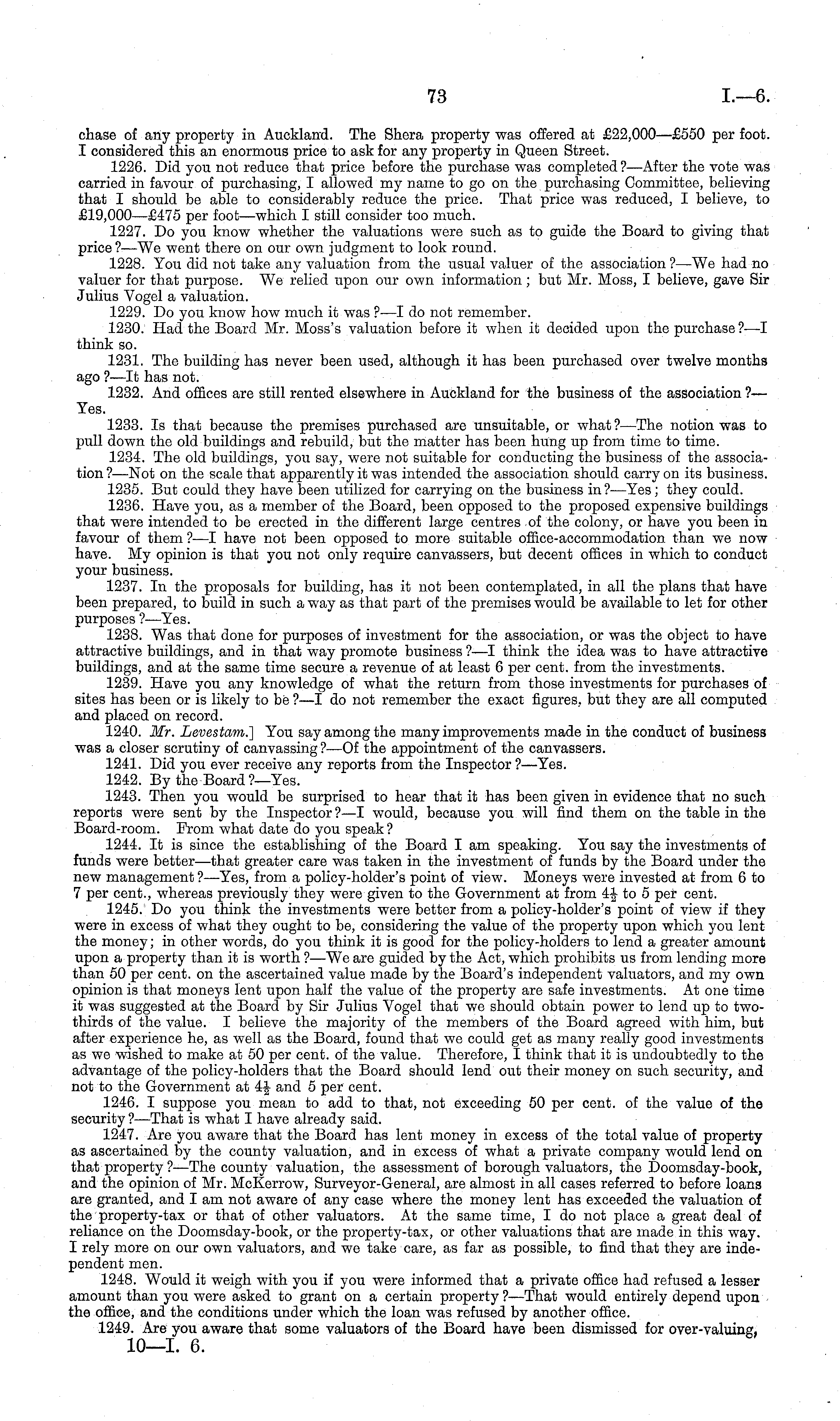 chase of any property in Auckland. The Shera property was offered at £22,000 —£550 per foot. I considered this an enormous price to ask for any property in Queen Street. 1226. Did you not reduce that price before the purchase was completed?— After the vote was carried in favour of purchasing, I allowed my name to go on the purchasing Committee, believing that I should be able to considerably reduce the price. That price was reduced, I believe, to £19,000 —£475 per foot—which I still consider too much. 1227. Do you know whether the valuations were such as to guide the Board to giving that price?—We went there on our own judgment to look round. 1228. You did not take any valuation from the usual valuer of the association ?—We had no valuer for that purpose. We relied upon our own information; but Mr. Moss, I believe, gave Sir Julius Vogel a valuation. 1229. Do you know how much it was ? —I do not remember. 1230. Had the Board Mr. Moss's valuation before it when it decided upon the purchase?—l think so. 1231. The building has never been used, although it has been purchased over twelve months ago ?—lt has not. 1232. And offices are still rented elsewhere in Auckland for the business of the association ?— Yes. 1233. Is that because the premises purchased are unsuitable, or what?— The notion was to pull down the old buildings and rebuild, but the matter has been hung up from time to time. 1234. The old buildings, you say, were not suitable for conducting the business of the association ?—Not on the scale that apparently it was intended the association should carry on its business. 1235. But could they have been utilized for carrying on the business in?— Yes; they could. 1236. Have you, as a member of the Board, been opposed to the proposed expensive buildings that were intended to be erected in the different large centres of the colony, or have you been in favour of them ?—I have not been opposed to more suitable office-accommodation than we now have. My opinion is that you not only require canvassers, but decent offices in which to conduct your business. 1237. In the proposals for building, has it not been contemplated, in all the plans that have been prepared, to build in such a way as that part of the premises would be available to let for other purposes ?—Yes. 1238. Was that done for purposes of investment for the association, or was the object to have attractive buildings, and in that way promote business ?—I think the idea was to have attractive buildings, and at the same time secure a revenue of at least 6 per cent, from the investments. 1239. Have you any knowledge of what the return from those investments for purchases of sites has been or is likely to be ?—I do not remember the exact figures, but they are all computed and placed on record. 1240. Mr. Levestam.] You say among the many improvements made in the conduct of business was a closer scrutiny of canvassing?—Of the appointment of the canvassers. 1241. Did you ever receive any reports from the Inspector ?—Yes. 1242. By the Board ?—Yes. 1243. Then you would be surprised to hear that it has been given in evidence that no such reports were sent by the Inspector ? —I would, because you will find them on the table in the Board-room. From what date do you speak ? 1244. It is since the establishing of the Board lam speaking. You say the investments of funds were better—that greater care was taken in the investment of funds by the Board under the new management ?—Yes, from a policy-holder's point of view. Moneys were invested at from 6to 7 per cent., whereas previously they were given to the Government at from 4-| to 5 per cent. 1245. Do you think the investments were better from a policy-holder's point of view if they were in excess of what they ought to be, considering the value of the property upon which you lent the money; in other words, do you think it is good for the policy-holders to lend a greater amount upon a property than it is worth ?—We are guided by the Act, which prohibits us from lending more than 50 per cent, on the ascertained value made by the Board's independent valuators, and my own opinion is that moneys lent upon half the value of the property are safe investments. At one time it was suggested at the Board by Sir Julius Vogel that we should obtain power to lend up to twothirds of the value. I believe the majority of the members of the Board agreed with him, but after experience he, as well as the Board, found that we could get as many really good investments as we wished to make at 50 per cent, of the value. Therefore, I think that it is undoubtedly to the advantage of the policy-holders that the Board should lend out their money on such security, and not to the Government at 4-J and 5 per cent. 1246. I suppose you mean to add to that, not exceeding 50 per cent, of the value of the security ? —That is what I have already said. 1247. Are you aware that the Board has lent money in excess of the total value of property as ascertained by the county valuation, and in excess of what a private company would lend on that property ? —The county valuation, the assessment of borough valuators, the Doomsday-book, and the opinion of Mr. McKerrow, Surveyor-General, are almost in all cases referred to before loans are granted, and I am not aware of any case where the money lent has exceeded the valuation of the property-tax or that of other valuators. At the same time, I do not place a great deal of reliance on the Doomsday-book, or the property-tax, or other valuations that are made in this way. I rely more on our own valuators, and we take care, as far as possible, to find that they are independent men. 1248. Would it weigh with you if you were informed that a private office had refused a lesser amount than you were asked to grant on a certain property? —That would entirely depend upon - the office, and the conditions under which the loan was refused by another office. 